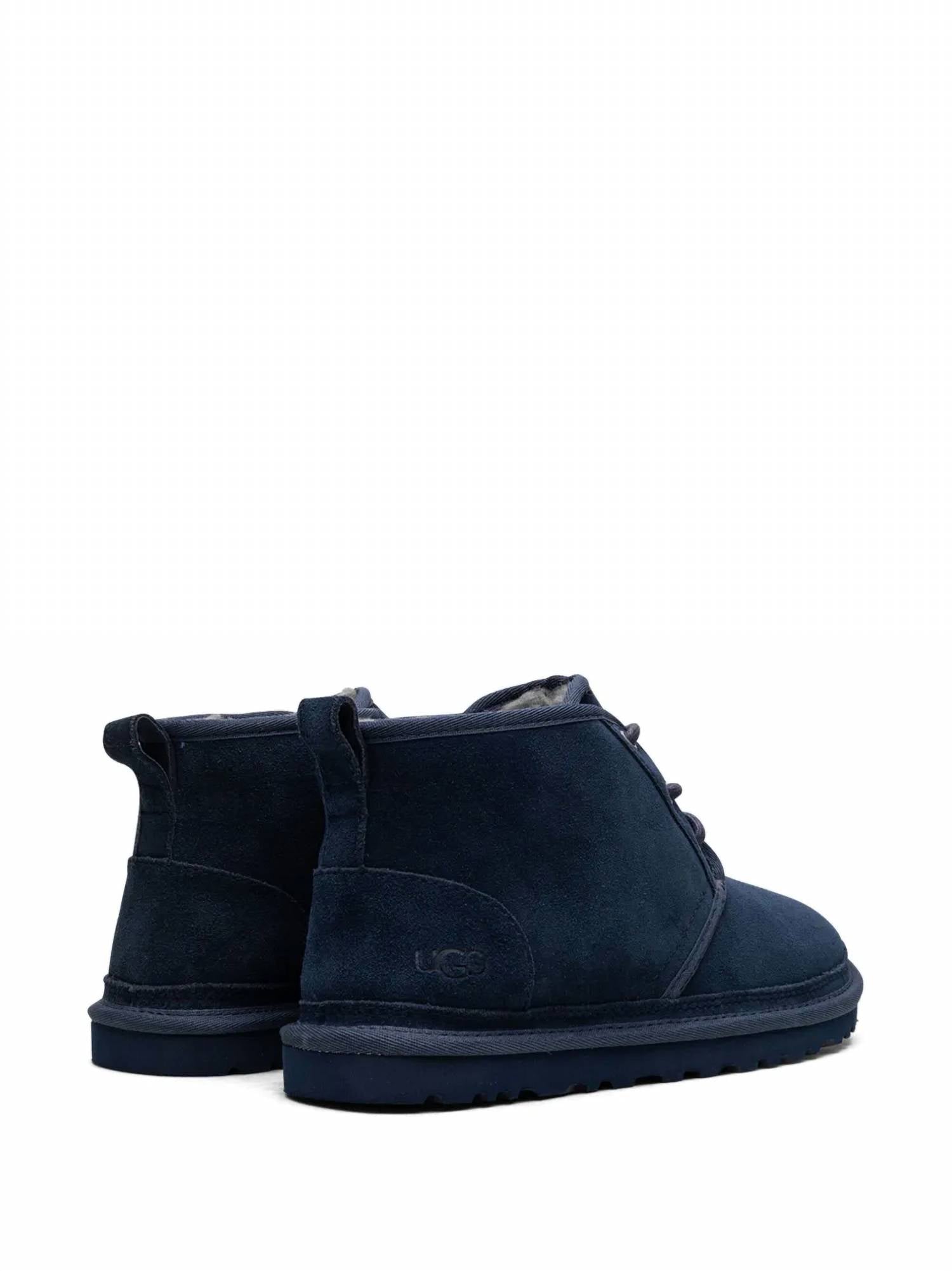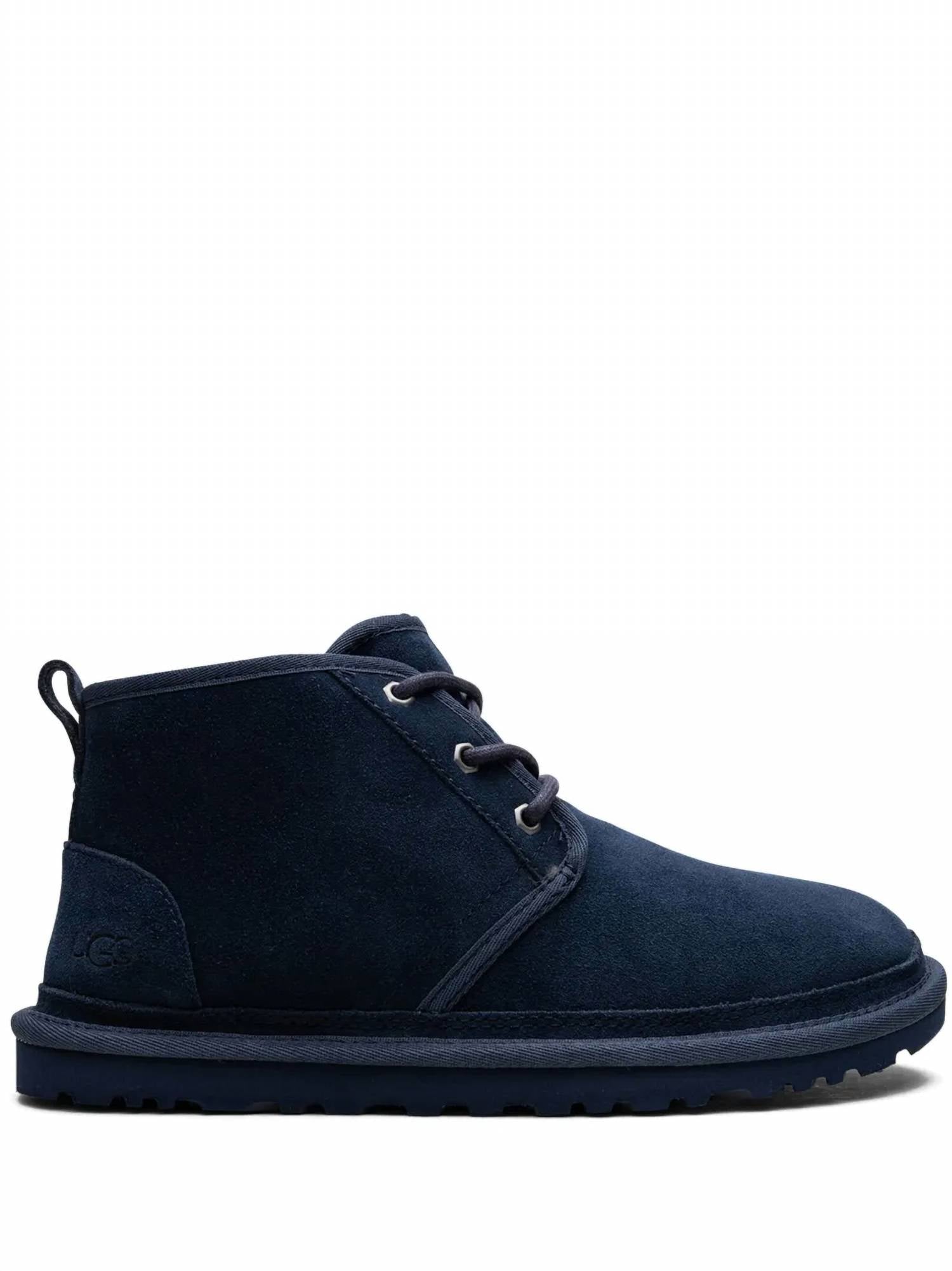 The Men's Neumel Boots by UGG combine style and sustainability in a navy hue. With a suede upper and front lace-up fastening featuring responsible cotton laces, these boots ensure durability and support. They are lined with either 17mm UGGplush™ made from upcycled wool and TENCEL™ Lyocell, accompanied by a foam footbed for comfort. Finished with either a sugarcane EVA outsole or a Treadlite by UGG™ EVA outsole, these boots also feature a pull-tab at the heel for easy wear.