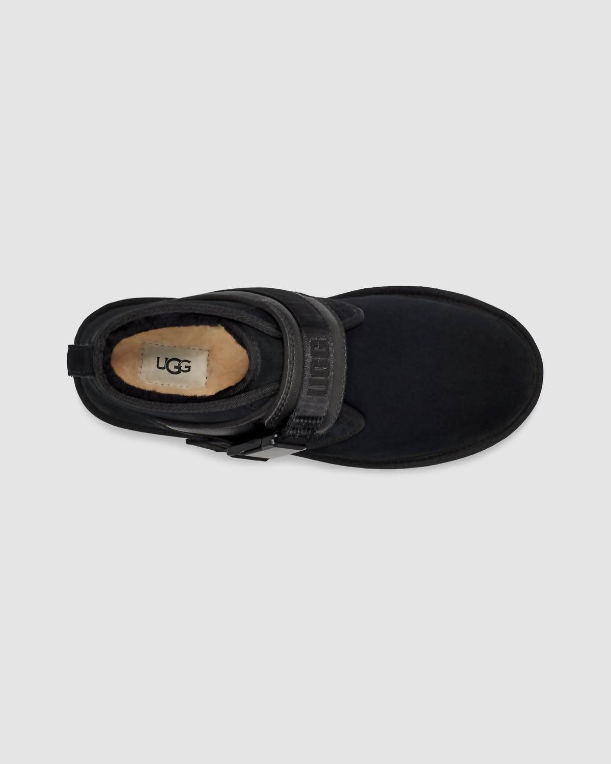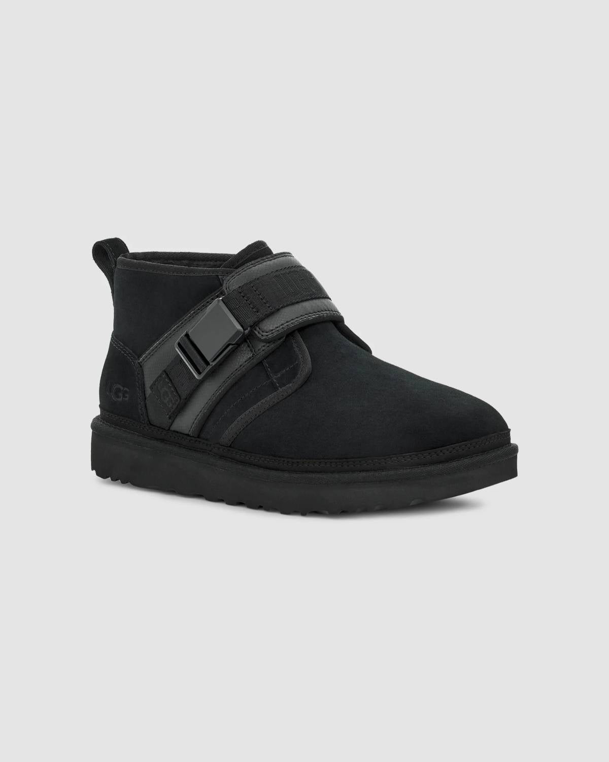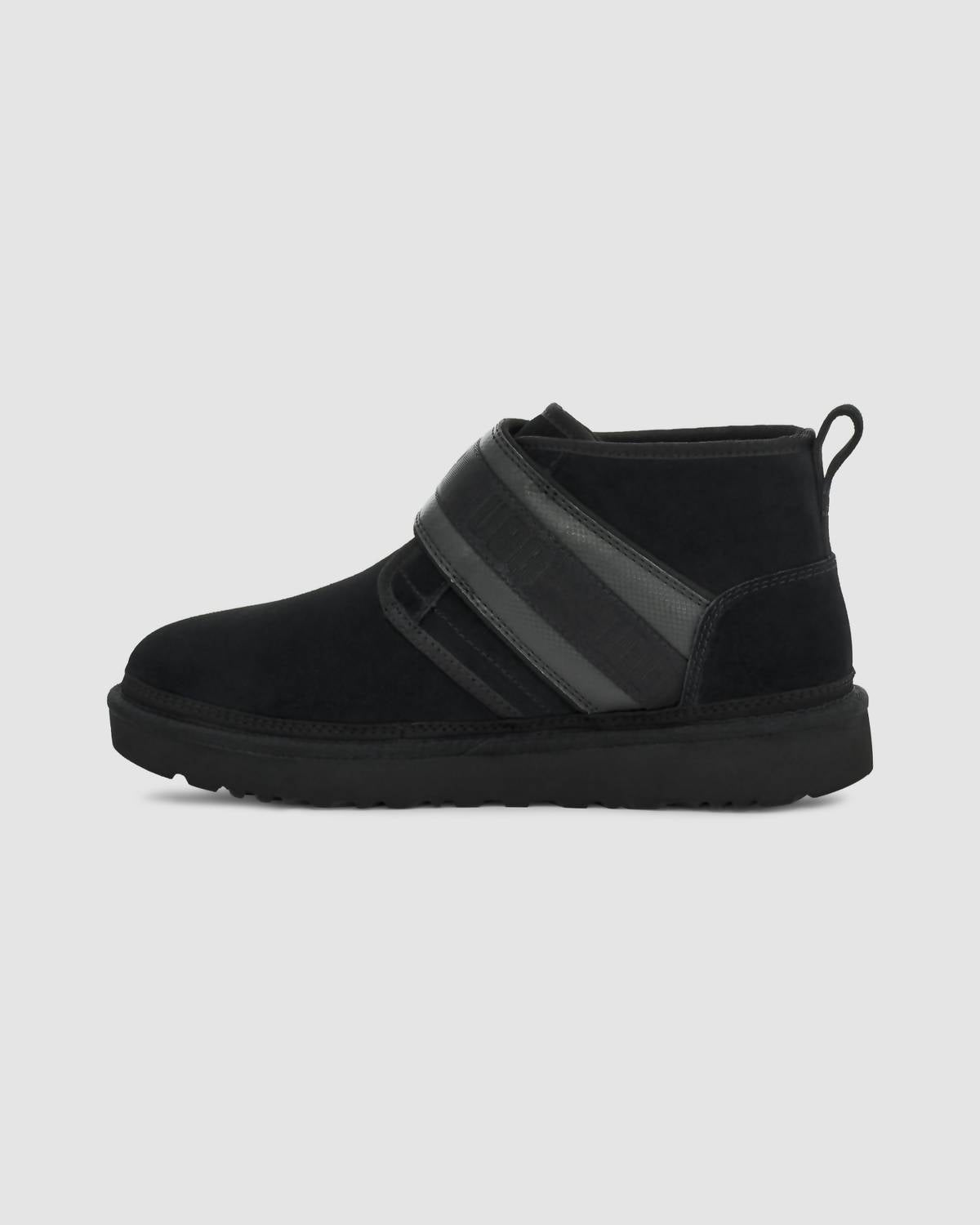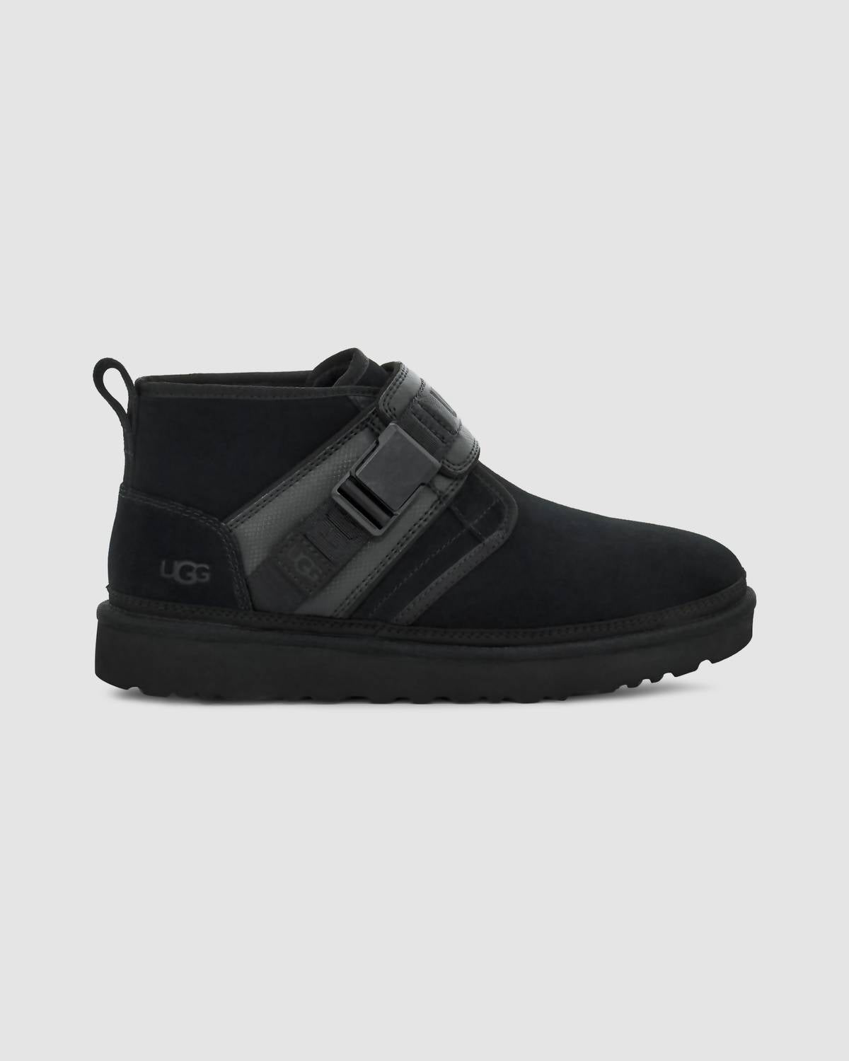 Elevate your footwear collection with the Men's Neumel Snapback Boots by UGG, perfect for the discerning modern man. These black boots boast luxurious sheepskin and 10mm UGGpure™ wool lining for unparalleled comfort and warmth. A suede upper pairs with synthetic overlays and a suede heel counter, while the Treadlite by UGG™ outsole enhances cushioning and traction. Featuring adjustable straps with buckle closure and recycled polyester binding, these boots deliver exceptional style and durability, complete with a heat-embossed UGG® logo.