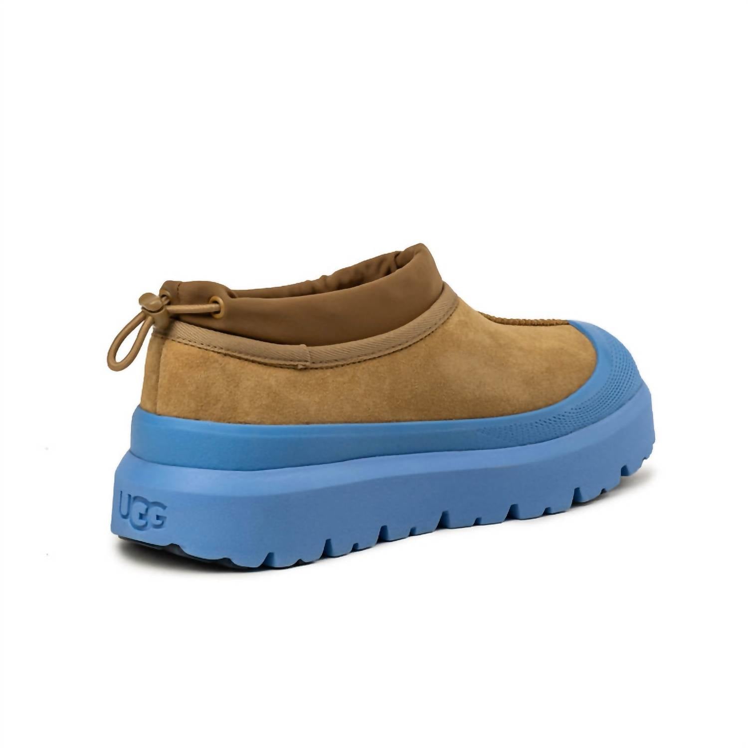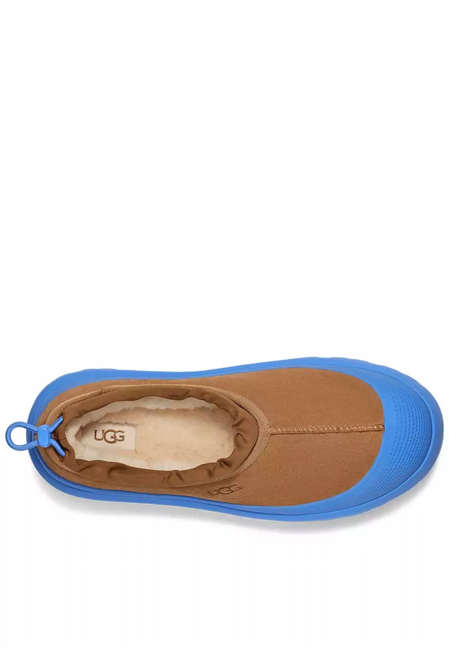 Introducing the Men's Tasman Weather Hybrid Shoes by UGG, crafted in a stylish chestnut/big sky colorway for the modern man. These loafers feature a waterproof suede upper, seam-sealed construction, and an elastic lace closure made from 45% recycled polyester and 55% latex. Lined with 17mm UGGplush™ composed of 60% upcycled wool and 40% TENCEL™ Lyocell, these shoes provide warmth and comfort. The durable design is finished with Spider Rubber® Pods for traction and a Sugarcane EVA outsole, incorporating sustainable materials like a poured PU footbed with at least 50% bio-based content.