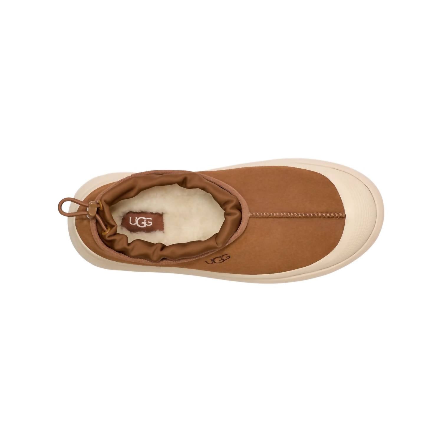 Elevate your outdoor strolls with the Men's Tasman Weather Hybrid Shoes by UGG in Chestnut/White Cap. These shoes boast waterproof suede and seam-sealed construction with cozy 17mm UGGplush™ lining made from 60% upcycled wool and 40% TENCEL™ Lyocell. An elastic lace closure (45% recycled polyester, 55% latex) ensures a snug fit, while the sugarcane-derived EVA outsole and Spider Rubber® Pods deliver excellent traction. Ideal for drizzles, their light slipper feel is complemented by a permanent foam galosh.