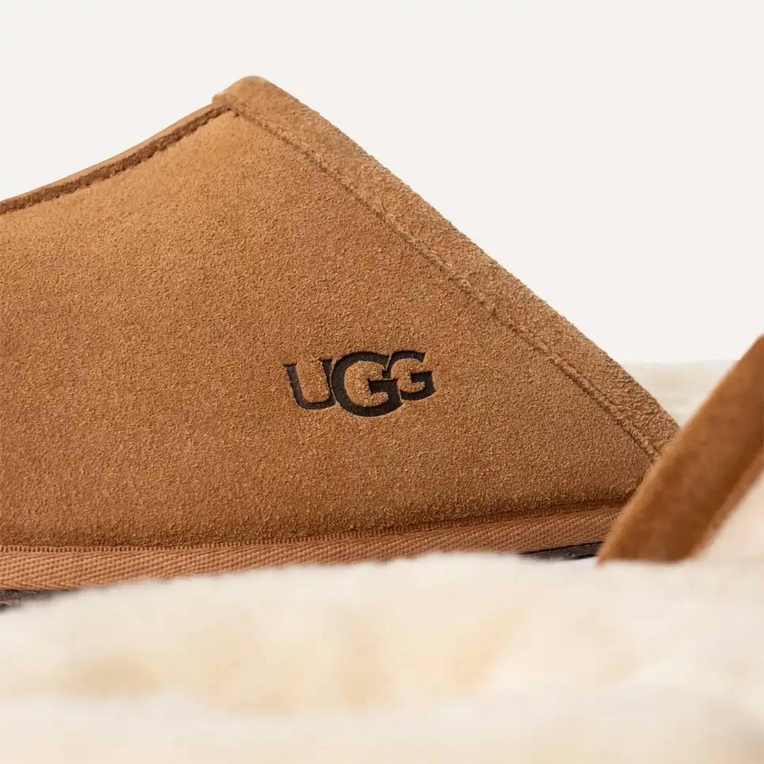 Details Our favorite house slipper is made for me-time and self-care moments, with soft wool lining and an easy slip-on shape. This product was made in a factory that supports women in our supply chain with the help of Reimagining Industry to Support Equality (RISE). This collaborative initiative creates partnerships with brands like ours to empower and educate women in the workplace. Item No. 191142828222 Suede upper 17mm UGGplush™ 80% upcycled wool, 20% TENCEL™ Lyocell vamp lining or 17mm UGGplush™ 60% upcycled wool, 40% TENCEL™ Lyocell vamp lining 17mm sheepskin insole Foam footbed Suede outsole Recycled polyester binding The UGG® Logo, heat-embossed RN 88276 This product contains real fur from sheep or lamb. Fur may be sourced from Australia, Ireland, the United Kingdom, or the United States. It has been artificially dyed and treated.