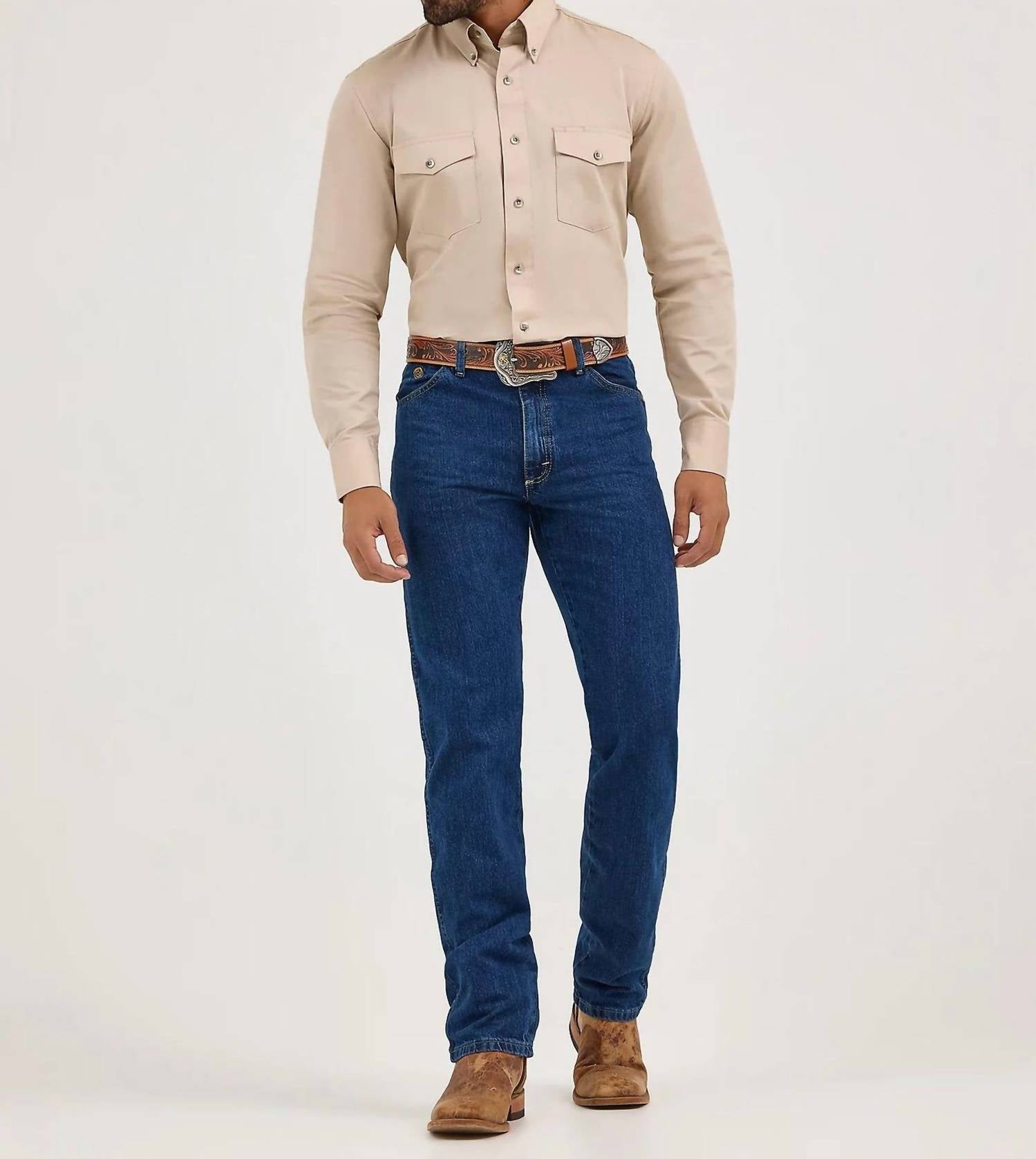 These classic original-fit jeans offer a timeless Western-inspired look, crafted from durable 100% cotton denim weighing 13.75 oz. Designed with a high rise and a comfortable fit, they feature an 11 1/8" front rise, tapered legs, and a 16 3/4" leg opening. Finished with a traditional zip fly and button closure, these jeans are sturdy enough for everyday wear yet stylish enough for a night out.