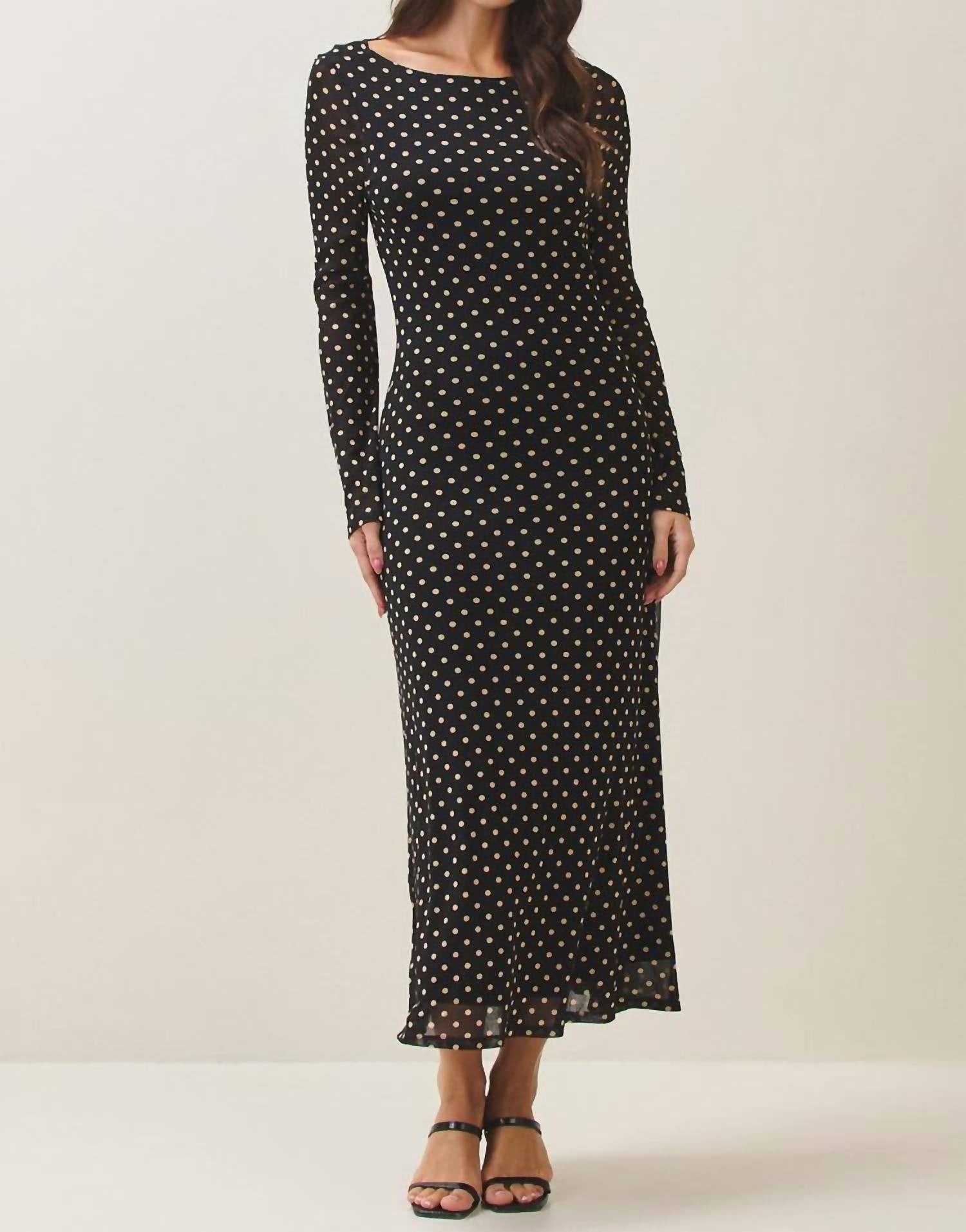 A midi dress so versatile, your options for wearing it are endless. Elevate your evening attire with the Black Polka Dot Midi Dress by ABLE, a sophisticated choice for any fall event. Featuring long sleeves and a graceful boatneck, this dress merges traditional elegance with a contemporary polka dot mesh design. Crafted for a perfect fit, it offers easy wear with a pull-on closure, making it an ideal choice for Thanksgiving gatherings. Embrace quiet luxury this season with a timeless piece that promises understated glamour.