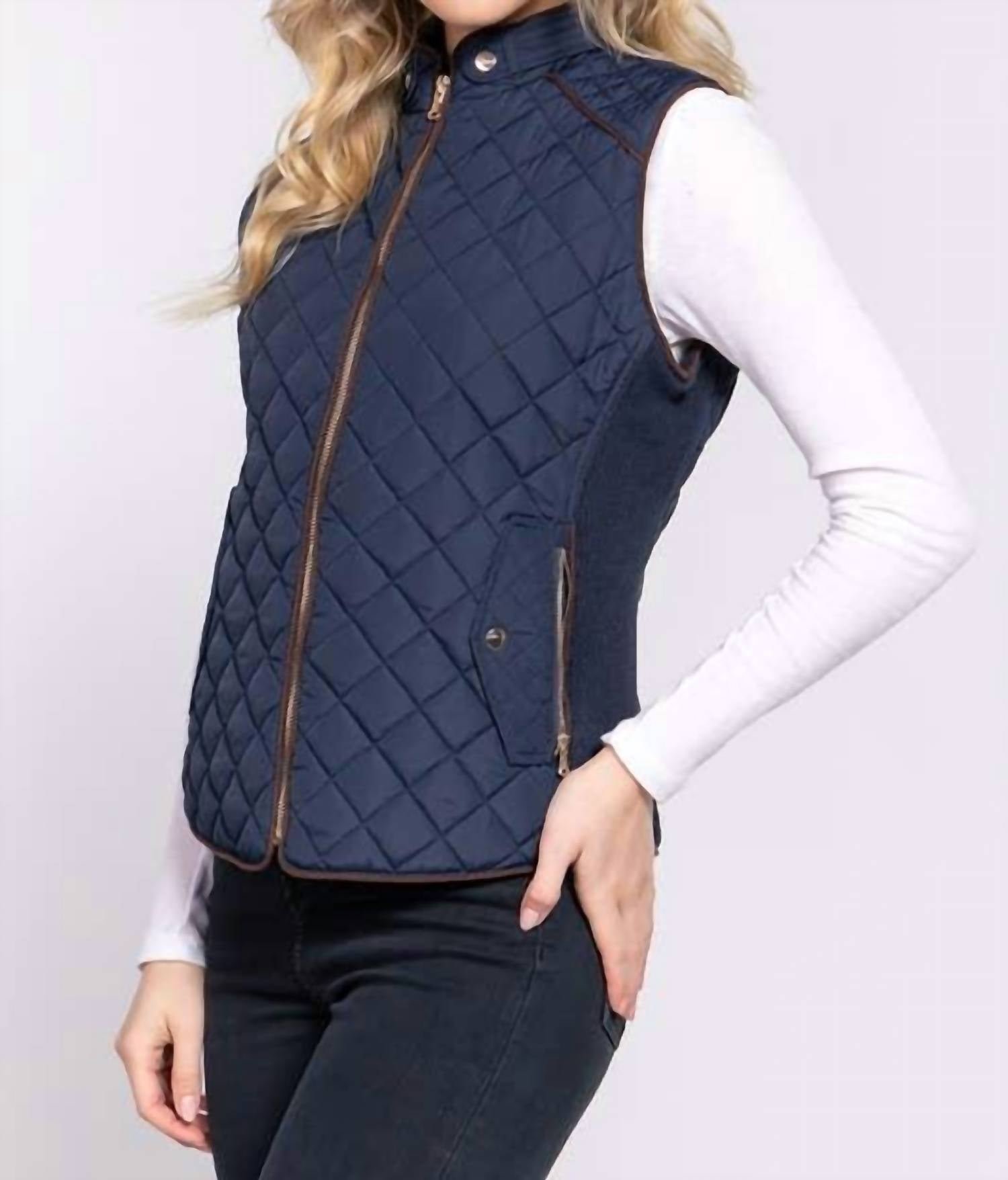 That extra layering piece you didn't know you needed! Introducing the Suede Piping Detail Rib Quilted Vest by Active Basic, perfect for minimalist fall fashion. This sleeveless vest is crafted from 100% polyester with quilted padding and features a stylish suede piping detail. Designed in classic navy, it includes front pockets and a convenient zip closure. Care instructions recommend machine washing and tumble drying for easy maintenance.