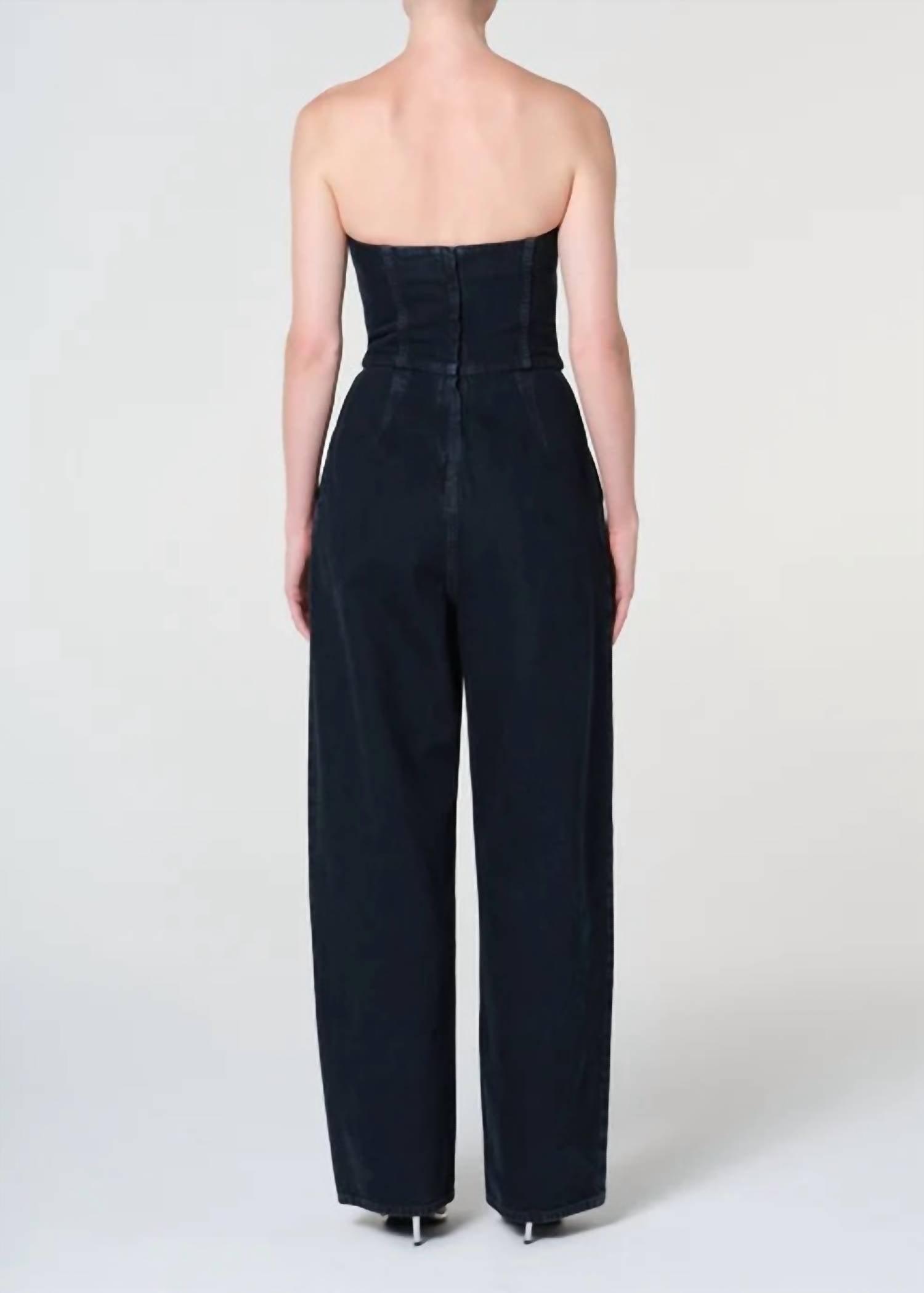 The perfect outfit choice when you you need something quick to throw on and still want to look efforlessly cool. Discover the Agyness Jumpsuit by AGOLDE, a chic strapless piece in deep indigo ideal for making a statement. Crafted from 100% regenerative cotton, this non-stretch jumpsuit is made in Turkey and features a regular fit, high-rise waist, and wide legs, offering a structured silhouette with a modern twist. The jumpsuit's zip closure ensures a sleek finish, while the marbled denim brings added depth to its texture. With a chest measurement of 30" and an inseam of 31.25", it combines comfort and style. Care is easy with machine wash cold instructions and light tumble dry. Model is 5'10" and wears a size small.