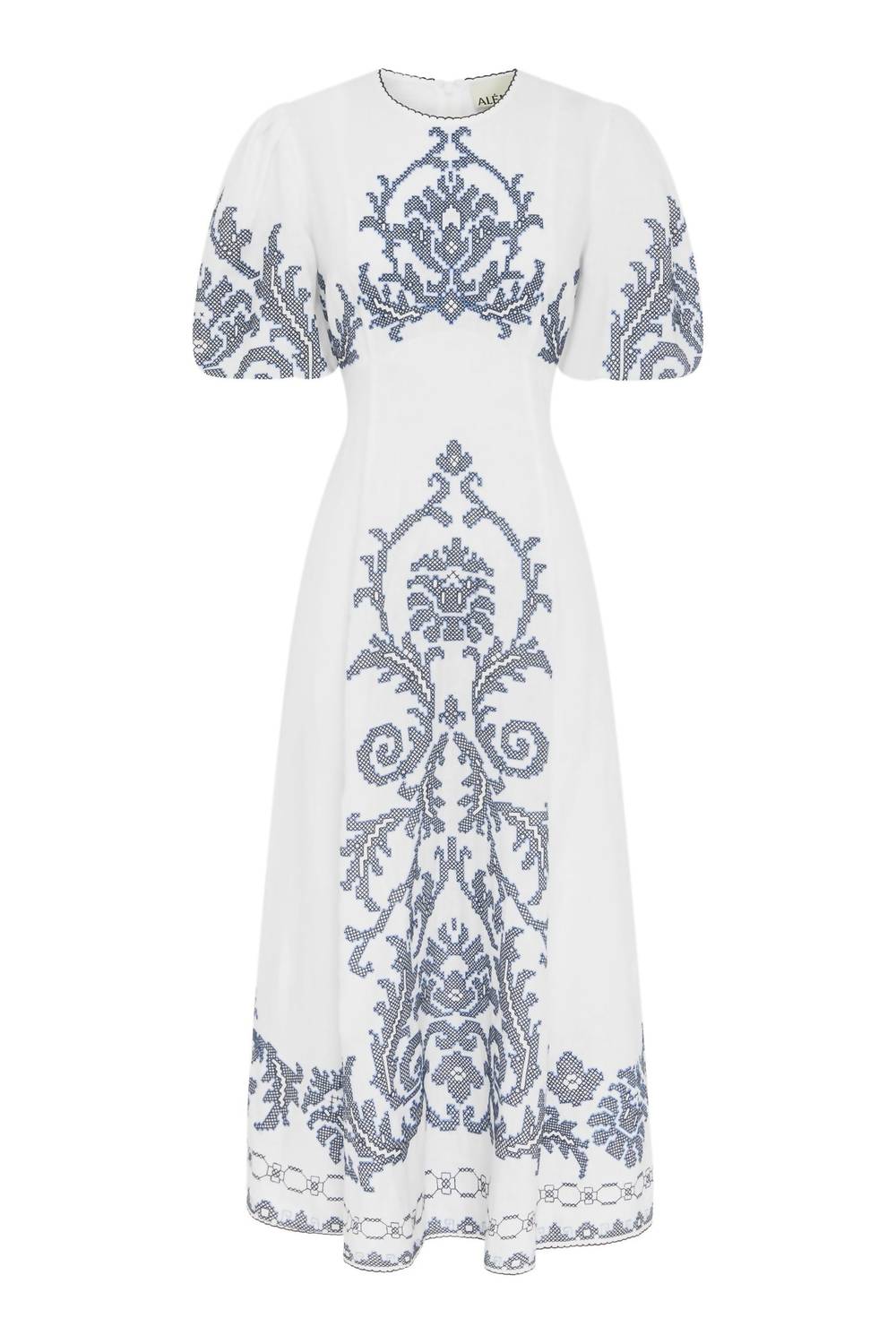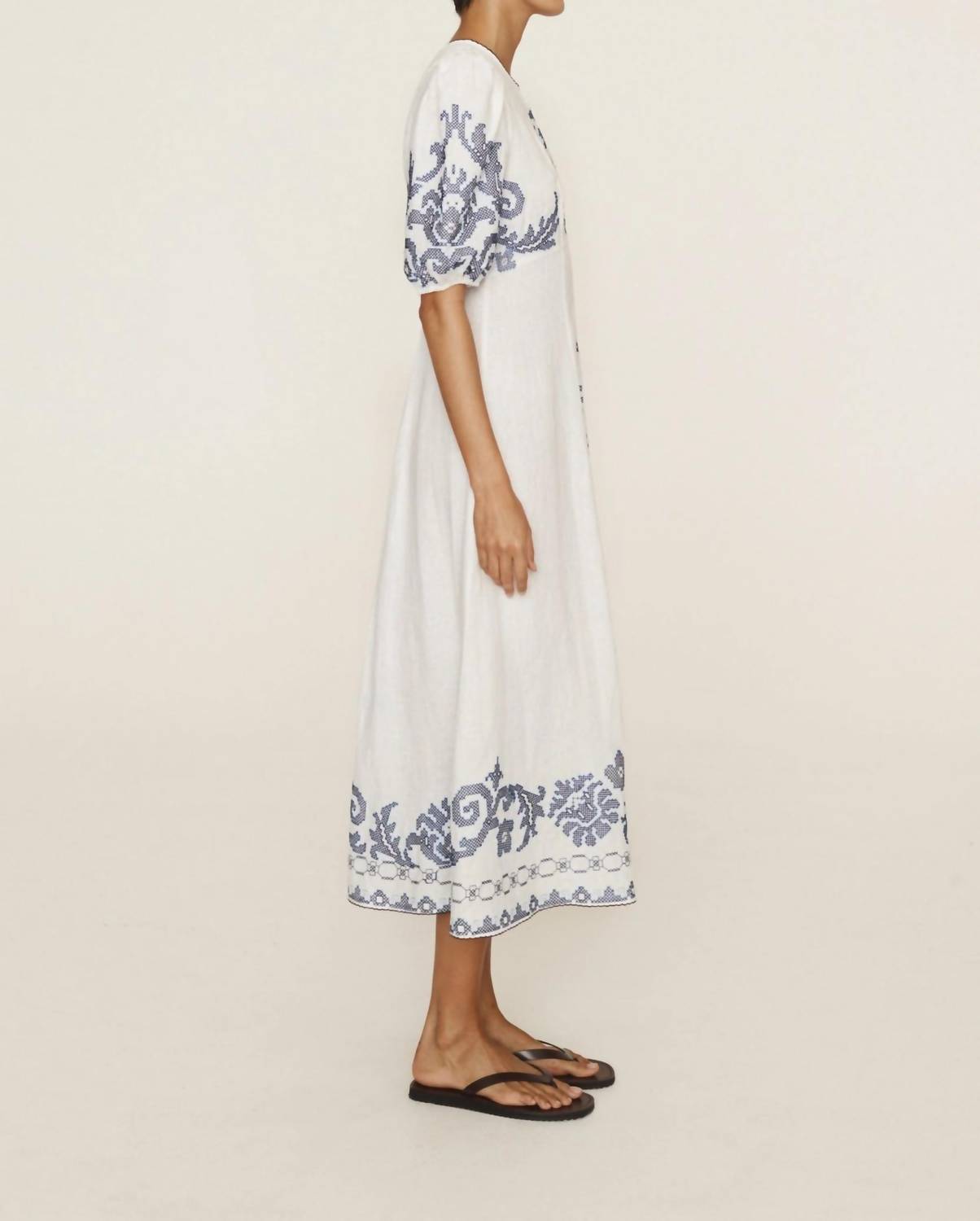 A midi dress so versatile, your options for wearing it are endless. Step into the season with the Hazel Embroidered Midi Dress by ALEMAIS, a stunning creation in timeless white. This short-sleeved dress made from 100% European flax linen features a round neck and exquisite embroidered motif detail. The A-line skirt provides a graceful silhouette, complemented by a side zipper closure for easy wear. Perfect for spring outings, this dress beautifully balances elegance and comfort with its balloon sleeves and elasticated cuffs.