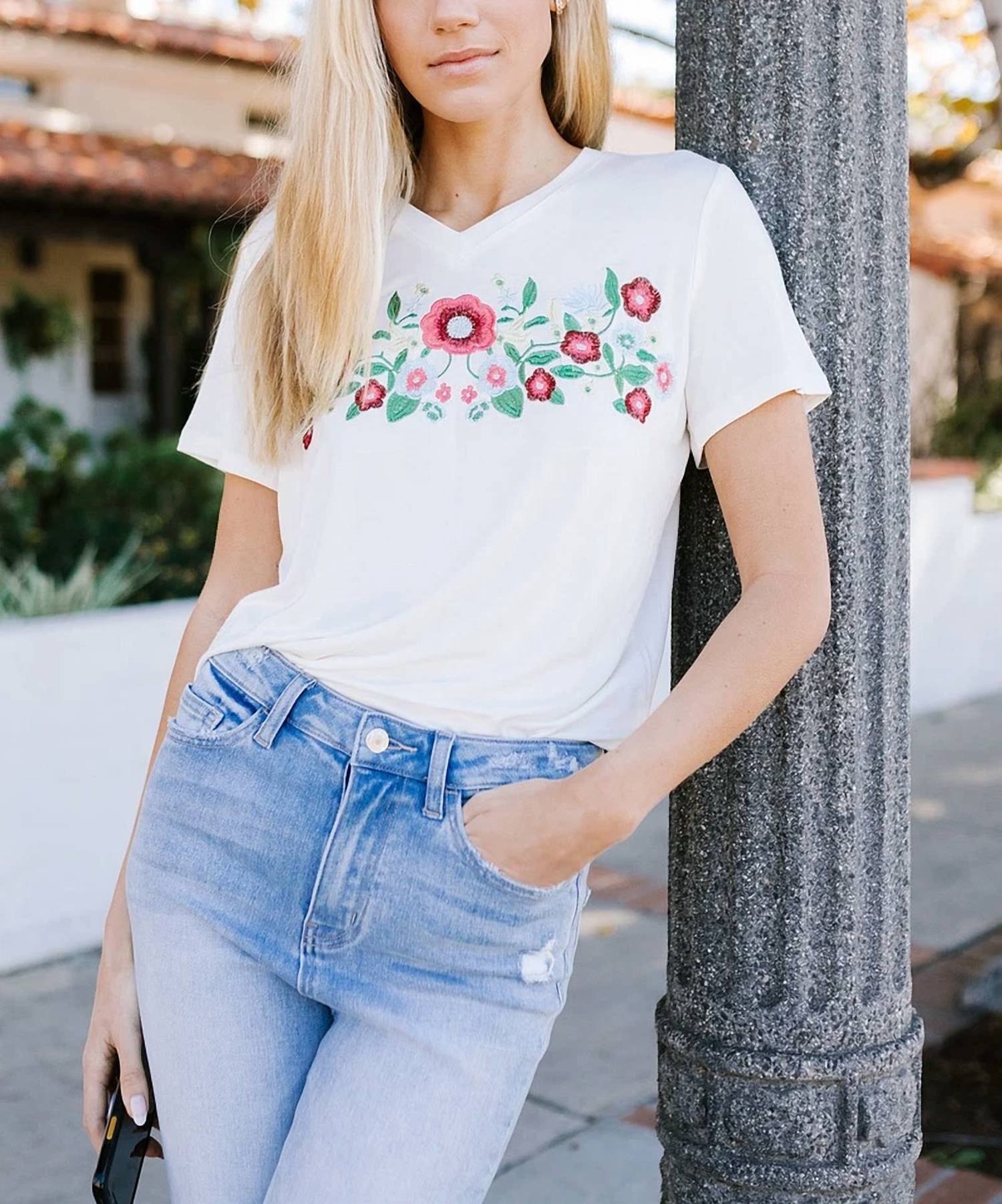 This classic, short sleeve tee will be your go-to staple this season and beyond. The Embroidered Floral Tee by Amaryllis is a chic addition to any summer wardrobe, crafted in a minimalist design for effortless elegance. This women's short-sleeve tee features a V-neckline and a pull-on closure, making it ideal for easy wear during vacations or Thanksgiving festivities. Its floral pattern in a classic white hue adds a touch of sophistication. For care, simply hand wash and line dry to maintain its pristine condition.