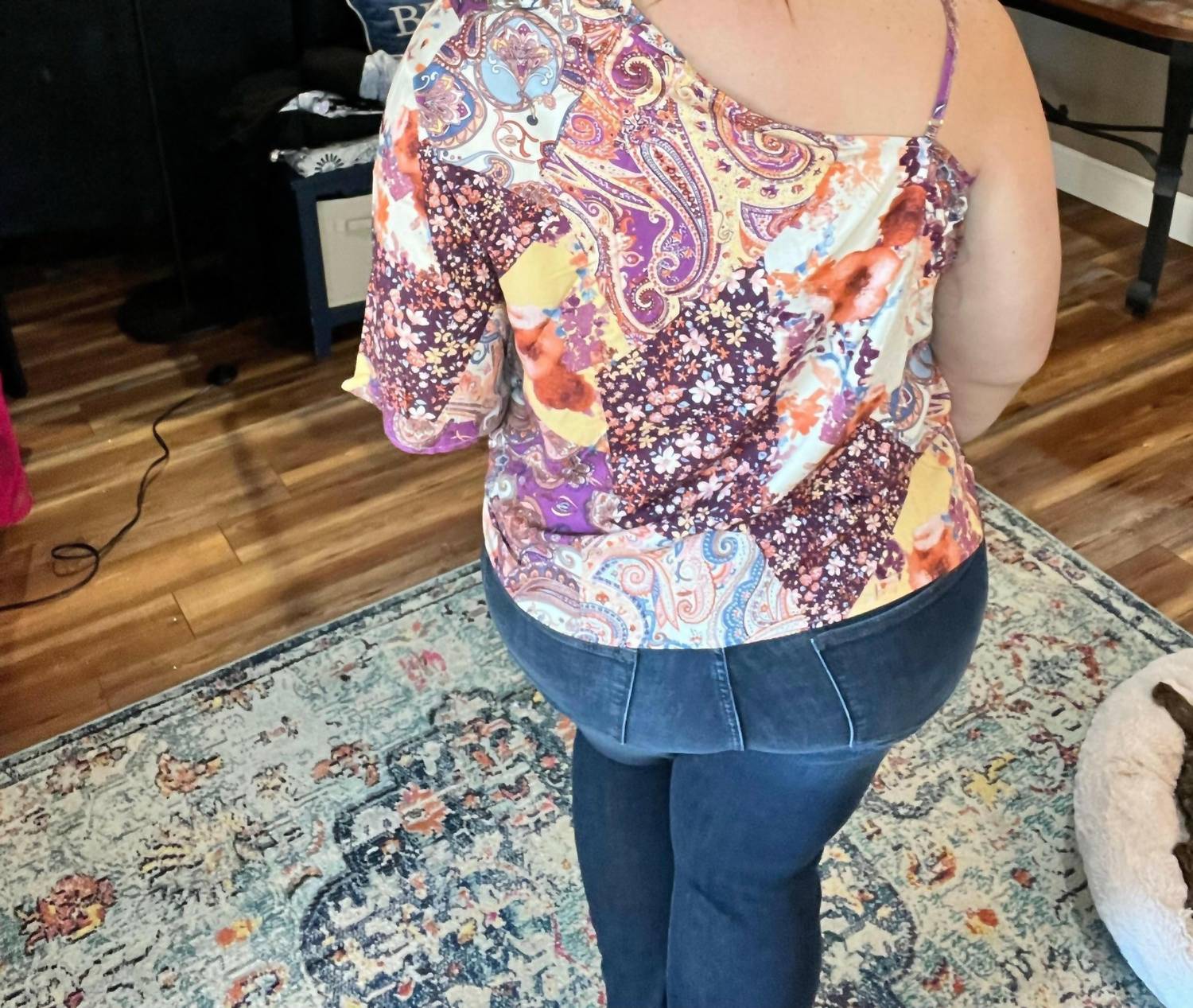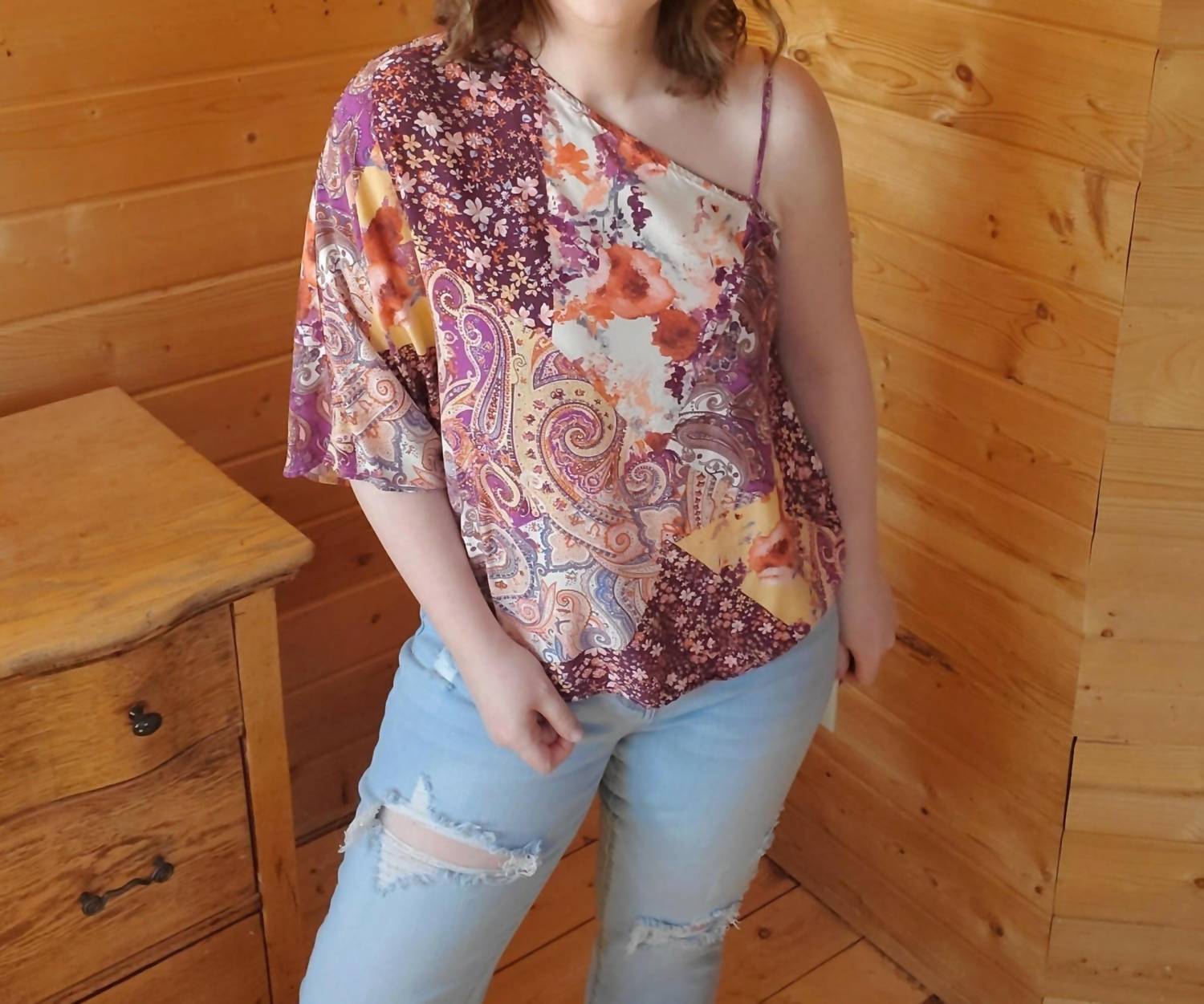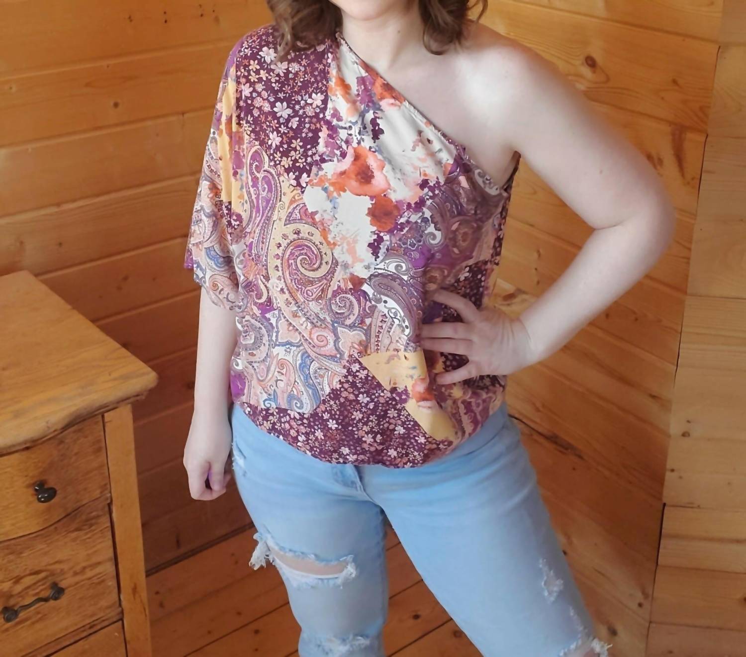 Pair this with your favorite jeans and slides for your next girls night out. Presenting the One Shoulder Dolman Sleeve Top by Andree by Unit, an eye-catching piece in vibrant magenta multi, perfect for your spring holiday party. This sleeveless, off-the-shoulder blouse features a trendy dolman sleeve design for an easy fit. Made from 100% Rayon, it is both non-sheer and woven for a flattering silhouette. Closure: Pull on. Enjoy the blend of playful patterns and 90s fashion.