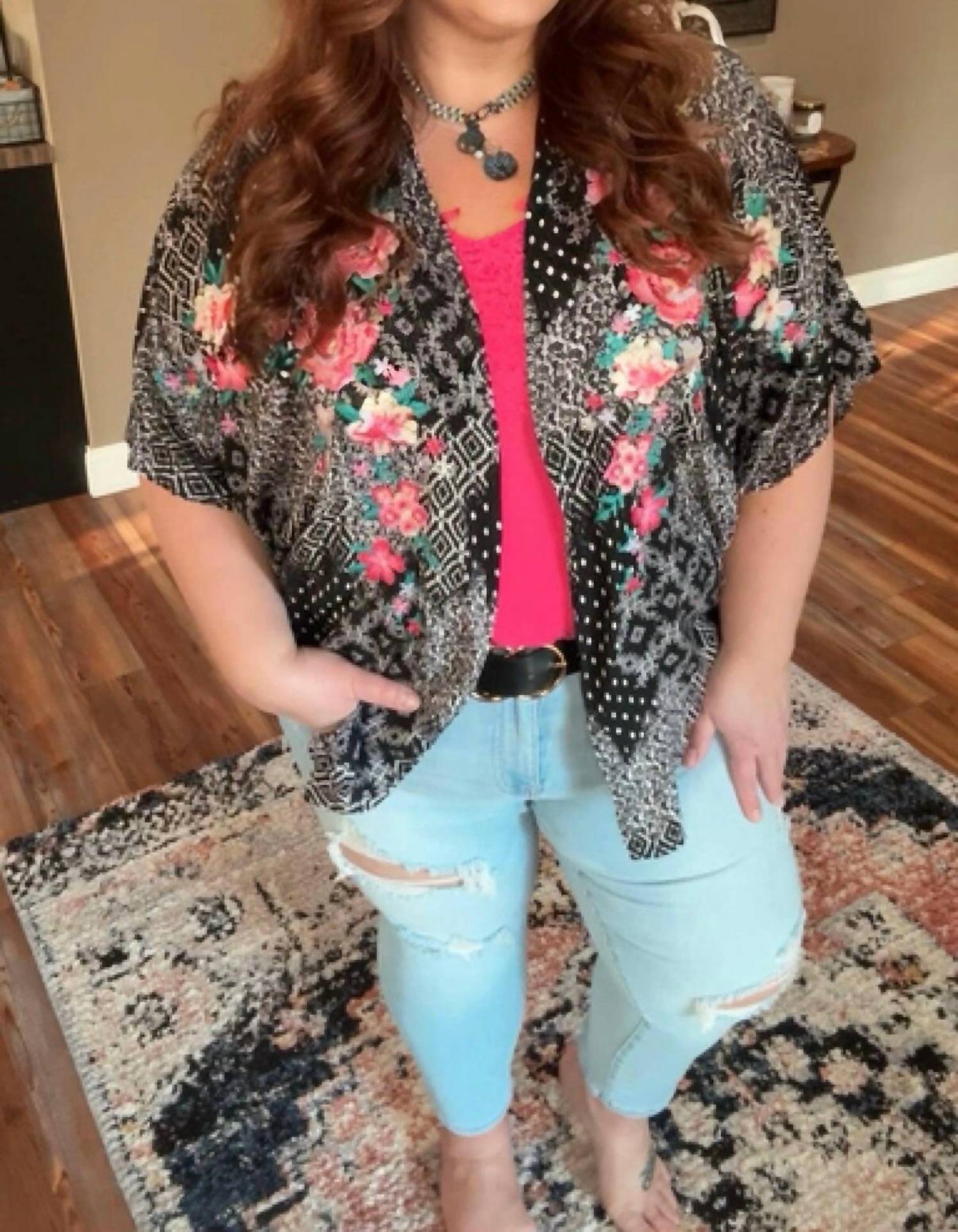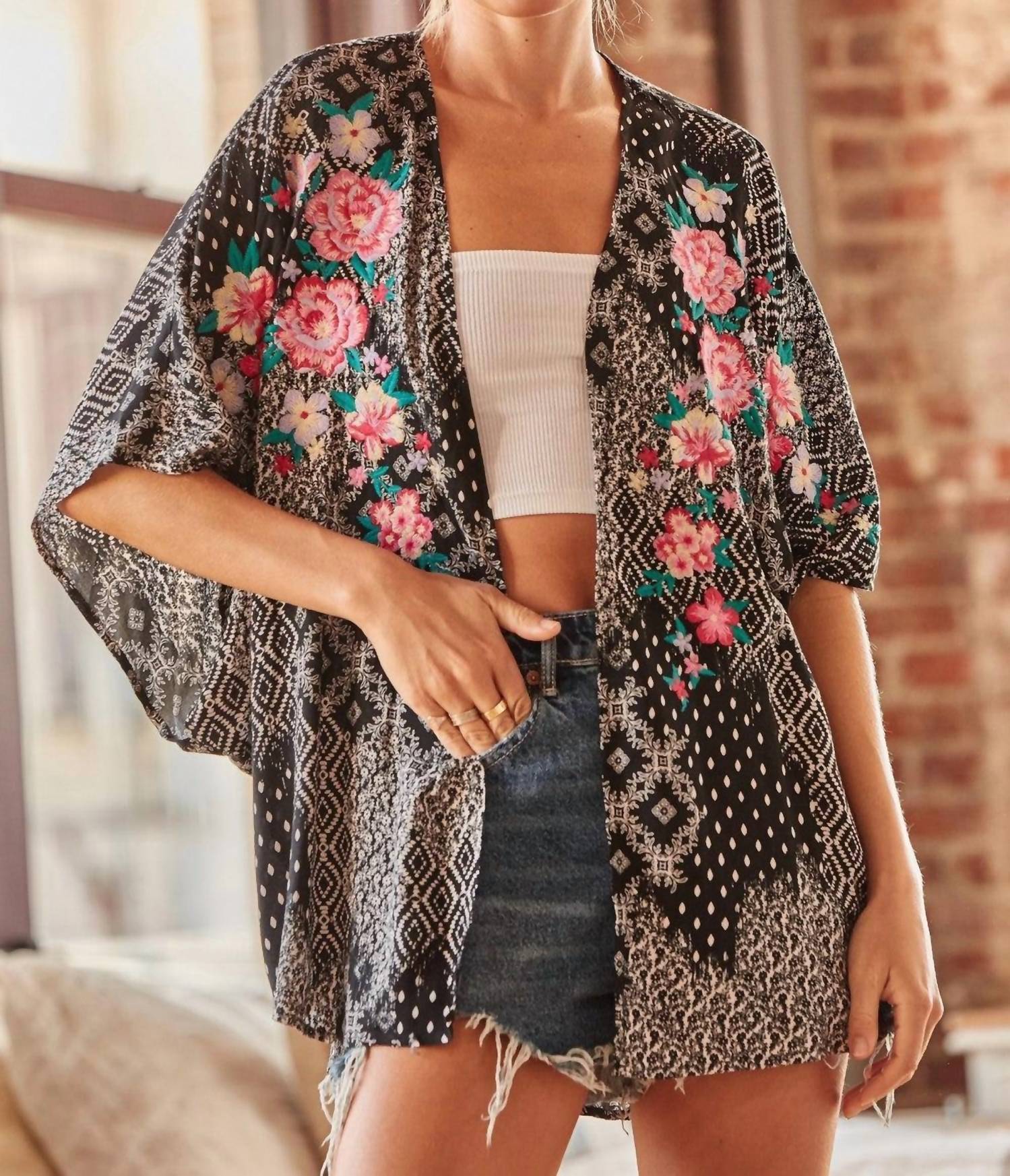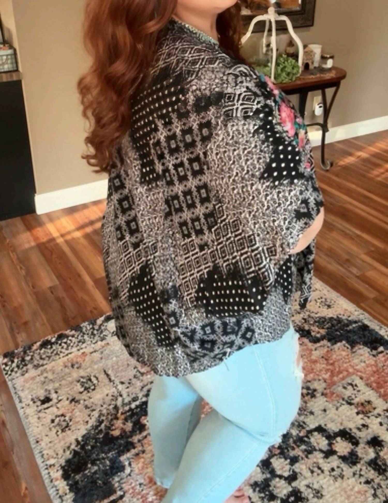 Both classic and versatile with the endless ways you can wear it. Elevate your wardrobe with the Printed Embroidered Kimono by ANDREE BY UNIT, a chic piece in a striking Black Multi pattern. It features kimono sleeves and an open front for a relaxed fit. Crafted from 100% Rayon, this non-sheer, woven cardigan is all about effortless style. Ideal for layering, it’s the perfect wrap for any occasion.