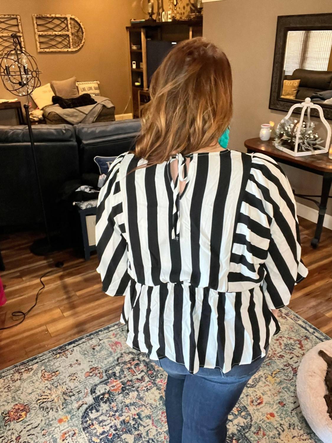 Pair this with your favorite jeans and slides for your next girls night out. Discover the Striped Peplum Top by Andree By Unit, a chic addition to your holiday party wardrobe. This blouse features a crewneck and stylish three-quarter boxy sleeves, enhancing its trendy appeal. Crafted from 100% polyester, the black and white striped design makes it an effortless pull-on piece. Perfectly non-sheer and woven, this top is a spring favorite for a preppy style statement. Enjoy the elegant look without the hassle of pockets or complicating closures.