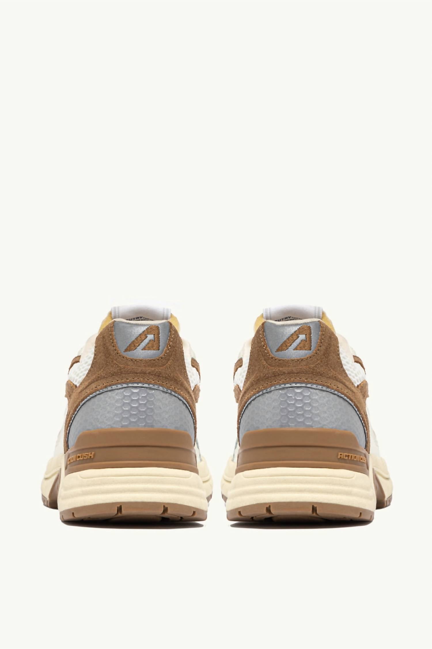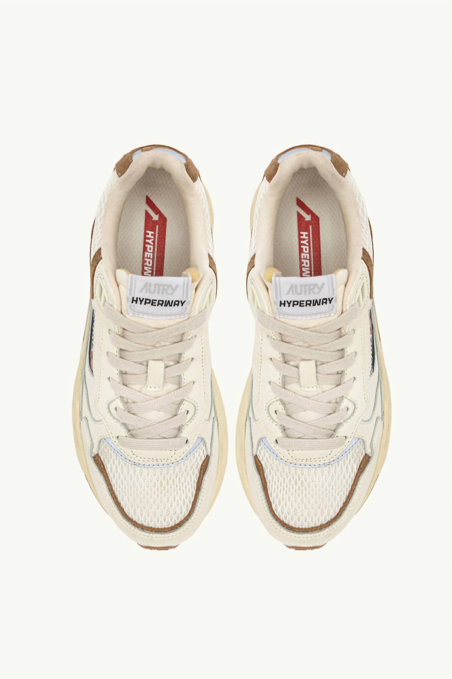When fashion and function come together seamlessly. Step out in style with the Women's Hyperway Low Sneaker from AUTRY, an essential addition to your streetwear collection. These sneakers in a chic ivory and brown colorway feature a round mesh toe, flat cotton laces, and a jacquard logo label for understated elegance. Expertly crafted with an upper made from 65% suede, 20% mesh, and 15% goatskin, complemented by a lining of 70% cotton terry, 15% mesh, 10% nylon, and 5% leather. The sole is an optimal blend of 75% phylis, 15% rubber, and 10% TPR, delivering durability and comfort with a low heel height of 1 1/4"-2".