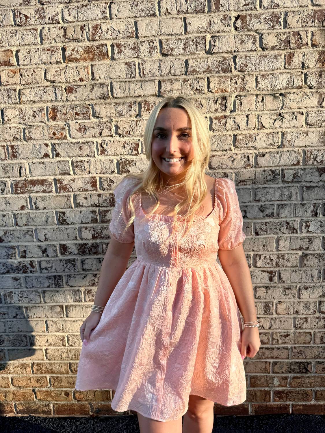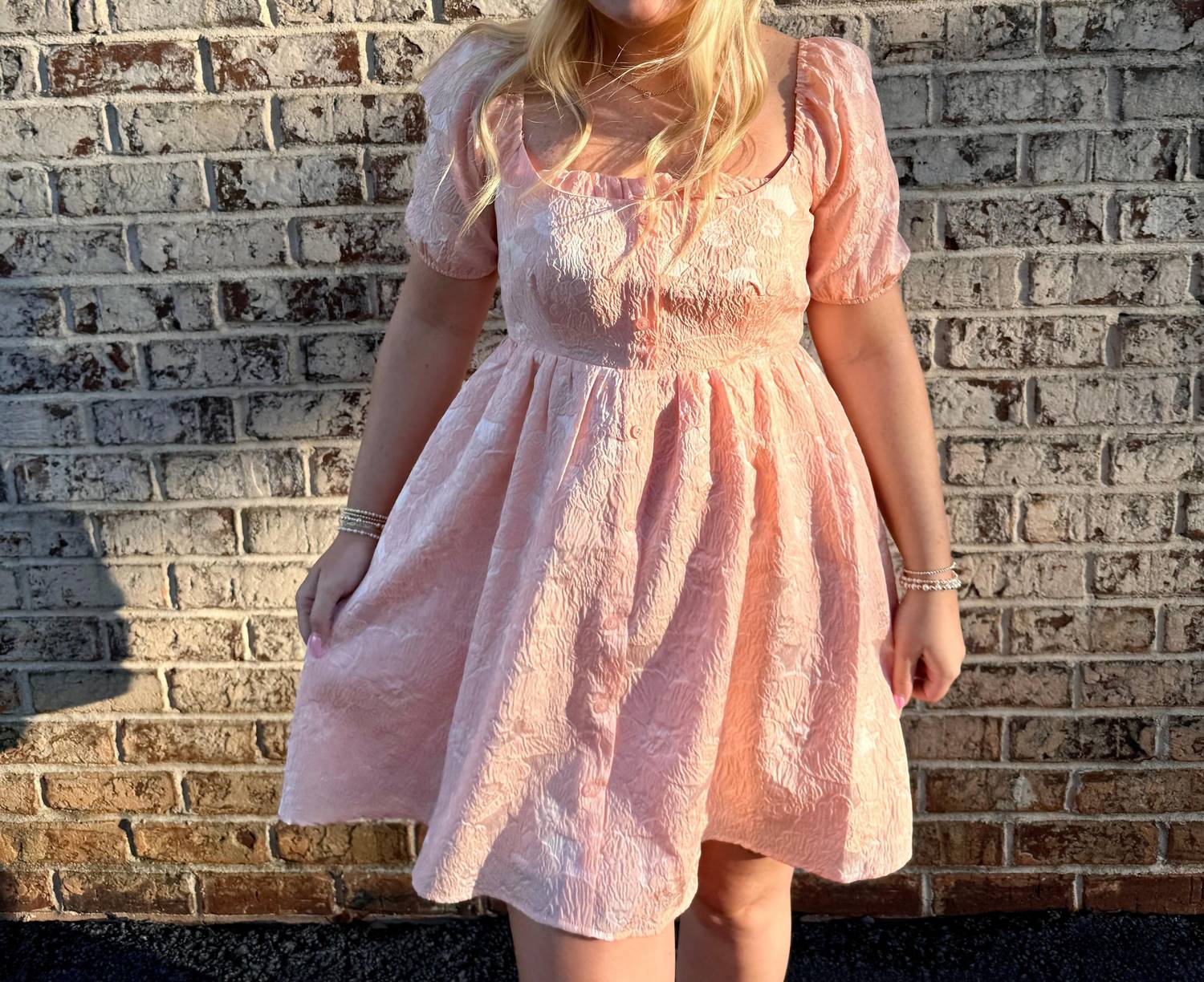 A short and breezy dress for those warmer days. Step into style this winter with the Jacquard Puff Sleeve Mini Dress by B.right, a perfect choice for your boho chic wardrobe. Tailored with short sleeves and a fit and flare silhouette, this patterned mini dress features a fashionable squareneck design in an elegant peach hue. Ideal for women's homecoming events or Christmas celebrations, this piece merges trend-forward elements with a flattering shape. Country of origin and care instructions are not specified.