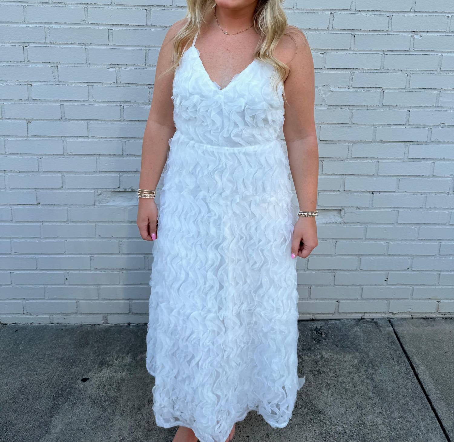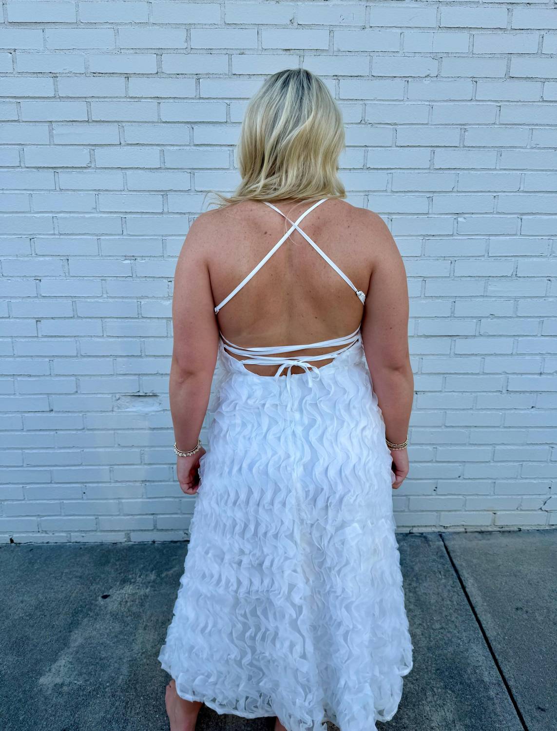 Style this maxi with your favorite statement necklace and sandals for the perfect look. Introducing the Lace Up Floral Maxi Dress by B.right, a sophisticated choice for winter weddings and Christmas holidays. This sleeveless maxi features a slip silhouette with a v-neckline, exuding timeless vintage charm. The solid white color adds an elegant touch, perfect for the occasion. This dress will undoubtedly become a cherished piece in your wardrobe.