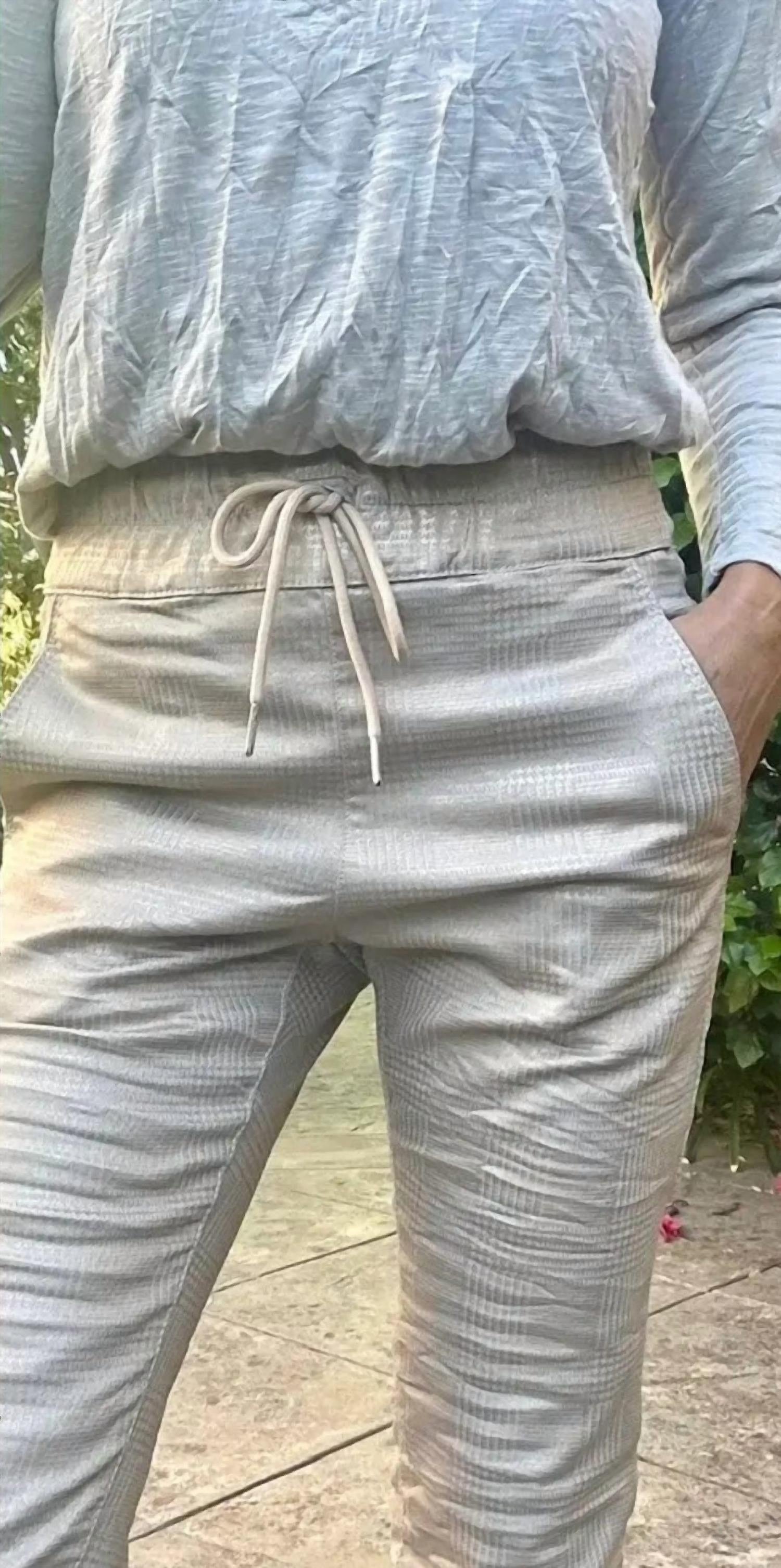 A skinny pant that is both flatering and comfortable. We love this style because it works great with boots, or without! Elevate your vacation style with the Shelly Beige Plaid Pants by BEVY FLOG, designed in a chic gold plaid pattern. These pants boast a high-rise waist with a 10" rise and a 29.5" inseam, promising a slim fit and skinny leg style. Made from a textured cotton blend, they feature convenient pockets and a unique tie closure. Perfect for embracing the Y2K trend this summer, these pants are a versatile addition to any woman's wardrobe.