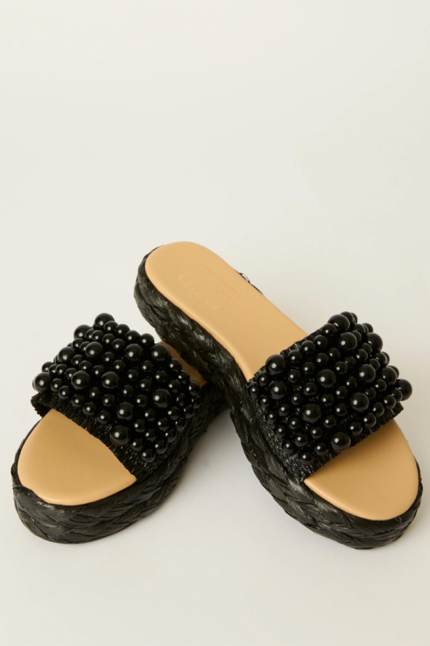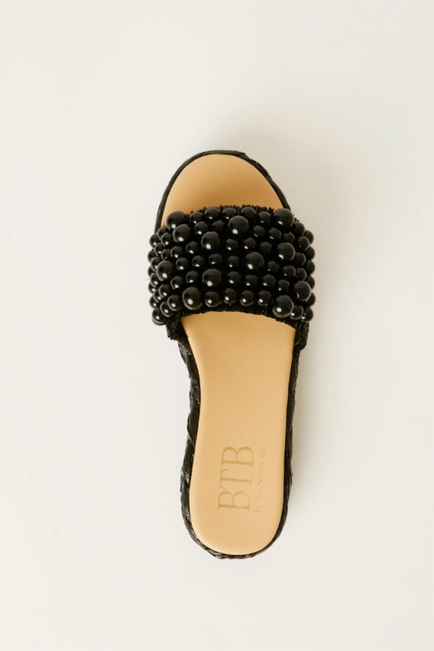 Flowy dresses, cropped pants, and even jumpsuits... this sandal works with them all! Experience effortless elegance with the Women's Milos Pearl Espadrille Sandal by BTB Los Angeles. These black, open toe sandals feature lustrous pearl accents, adding a touch of sophistication to your summer wardrobe. Designed with a flat heel and a low heel height of 1 1/4"-2", they embody a boho chic trend perfect for vacation occasions. Ideal for women seeking a stylish yet comfortable option this summer.