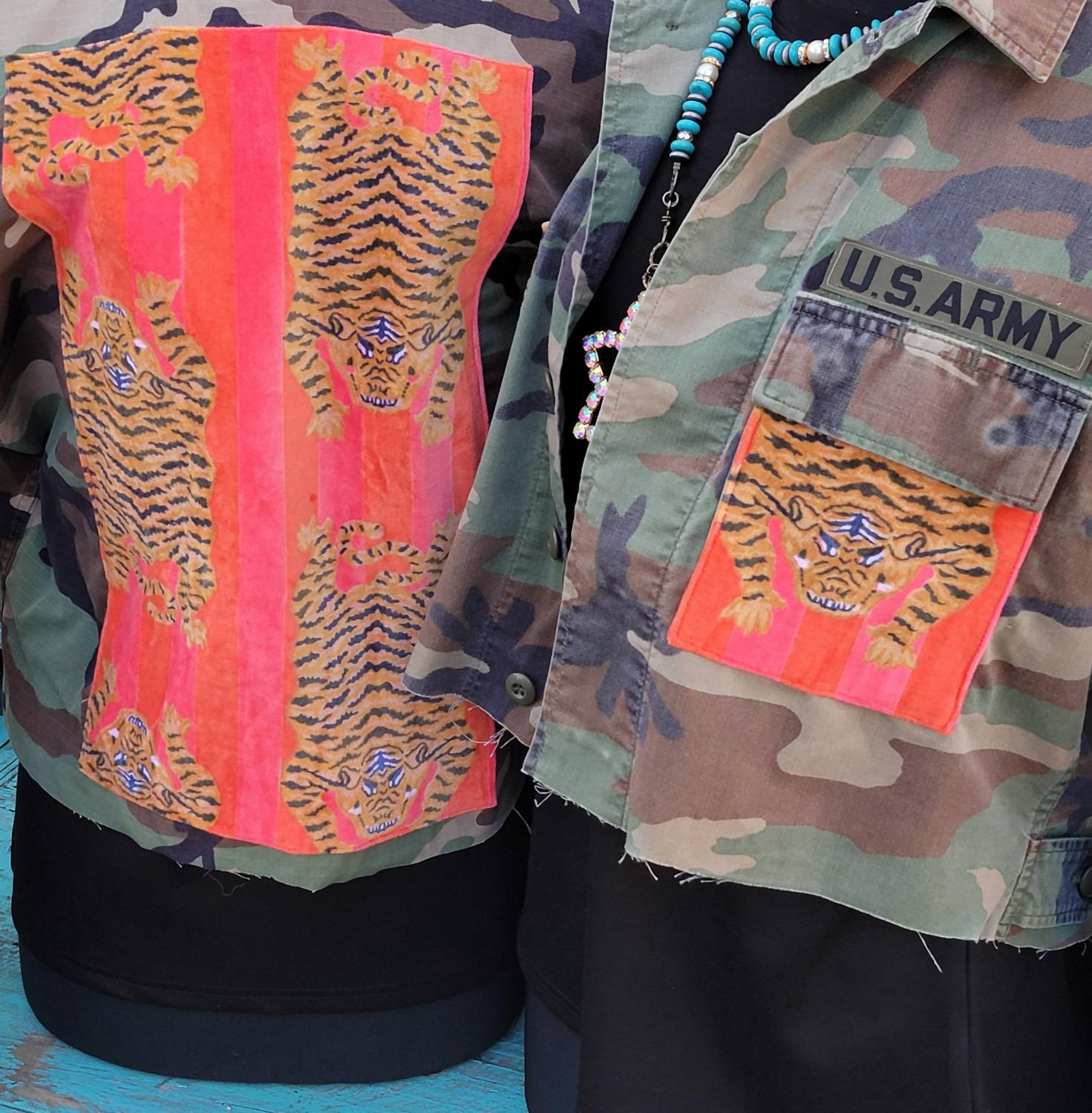This utility jacket is the perfect combination of cool and feminine. Unleash your bold side with the Women's Camo Jacket by Camel Threads, featuring a standout pink tiger camo pattern. This long sleeve utility jacket is crafted from upcycled materials, ensuring each piece is unique and eco-friendly. With practical pockets and a classic collar, it features a button closure for easy wearing. Available in sizes small (4-6) and one size (8-12).