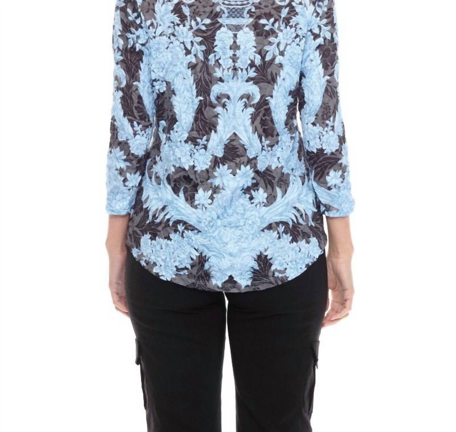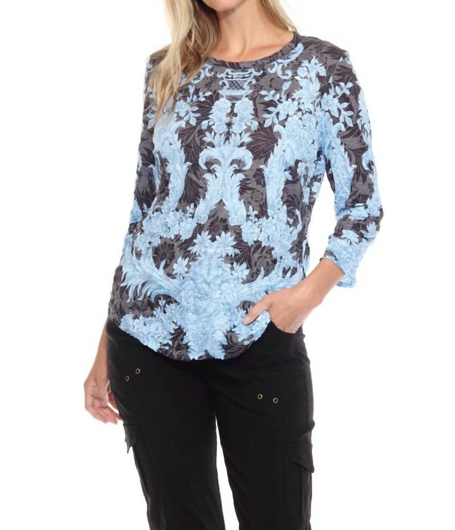 A versatile blouse that works from desk to dinner! Introducing the Lace Round Neck Top by CARINE, a vibrant patterned piece perfect for your spring wardrobe. This blouse features three-quarter sleeves and a comfortable crewneck, designed with a relaxed fit in breathable, lightweight crinkle fabric. Its composition of 35% Rayon and 65% Polyester ensures easy care, requiring only a machine wash cold and line dry. The garment measures 23.5 inches in length and is a convenient pull-on style, ideal for everyday chic with a touch of boho trend.