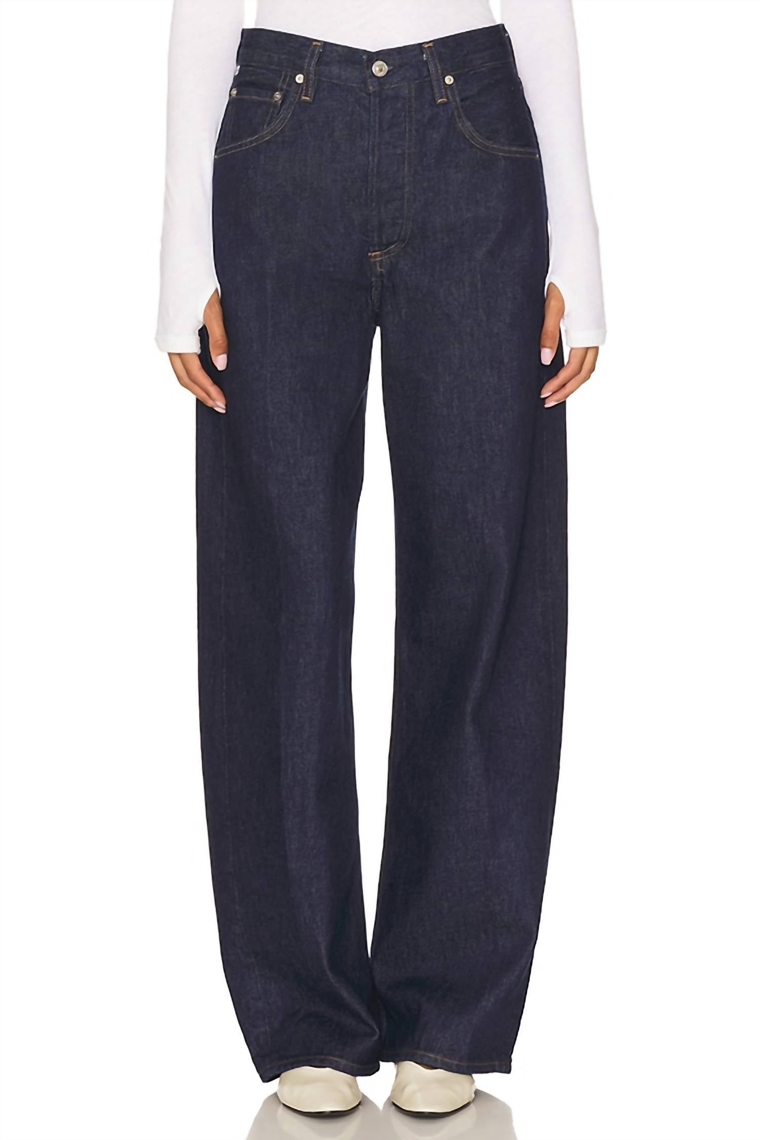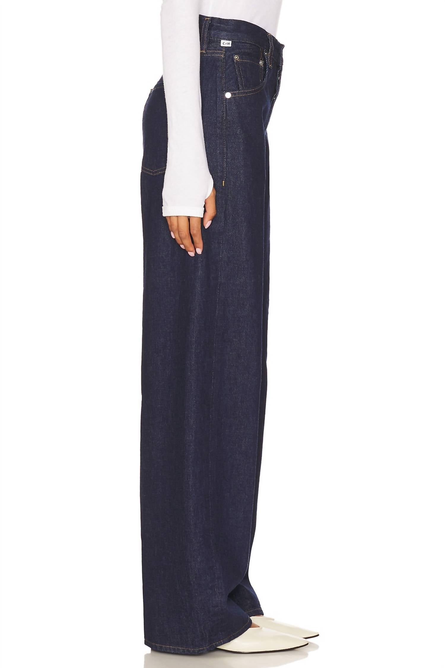 Pair these wide leg jeans with mules, slides or your favorite strappy sandals. Experience the Ayla Baggy Jean by Citizens of Humanity, offering a refined take on the baggy silhouette with a relaxed fit in the Amherst color. The mid-rise, wide-leg design in a solid pattern features a dark wash, crafted from rigid cotton for the perfect blend of structure and comfort. Closure: Button closure. Care: Machine wash. With a 32-inch inseam and 12-inch rise, these jeans deliver effortless style, perfect for summer vacations and embodying the essence of 90s fashion.