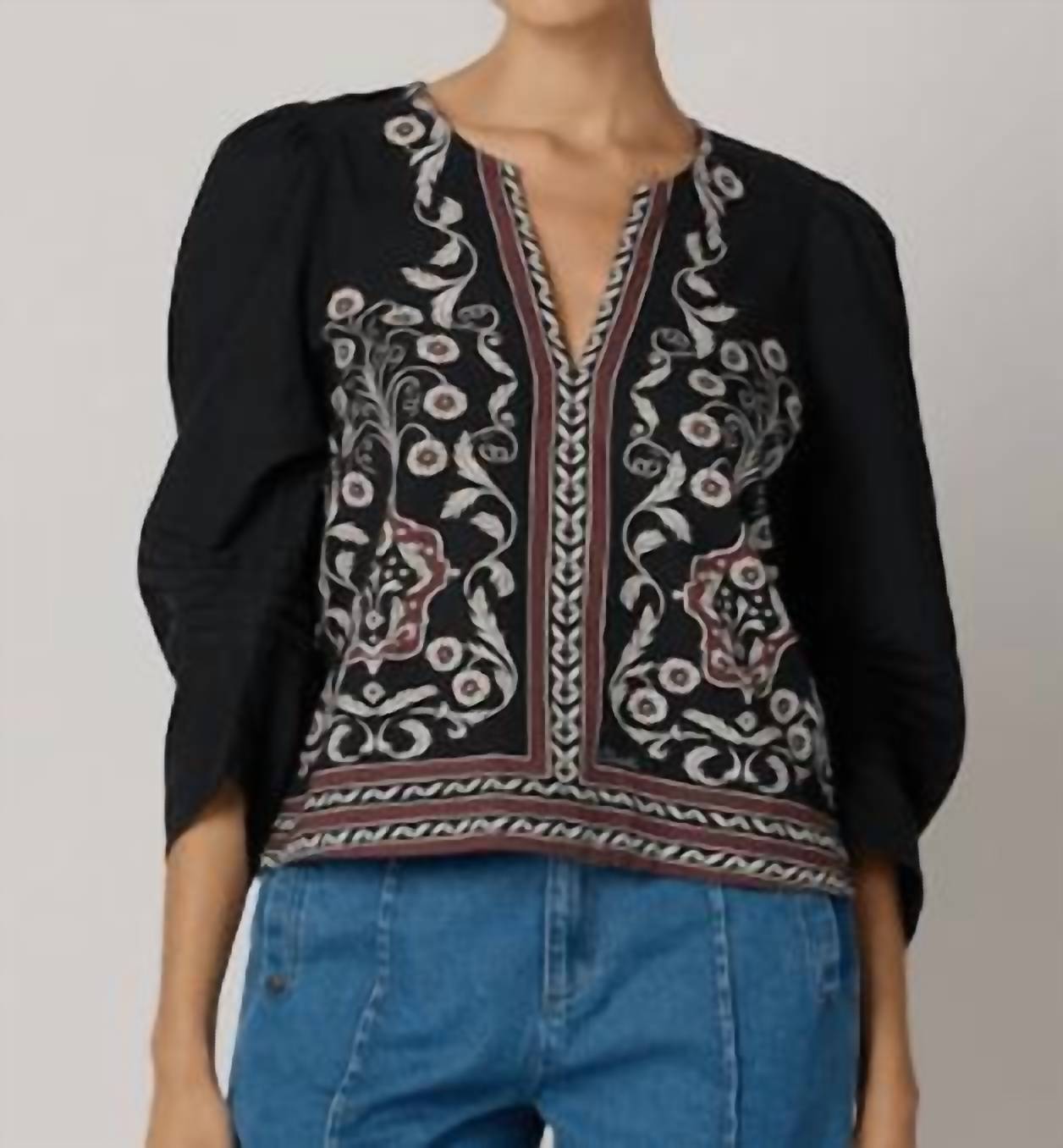 A timeless blouse that will never go out of style. Introducing the Cleobella Farrah Blouse, a chic piece in cardamon designed for the modern woman. Featuring three-quarter sleeves and crafted from a comfortable cotton blend, this patterned blouse offers both style and ease. Made ethically in India, the V-neck design and pull-on closure make it a versatile choice for any occasion. Care: Hand wash and lay flat to dry for lasting quality.