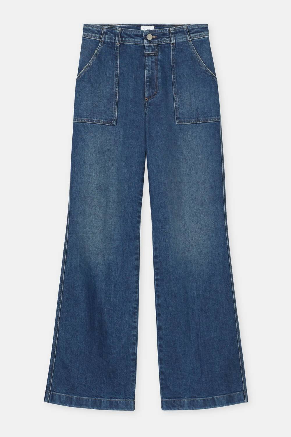 Pair these wide leg jeans with mules, slides or your favorite strappy sandals. Crafted by CLOSED, the Aria Flared Jeans in dark blue offer a sophisticated look with a high waist and flared leg design. Made in Italy from a premium cotton blend, these jeans feature 99% regenerative cotton and 1% elastane (ROICA™ V550), ensuring comfort with a stretch and an authentic denim appearance. Featuring front patch pockets, these solid-patterned jeans boast a discreet zip closure for a seamless finish. Perfect for a holiday party in spring, this versatile piece combines style and sustainability.