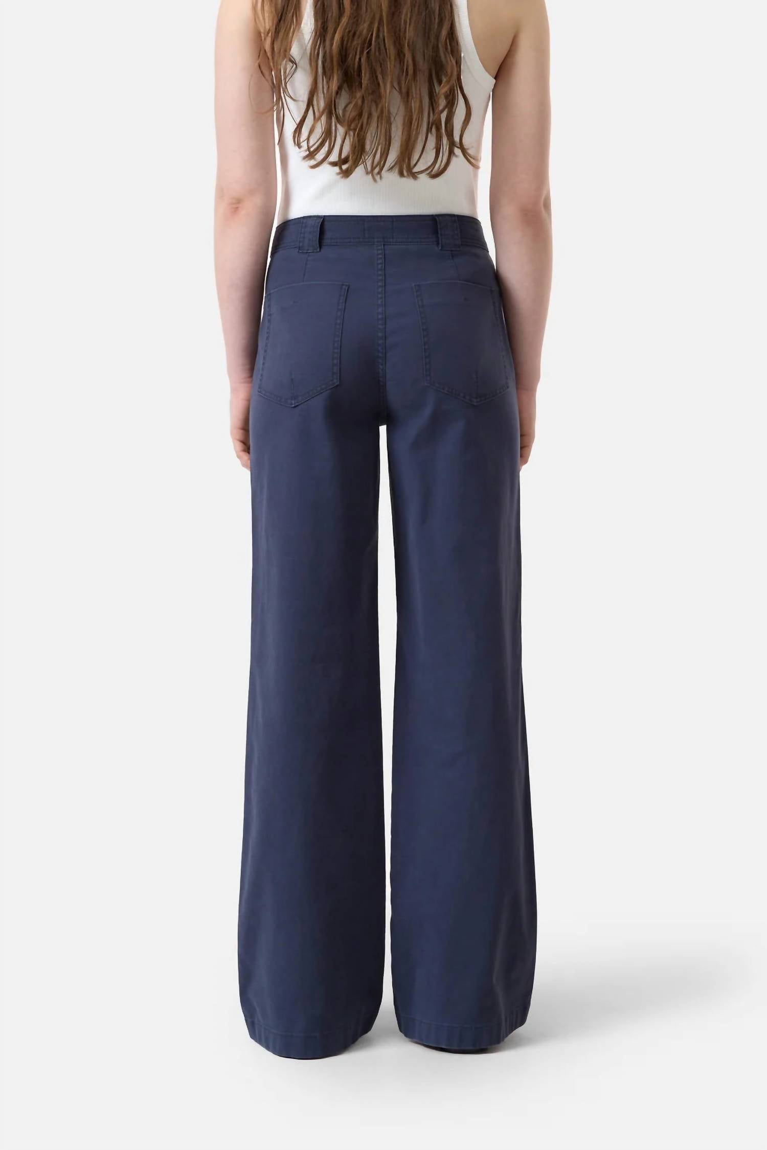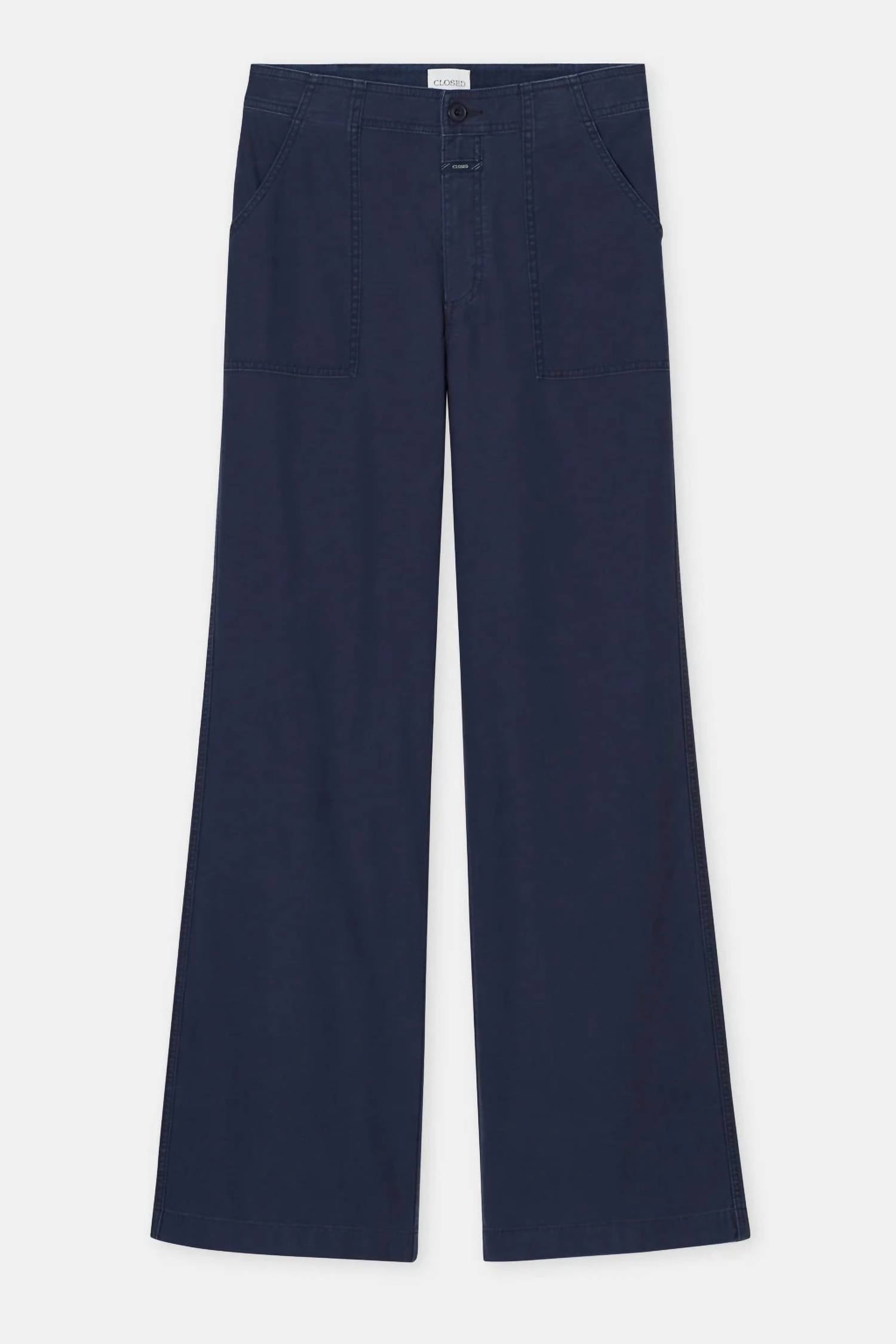 The Women's Aria Pants by CLOSED in Dark Night blend workwear inspiration with a high-fashion aesthetic. Crafted from a cotton blend, these trousers feature wide, flared legs and a high-rise waist for a flattering fit. They also come with practical patch pockets and a button closure, offering both style and functionality. Perfect for a holiday party, these pants boast a solid pattern that's ideal for spring settings.