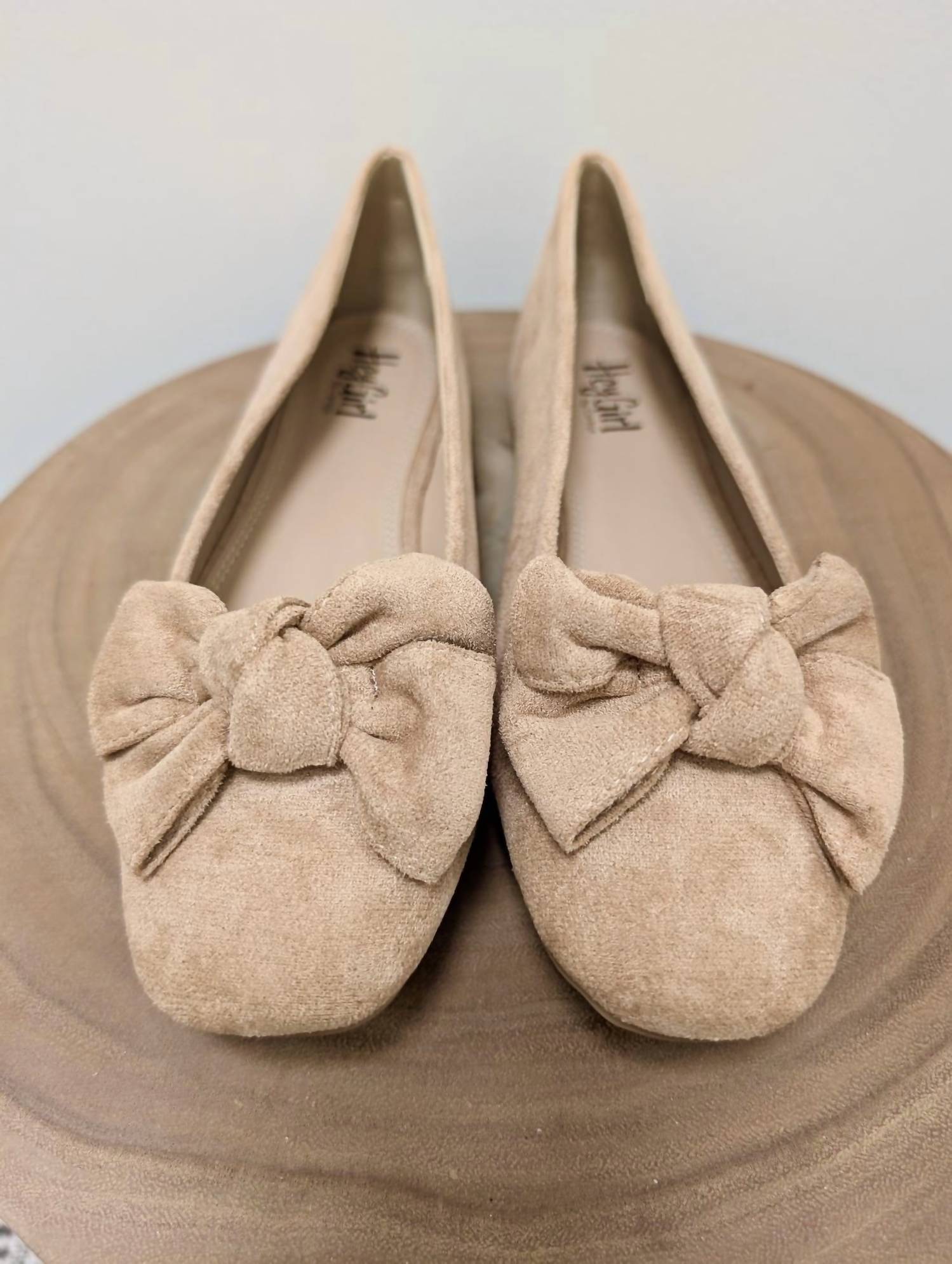 A classic loafer that is both comfortable and polished. These flats have a faux suede upper and a bow detail on top. They include a cushioned footbed for comfort. They run true to size; if you wear a half size, size up.