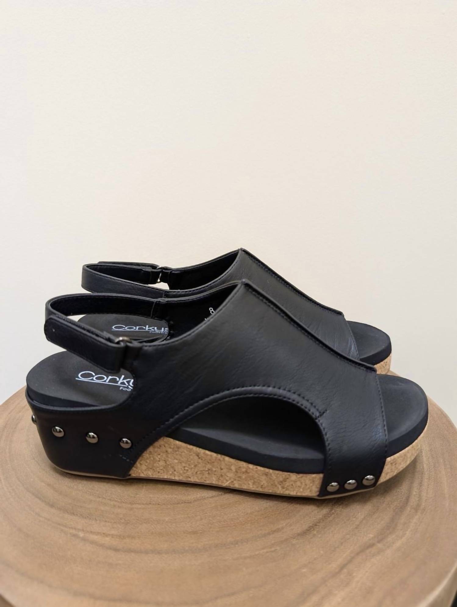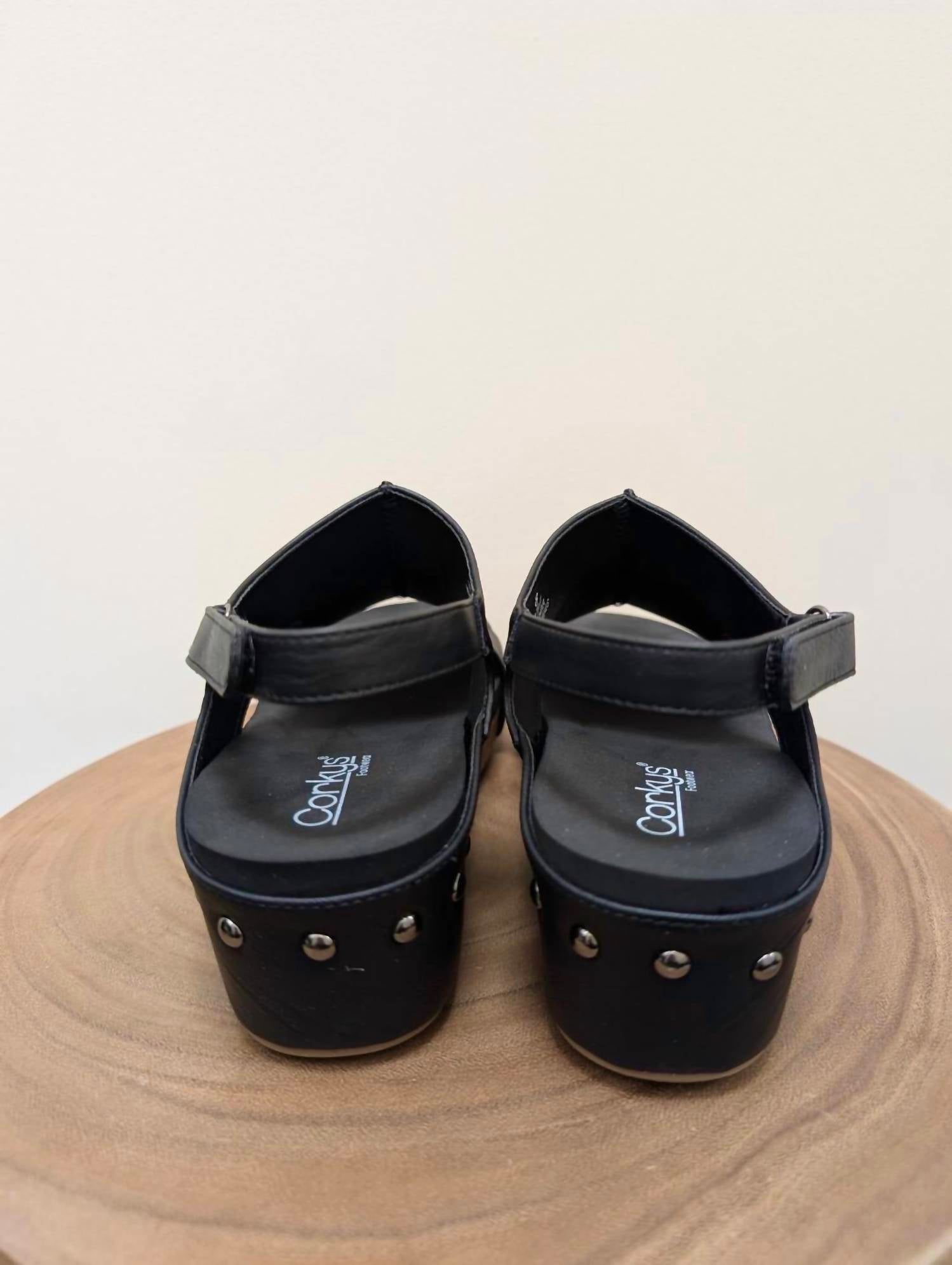 Timeless wedges that will be relevant season after season. This sandal has a synthetic upper, a wide strap, and a hook-and-loop adjustable slingback strap for secure fit. It features a 1-inch foam footbed for comfort, a 2-inch wedge heel with a 1-inch platform, and a rubber outsole. It includes studded details and comes in whole sizes only; if you wear a half size, order the next size up.