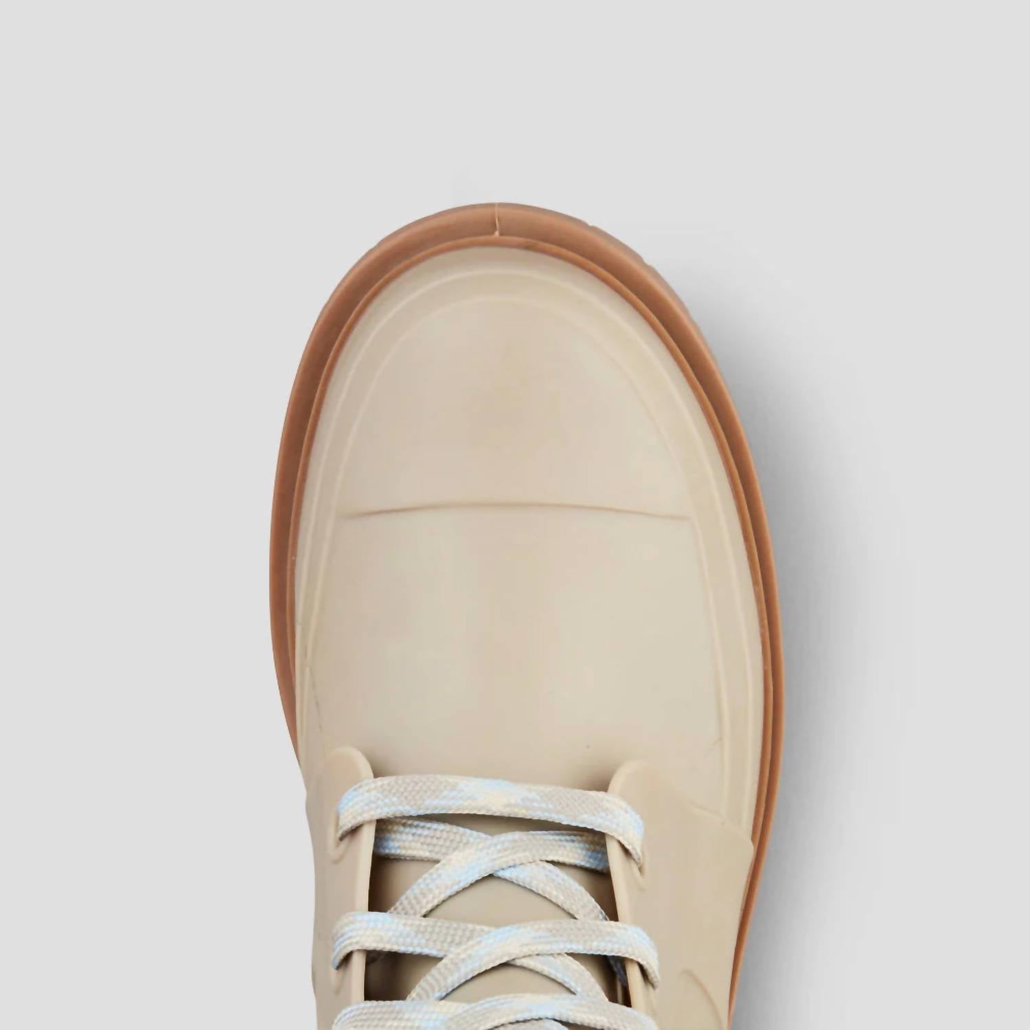 Upgrade your shoe game with these stylish lace-up boots, designed to merge sophistication and comfort. You'll be reaching for these shoes season after season. Step out in style with the COUGAR Women's Madrid Rubber Mid Rain Boot in a chic Dove hue, perfect for your workwear and vacation wardrobe. These mid-height boots feature a round toe and a front closure with flat waxed laces, complemented by a 1.25-inch block heel for comfortable elevation. Made from a durable rubber-like compound, they promise to keep your feet dry with an always waterproof design. The knit lining, removable molded foam footbed, and anti-slip rubber-like compound outsole ensure comfort and stability on any terrain.
