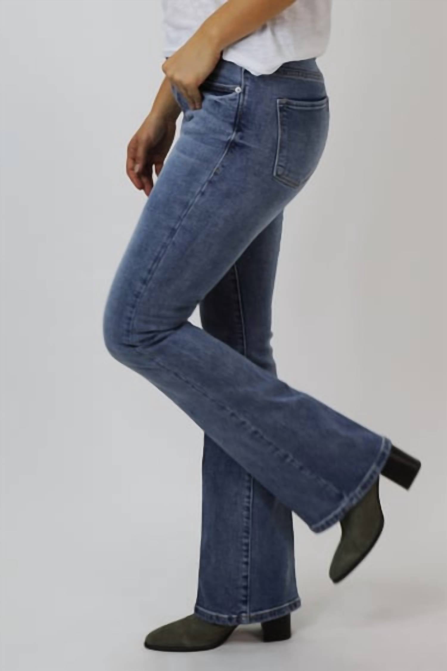 If you're looking for boot-cut, this is the jean for you. Upgrade your denim collection with the Jaxtyn Boot Cut Jeans by DEAR JOHN DENIM, crafted from a comfortable cotton blend in the captivating Waikiki color. These women’s jeans feature a mid-rise waist of 9.5 inches and a classic fit with a flared leg, ideal for any streetwear look. Designed with full inseam comfort stretch denim, they are accentuated by hip whiskering and tuck washing along the pocket seam, complete with a practical button closure. Easy to care for, simply machine wash and tumble dry, making them perfect for a Thanksgiving dinner party or any spring occasion.