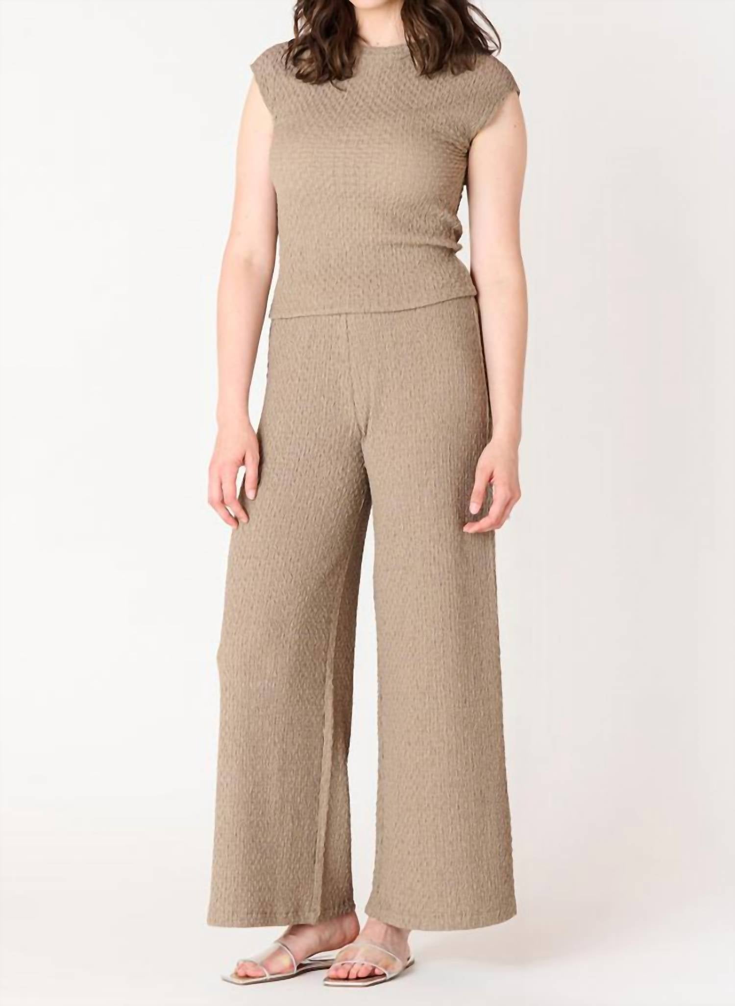 No gym necessary for these cool-girl joggers. Introducing the Textured Wide Leg Pants by Dex, a chic addition to any monochrome wardrobe. These women's mid-rise pants are crafted from a soft and stretchy blend of 97% polyester and 3% spandex, featuring a wide-leg silhouette and regular fit for effortless style. With a convenient pull-on closure and an elastic waistband, they ensure comfort and ease of wear. Care instructions include hand washing and line drying for long-lasting wear. Available in a sophisticated taupe hue.