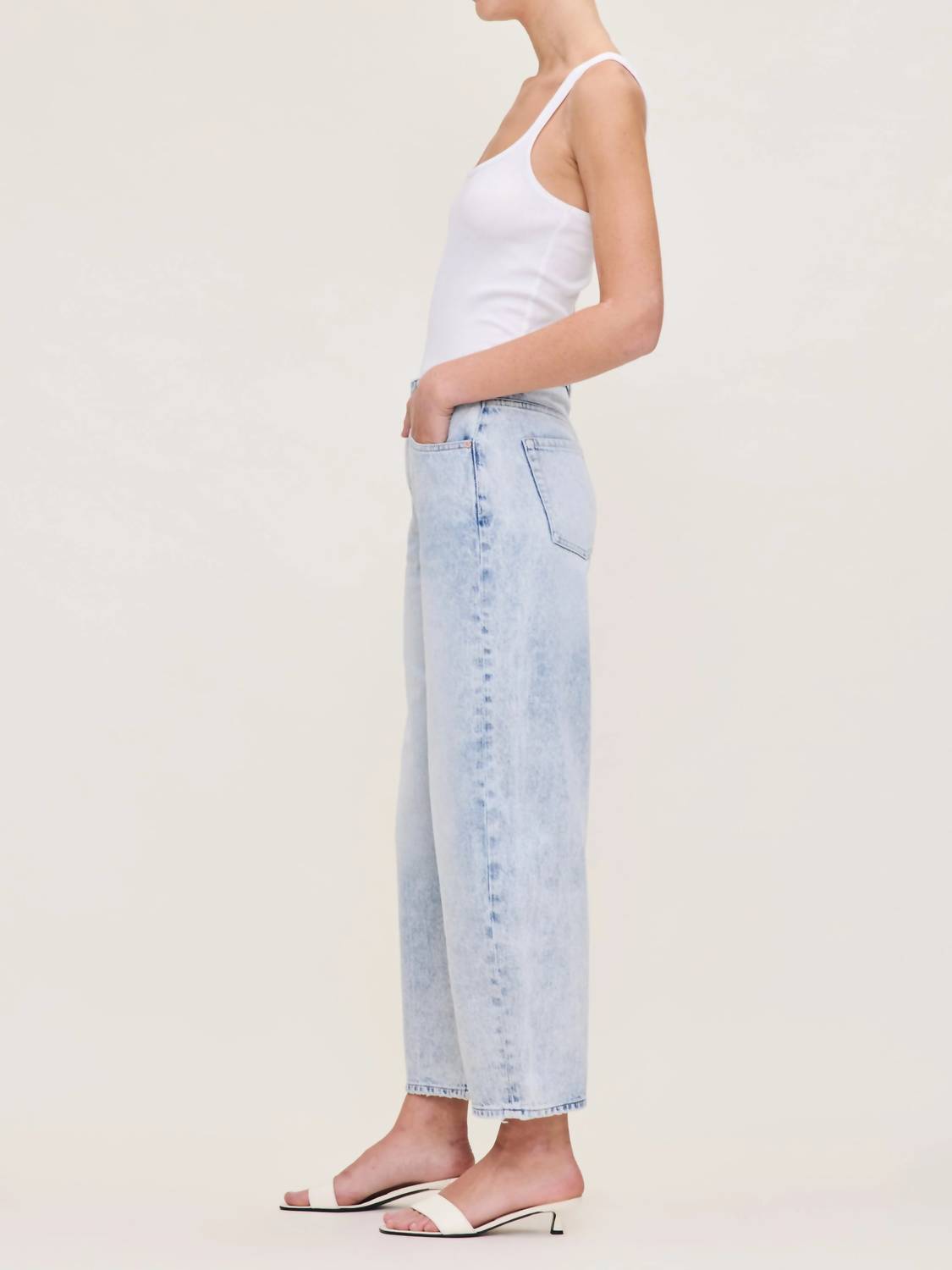 Just as cute as they are comfortable. Introducing the Taylor Relaxed Barrel Jean by DL1961, a stylish addition in the Crystal Lake color, designed for women with a high rise of 12.5 inches and a relaxed fit. These jeans feature a wide leg style with a 27-inch inseam and a 20.25-inch leg opening, crafted from quality 100% cotton. The light wash and authentic worn-in look are enhanced by silver shanks, copper rivets, and multi-colored stitching, complemented with a clean hem and an ecru back patch. Closure is secured with a button, and you can maintain its pristine condition through machine washing.