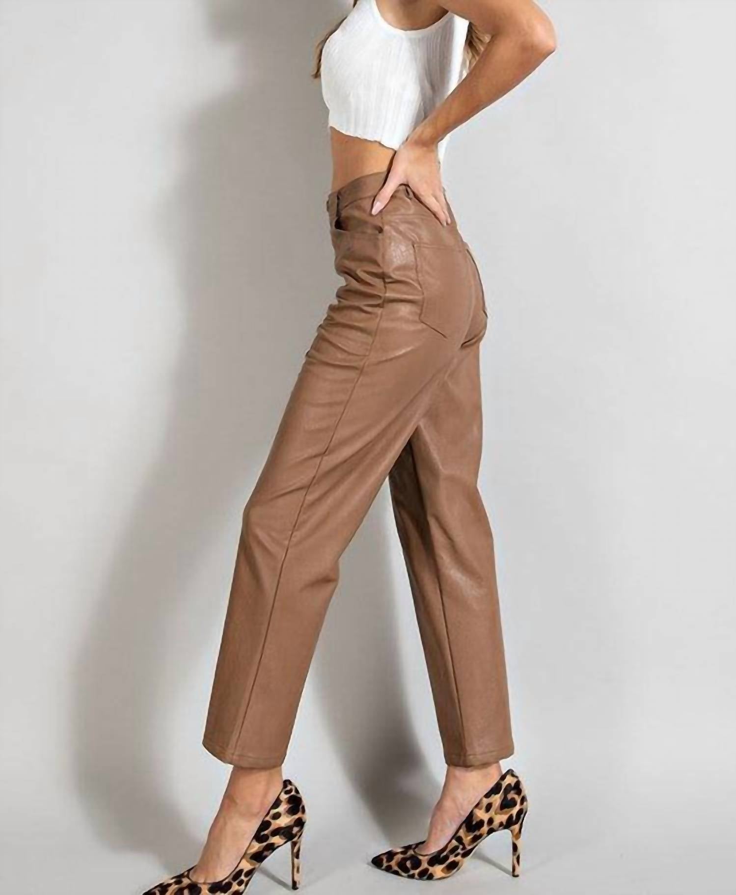 High-waist is here to stay and we especially love this style. Elevate your fall wardrobe with the High Rise Trousers in a rich cocoa hue by ee:some. These faux leather trousers feature a straight leg and a high-rise design, combining comfort with a flattering silhouette. Complete with front and back pockets, belt loops, and a button and zipper closure, these trousers are both functional and stylish. Care instructions suggest dry cleaning to maintain the quality and appearance of the fabric.