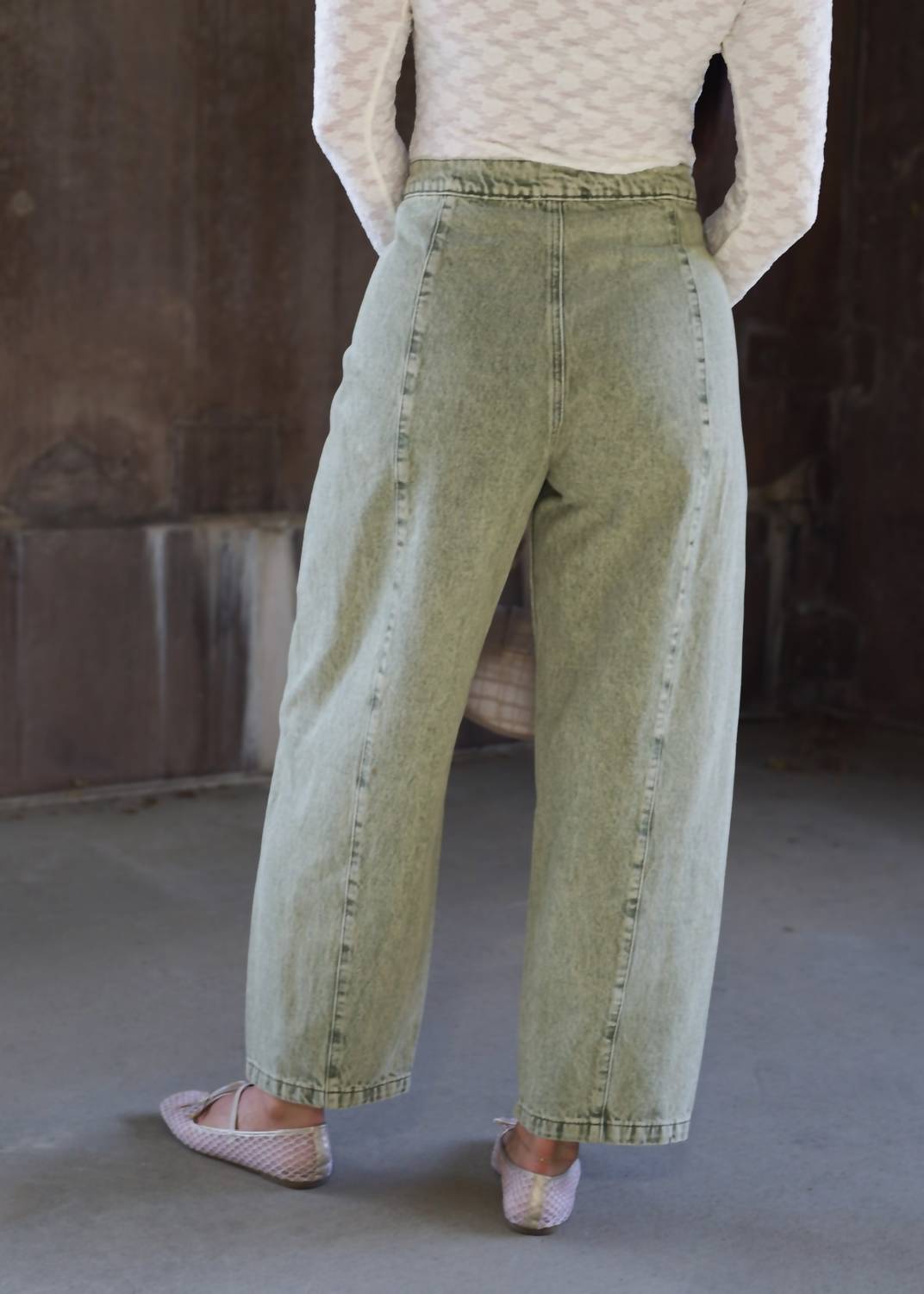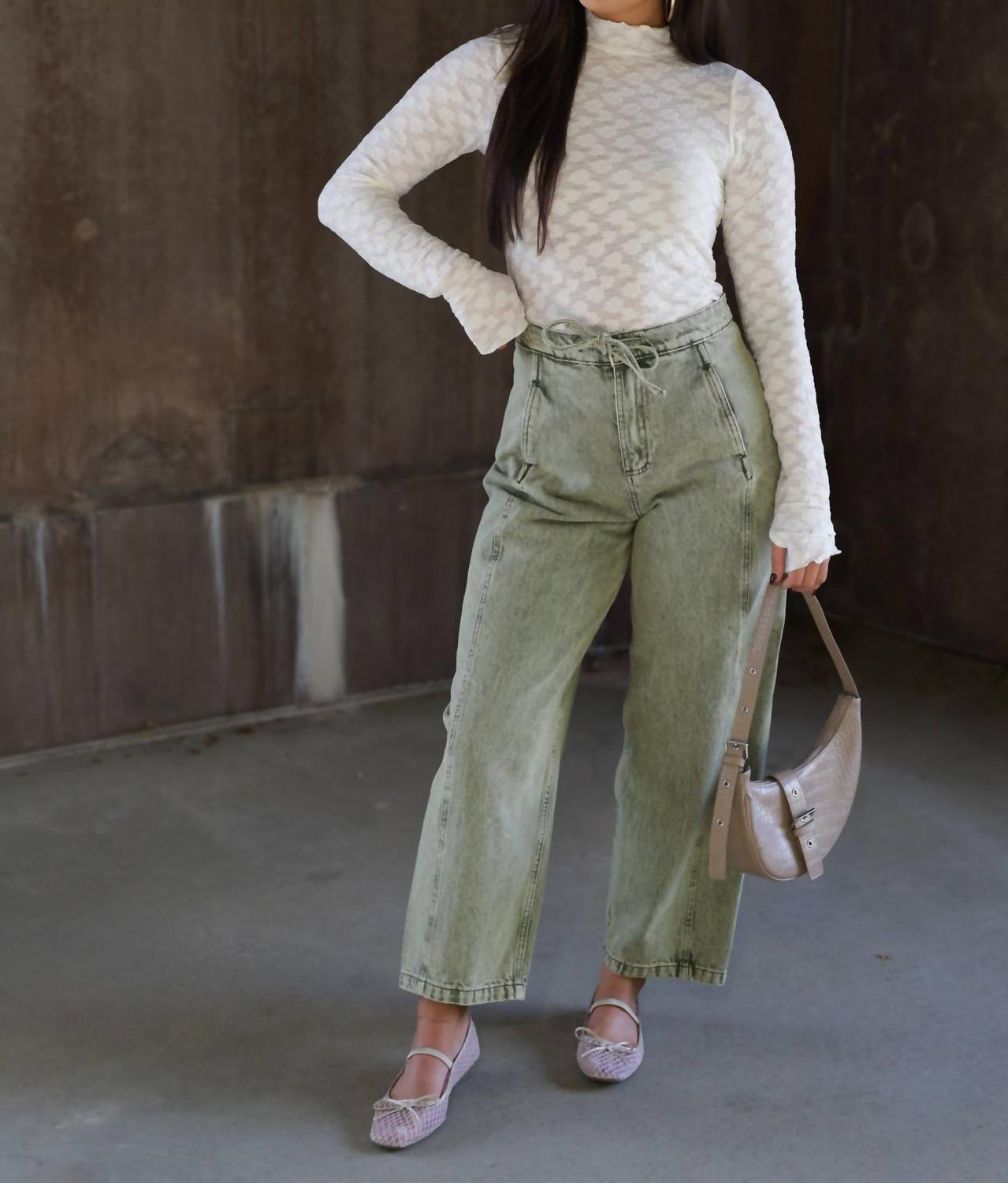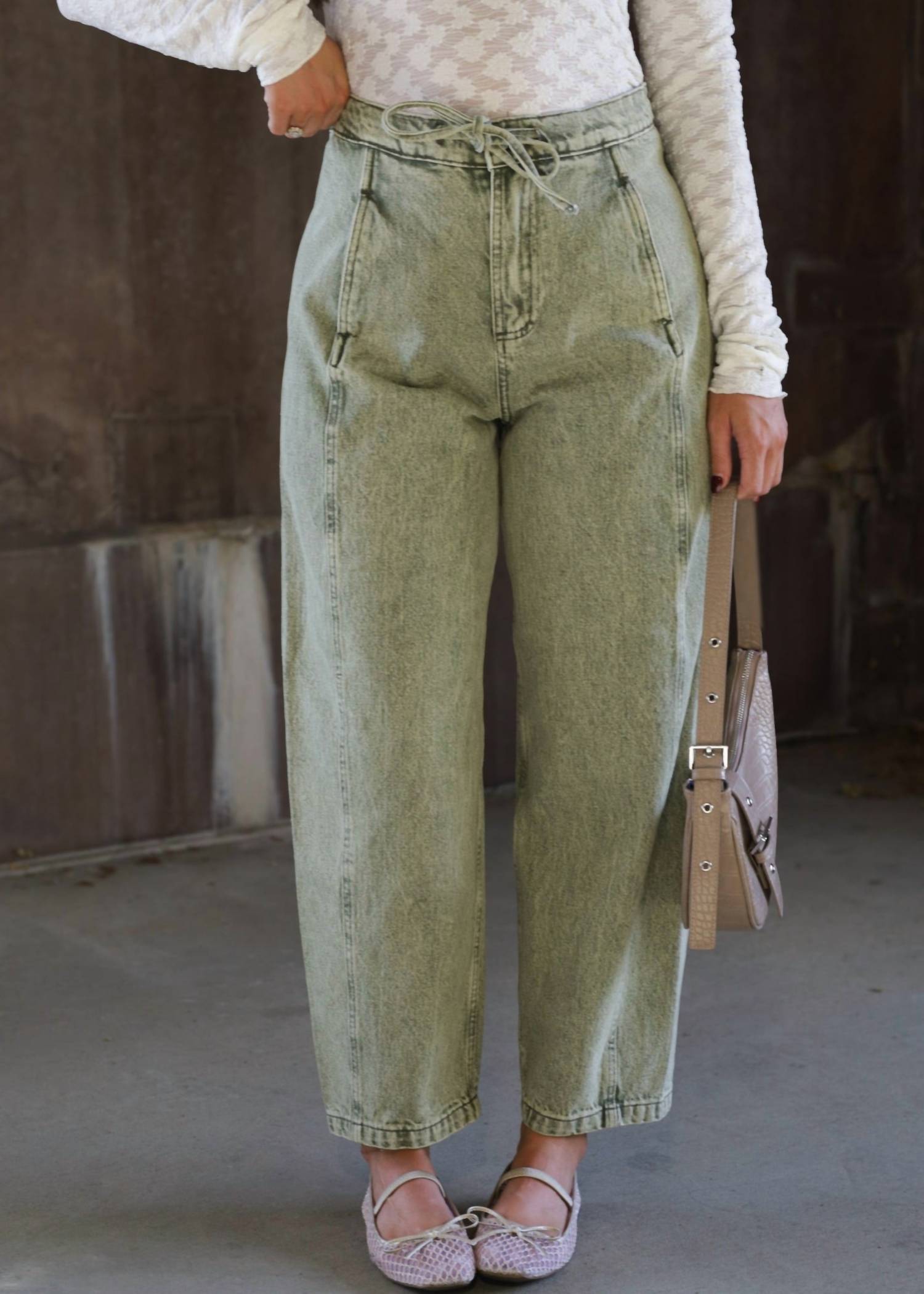 High-waist is here to stay and we especially love this style. Introducing the All Tied Up High Waist Denim by Entro, a stylish addition to your wardrobe in a chic olive hue. These ankle-length denim pants feature a high-rise, relaxed fit with a drawstring waist, vertical seam, and tapered legs for a flattering silhouette. Crafted from a durable cotton blend of 80% cotton and 20% polyester, they provide comfort and style with convenient side pockets and a button front closure. Care instructions include machine washing and tumble drying, making them ideal for everyday wear.