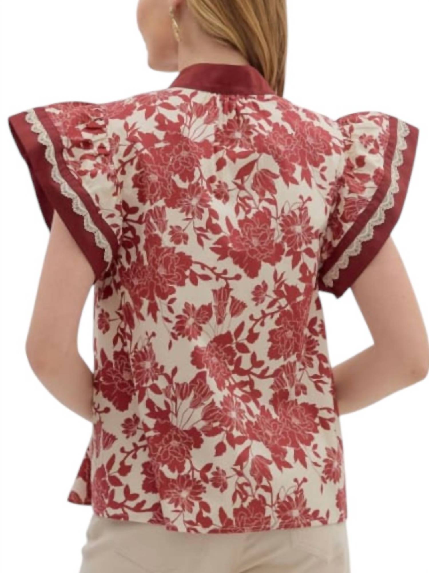 A timeless blouse that will never go out of style. Presenting the Floral Flutter Sleeve Top by Entro, perfect for embracing the maximalist trend this Spring. This women's blouse features short flutter sleeves with a V-neckline and charming floral print, enhanced by scalloped lace trim for a touch of elegance. Made from 97% polyester and 3% spandex, this multicolor top ensures comfort with its pull-on closure. For care, simply hand wash and line dry. Ideal for vacations or a thoughtful Mother's Day gift, with no pockets for a sleek design. Model is 5'10" and wearing a size small.
