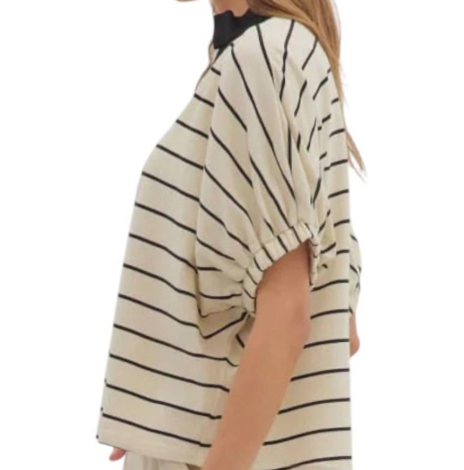 Pair this with your favorite jeans and slides for your next girls night out. Discover the Stripe Dolman Sleeve Top by Entro, a chic ivory blouse perfect for vacations and Valentine's Day outings. This women’s summer top features short dolman sleeves with elasticated openings and a stylish striped pattern, highlighted by a contrasting trim along the split V-neckline. Crafted from a comfortable cotton blend, it combines 65% polyester, 30% cotton, and 5% spandex, and ensures ease of wear with a pull-on style. Care for it by hand washing, followed by a line dry for optimal longevity.