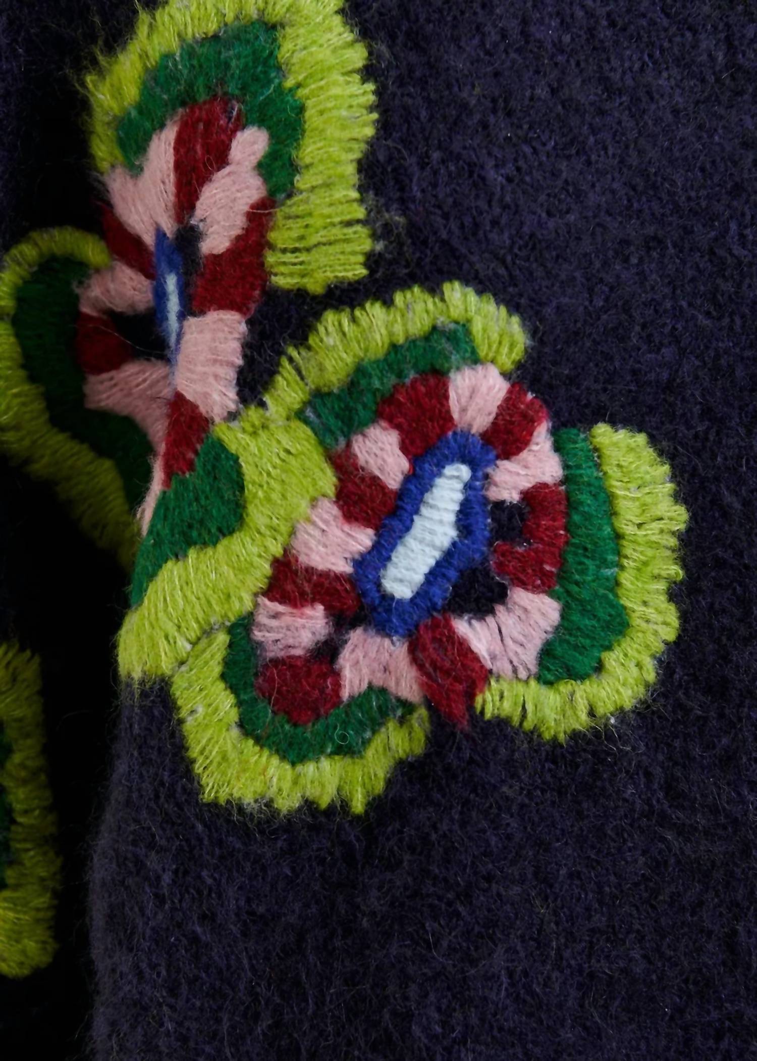 The ultimate go-to sweater, expertly crafted to provide the perfect combination of warmth and style. Its classic design and soft fabric make it a must-have addition to your wardrobe. Discover the Fine Knit Sweater by ESSENTIEL ANTWERP in a captivating navy hue. This elegant piece features long sleeves and is composed of a rich blend including 49% Acrylic, 17% Polyamide, 16% Mohair, and 16% Wool. The sweater is designed with a relaxed silhouette and dropped shoulders, embellished with tonal and contrast floral embroidery on a textured knit base. Equipped with pull-on closure and ribbed trims to maintain its shape, this luxurious sweater should be hand washed and laid flat to dry for best care.