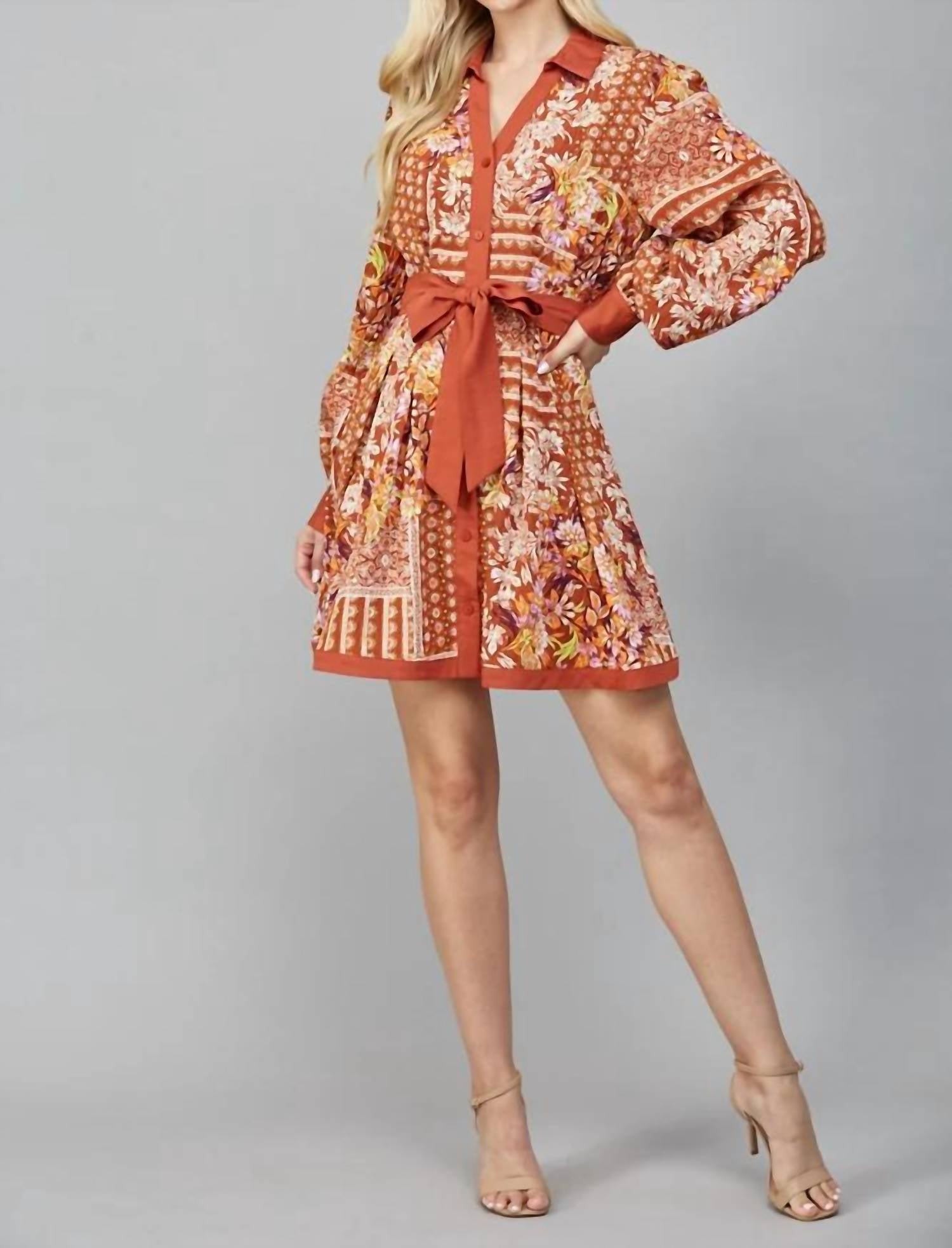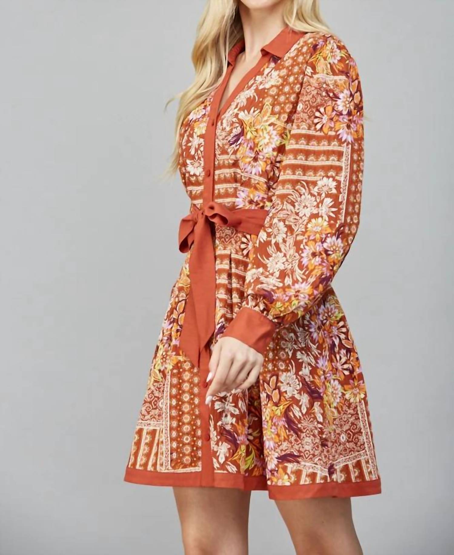 Cute and comfortable, this long sleeve dress has it all. Ideal for dinner parties with its boho chic charm. Crafted with long sleeves and a floral pattern in a rich burnt orange hue, offers a tailored silhouette perfect for any occasion. Sleek button closure and solid binding details add a contemporary edge to its classic design. Originating from a structured silhouette, perfect choice for fall gatherings.