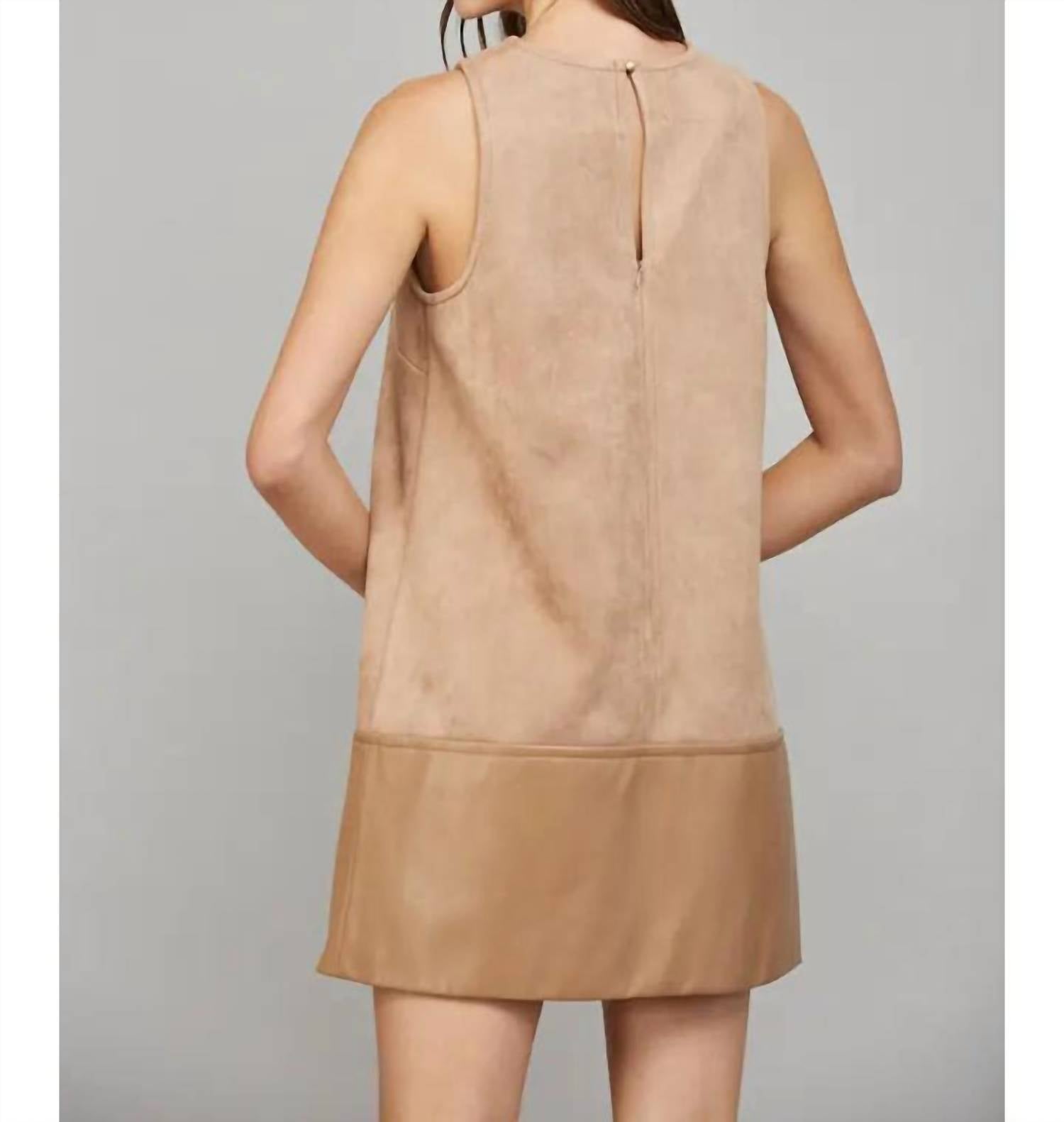 The kind of easy and flattering dress you'll be reaching for all season long. Step into effortless style with the Faux Leather Hem Suede Shift Dress by Fate, a holiday party essential in chic camel. This sleeveless shift dress is crafted from luxurious Faux Leather/suede and features a classic crewneck neckline. It boasts a modern mini length with a polished button closure for easy wear. A perfect blend of preppy trends and spring vibes, this solid, pocket-free dress ensures an elegant look for any occasion.