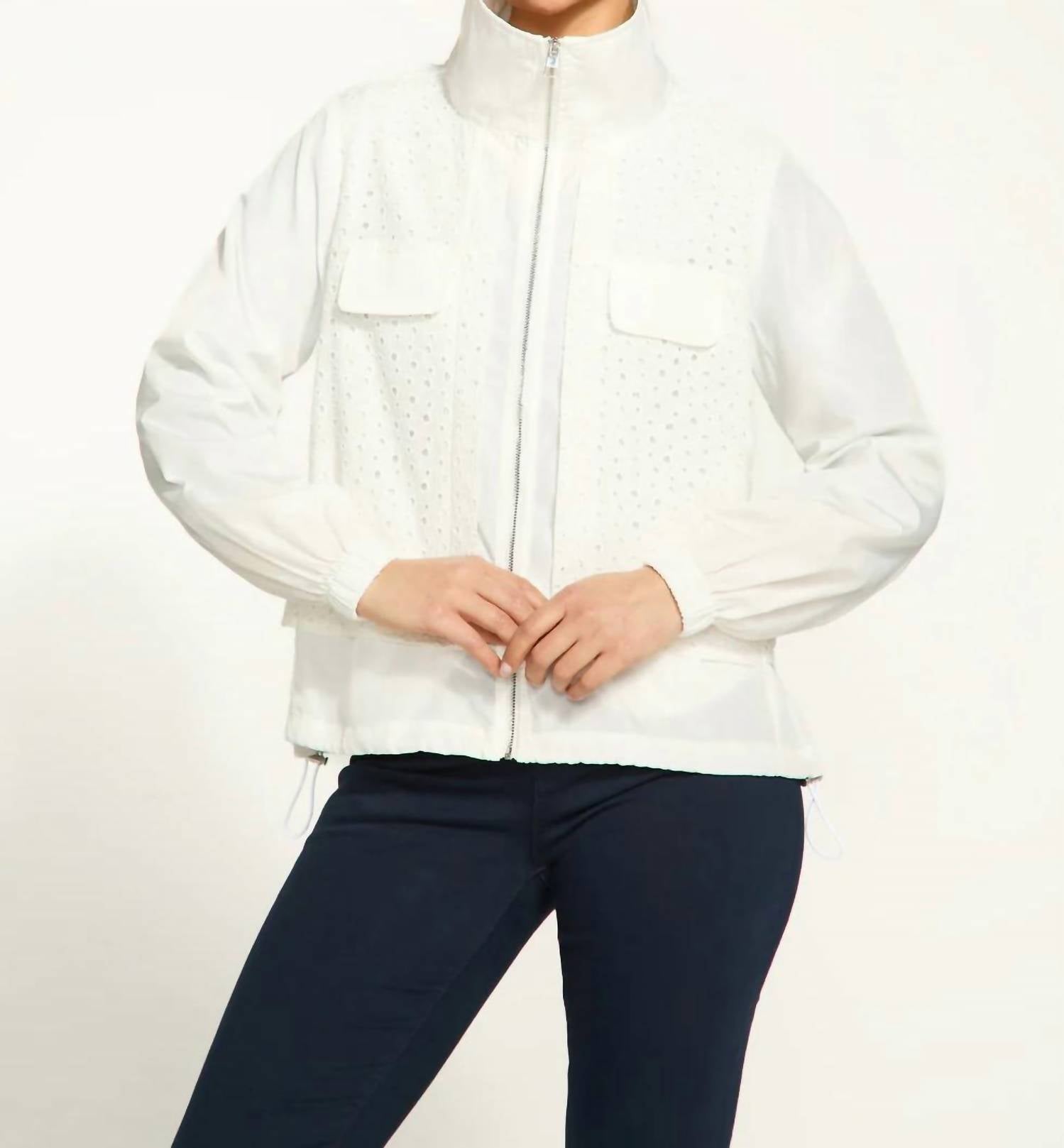 A jacket so versatile you can literally wear it with anything. Elevate your casual style with the women's Eyelet Lace Jacket by FDJ, a chic addition to any wardrobe. This patterned white jacket features long sleeves and a stylish mockneck, adding a touch of sophistication. Made with attention to detail, it includes a practical zip closure and handy pockets. Perfect for layering, this jacket combines fashion-forward design with everyday functionality.