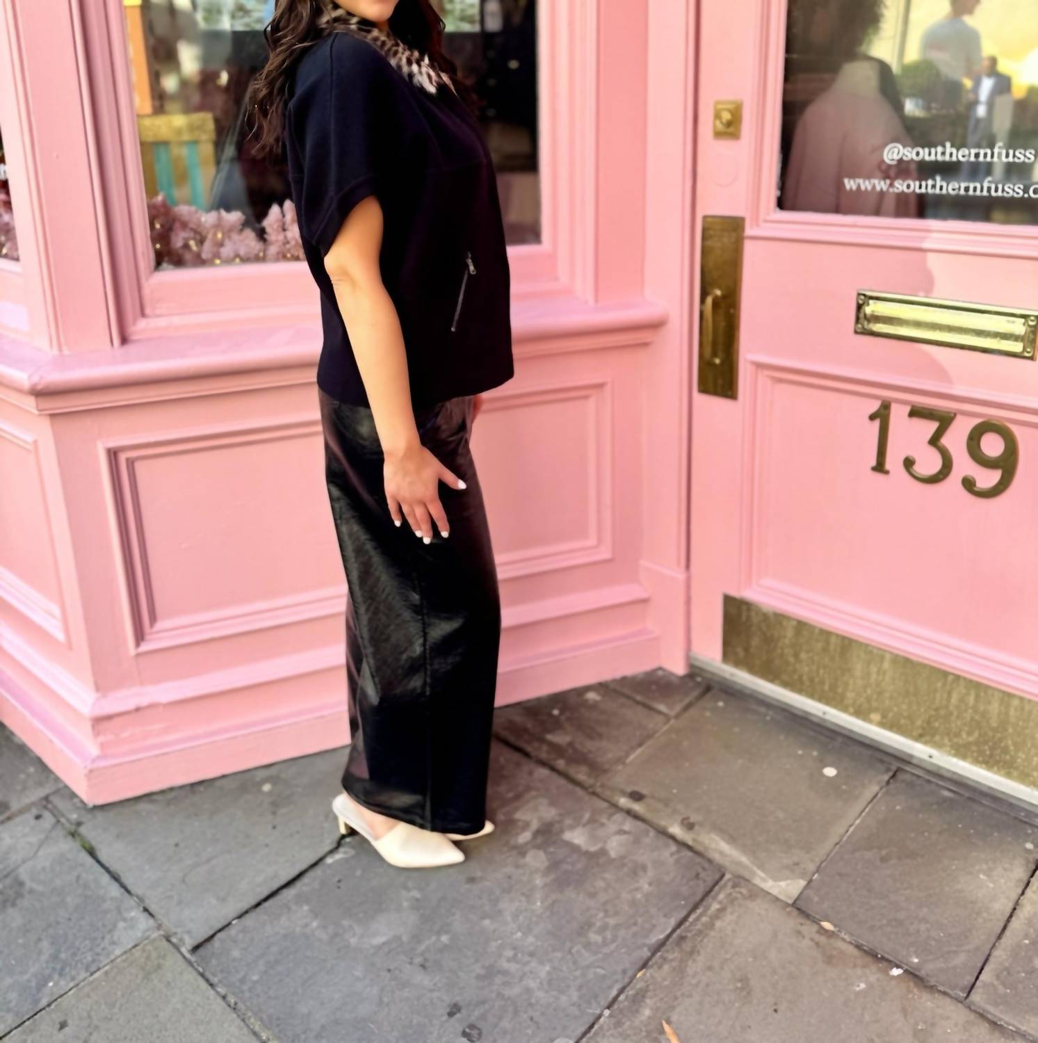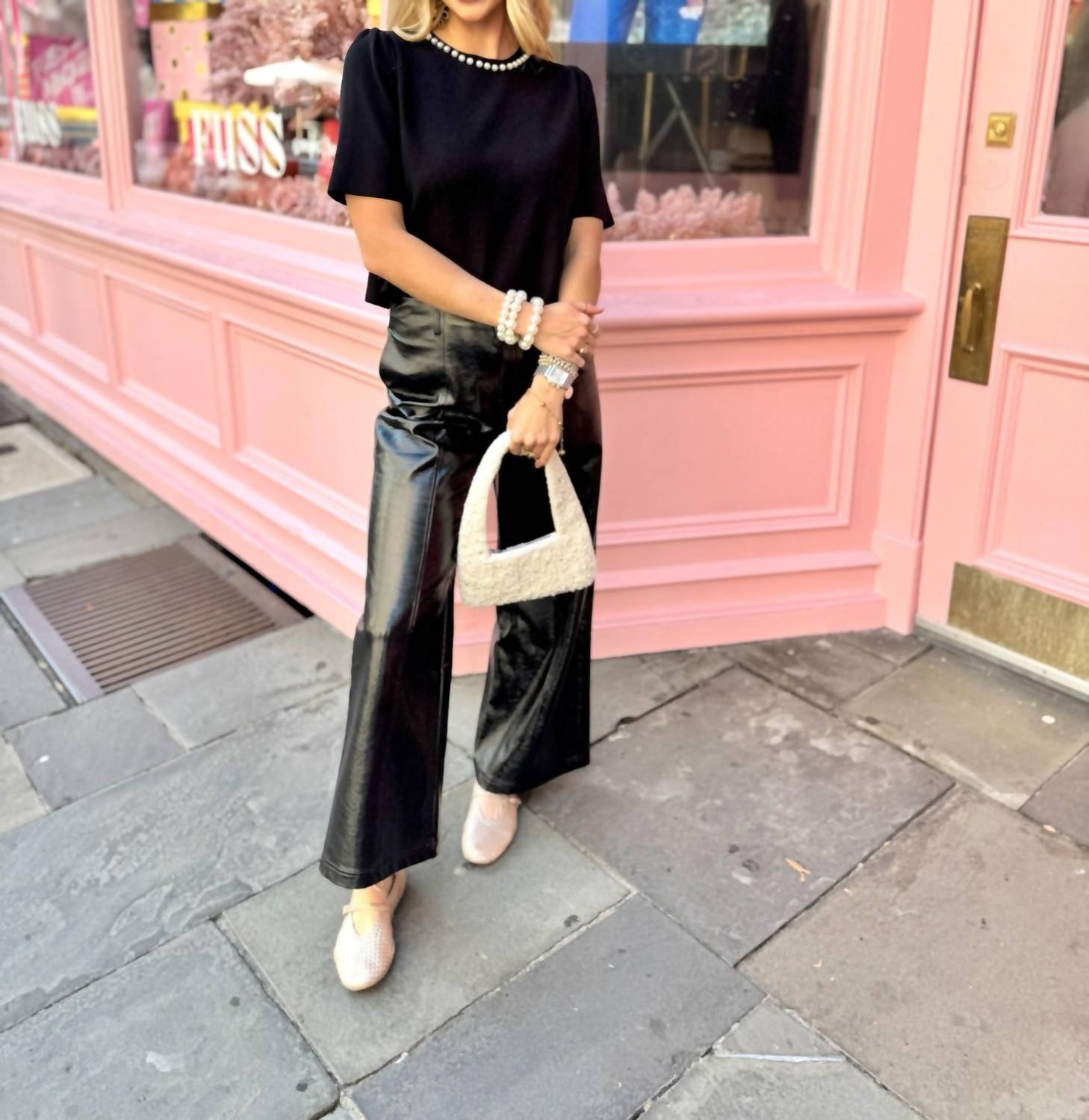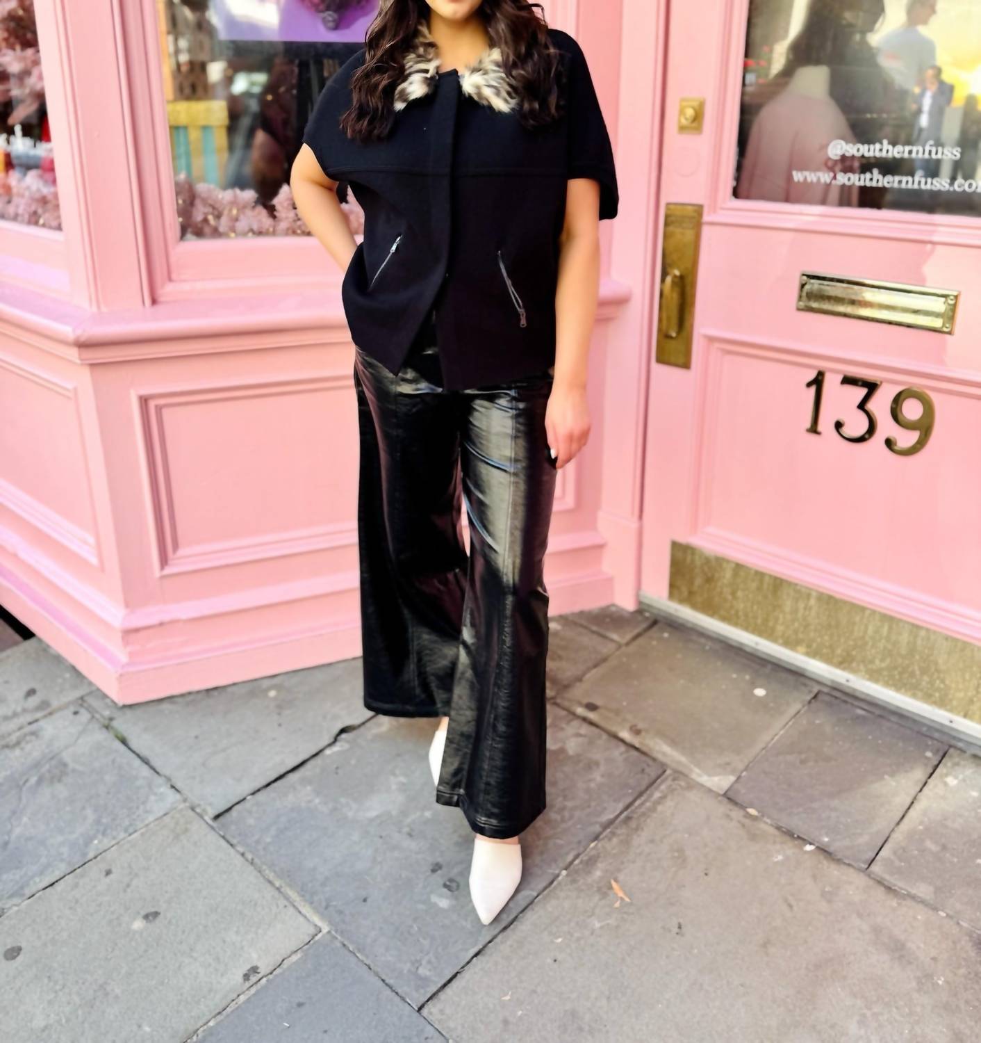 Discover the Elowen Pants by FRNCH, a chic addition to your wardrobe in elegant solid black. These high-rise, relaxed fit, wide-leg trousers feature contrasting stitching and an exclusive FRNCH vinyl fabric that's both durable and environmentally friendly. Equipped with side pockets and a soft-lined interior, they provide comfort and practicality. Closure: Button and zipper. Perfect for a holiday party or spring outing.