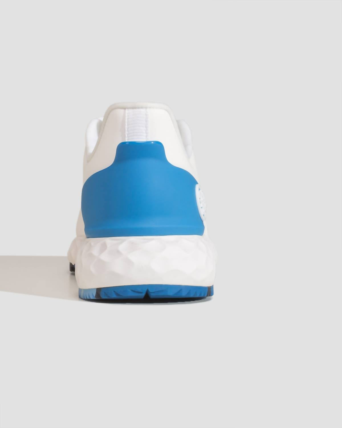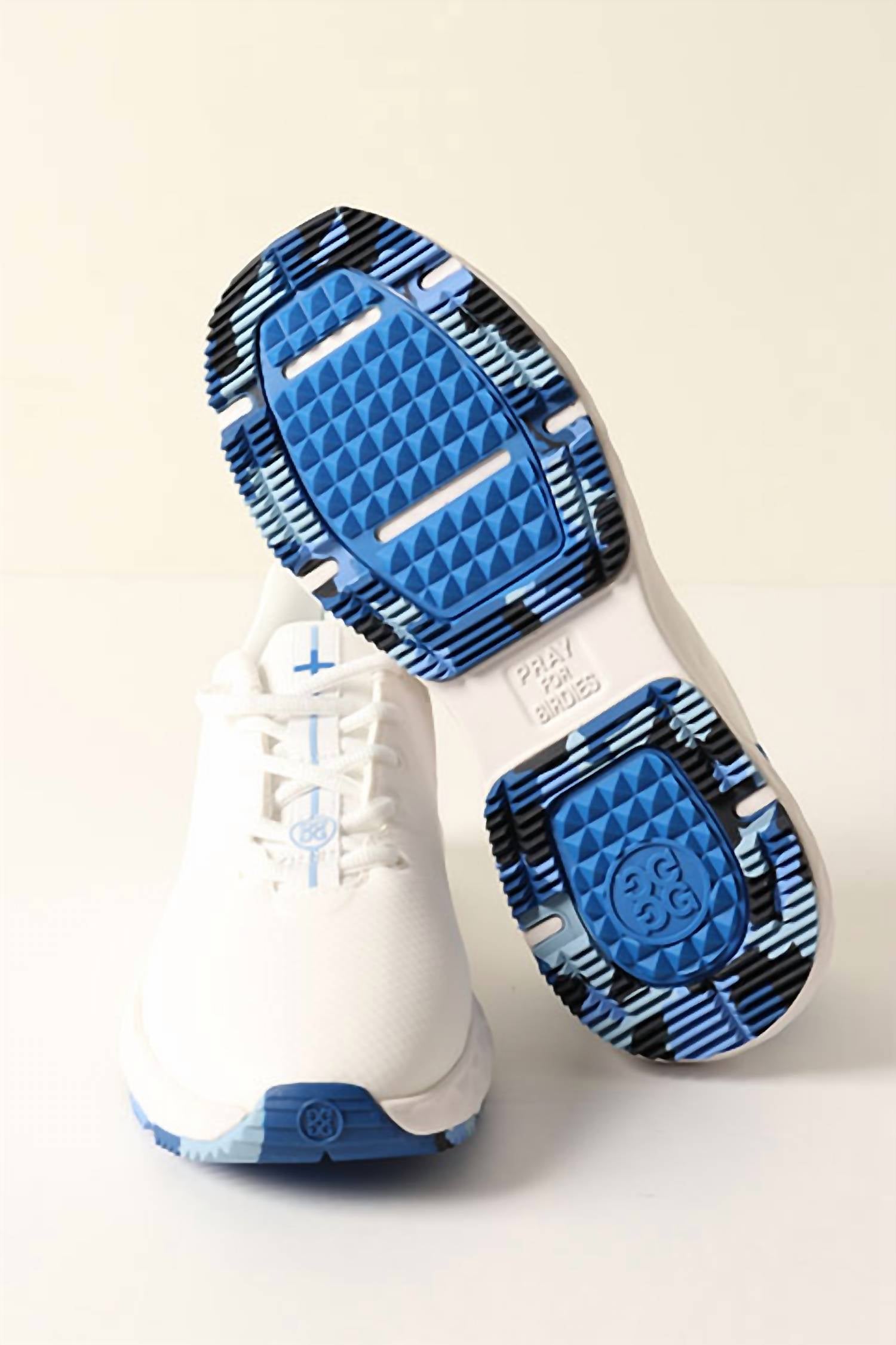 Workout in style with these adorable athletic sneakers. Step up your golf game with the Women's Mgfour Plus Shoe by G/Fore in a striking White Blue colorway, perfect for workwear trends this spring. Designed for adult women, these athletic shoes feature a round toe and a flat heel with a height of 1" and under for ultimate comfort. Made with high-quality materials tailored for performance, these shoes ensure you're ready for any golfing occasion. Embrace both style and functionality with G/Fore's latest footwear innovation.