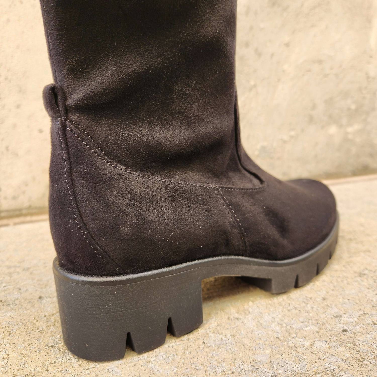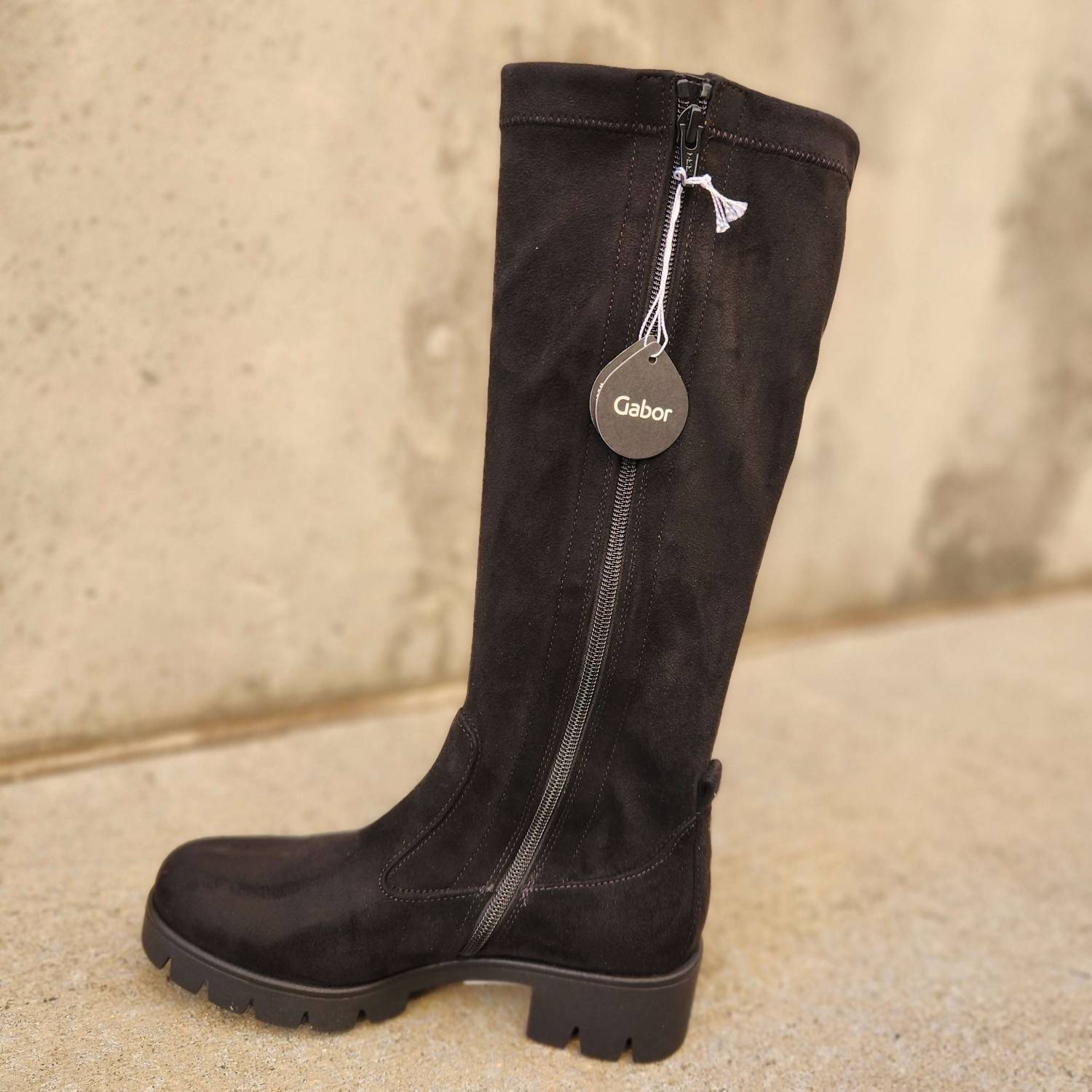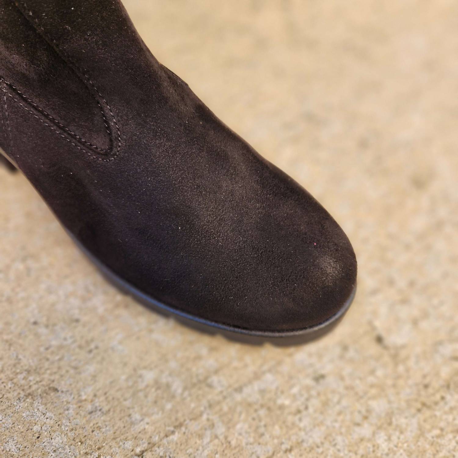 Say hello to the perfect, most versatile boot. The ankle height makes this style easily transition from day to night. Wear them with your favorite skinny jeans and tee for a more laid back look, or pair them with your favorite mini dress and jacket for a night out on the town. Step into the spring season with the Women's Suede High Calf Boots by Gabor, flawlessly crafted from luxurious black suede. Designed with a high calf and block heel, these stylish boots offer a sleek monochrome look, perfect for vacation occasions. The round toe and flexible calf ensure a comfortable and athletic fit, while the removable insole adds versatility for narrow feet. Ideal for adults seeking a chic yet functional footwear option with a mid-heel height of 2 1/4"-3".