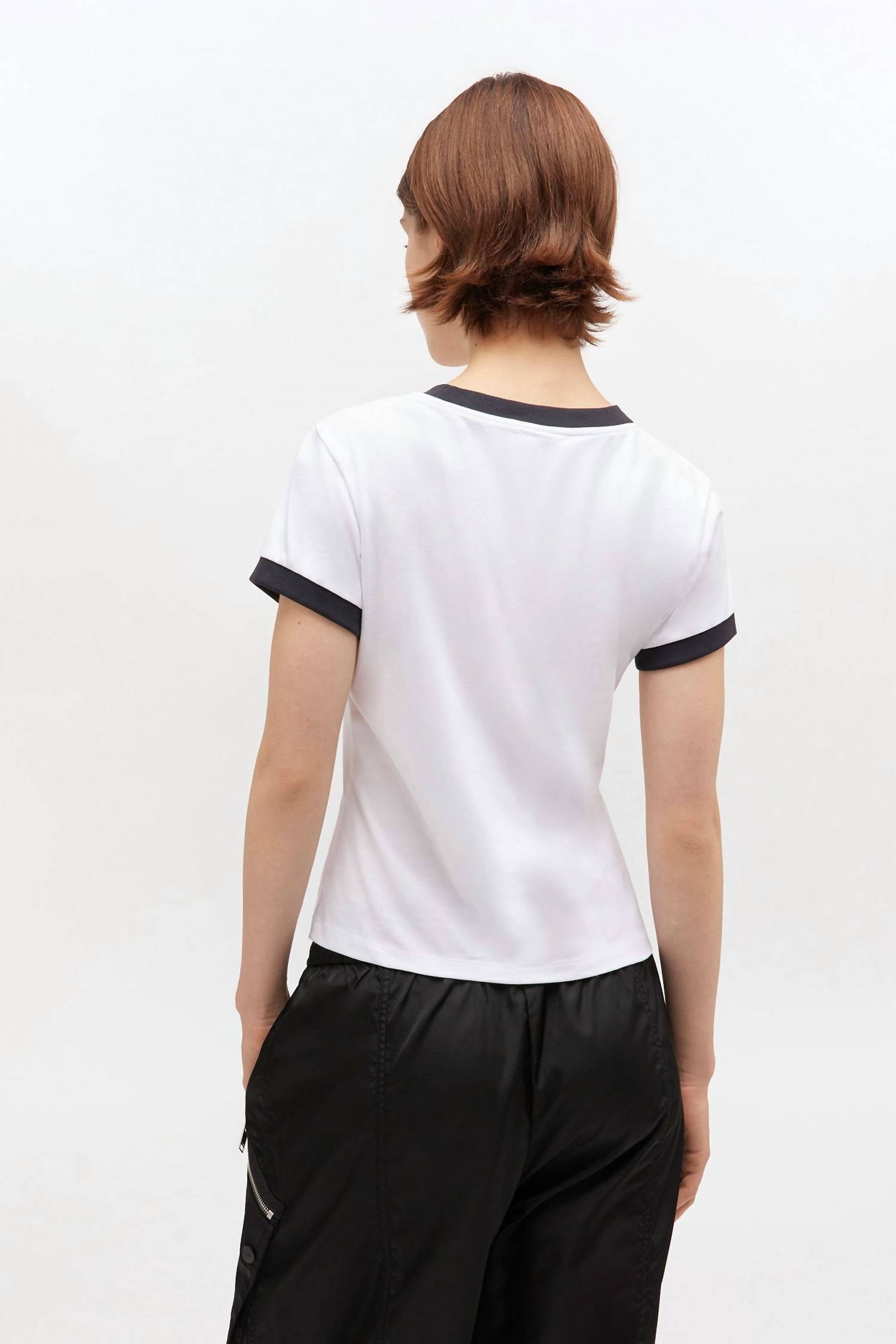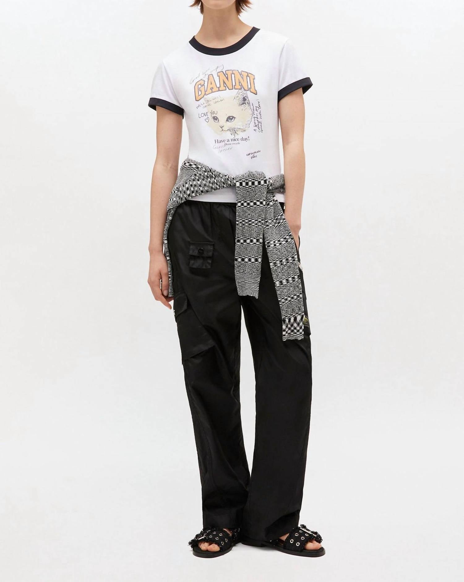 The short sleeve tee you'll want in every color. Introducing the Cropped Kitty T-shirt by GANNI, a sustainable choice for your spring wardrobe. Crafted from 100% organic cotton, this white, short-sleeve tee features a charming cat print graphic alongside a playful 'Have a nice day! Please recycle' message. Designed with a round neckline and pull-on closure for ease of wear, it bears the signature GANNI logo. Made in Portugal with meticulous care, this t-shirt is machine washable and should be laid flat to dry for long-lasting quality.