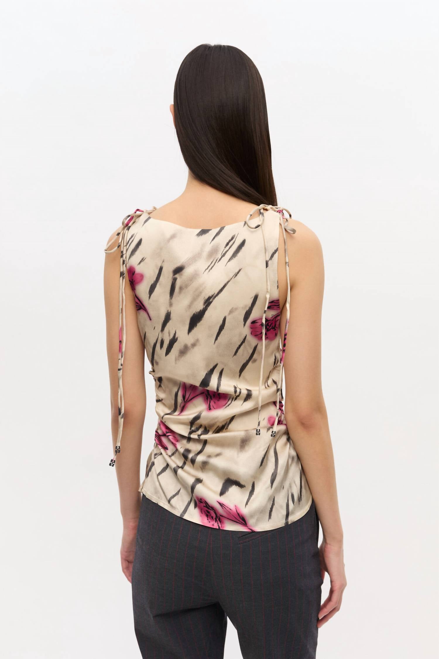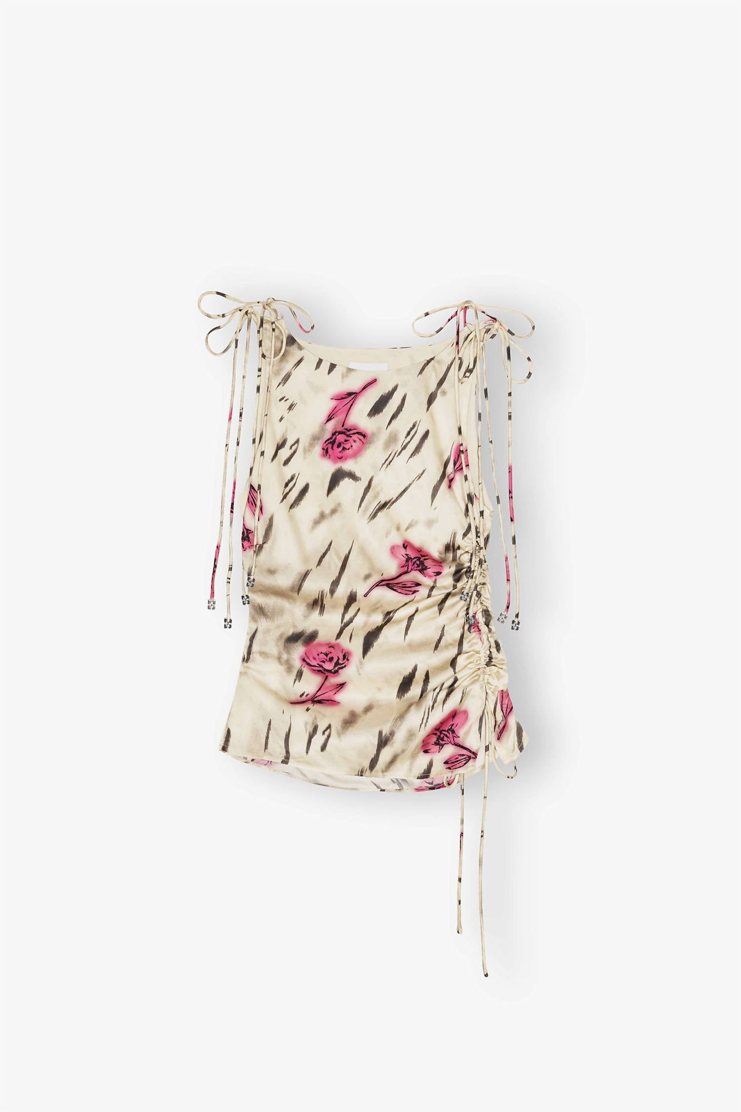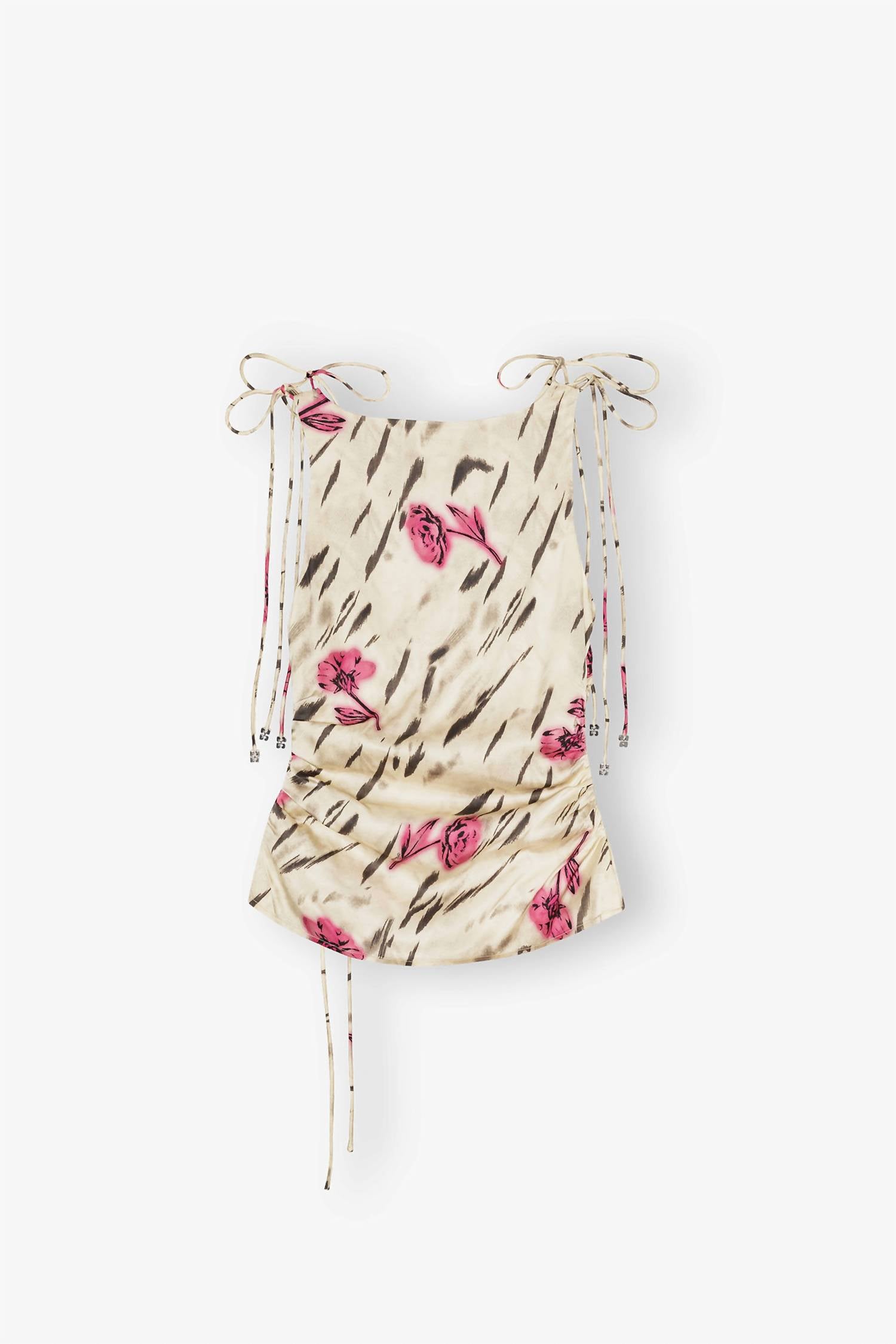 Pair this with your favorite jeans and slides for your next girls night out. Embrace the Boho Chic trend with the Floral Satin Top by GANNI, a sleeveless masterpiece ideal for summer events. Crafted from a luxurious blend of 96% viscose and 4% elastane, this top showcases a stunning multi-color floral print, complete with adjustable shoulder ties and a draped side detail. The blouse, made in China, offers a boatneck design and a pull-on closure for easy elegance. Easy to care for, simply machine wash and line dry to maintain its beauty. Chen is 180 cm and wears a size 36.