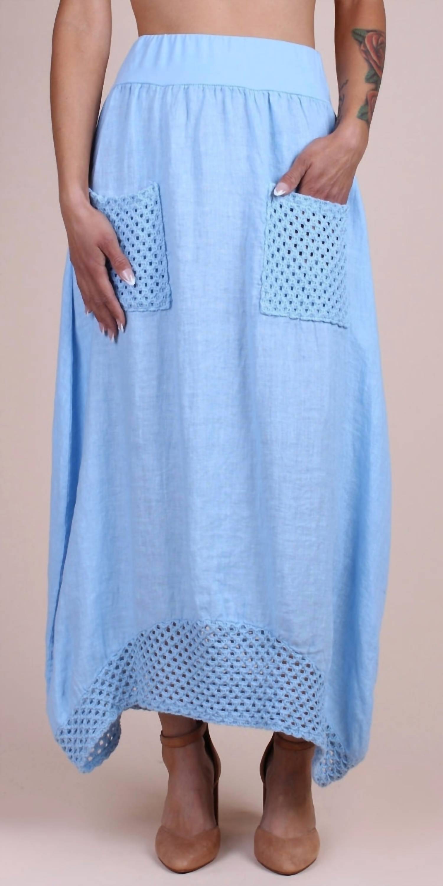 Flowy, comortable and stylish. This maxi skirt is a fan favorite. Discover the Primavera Linen Skirt by GIGI MODA, an embodiment of Italian elegance perfect for a Summer Beach Day. This high-waisted maxi skirt boasts a soft jersey waistband, enhancing comfort and fit, with an open-knit hemline and front pockets adding a stylish touch. Made from 100% linen, it features a convenient pull-on closure, ideal for layering with your favorite tops (13" waistband unstretched, 25" length). Crafted in Italy, it requires hand washing and should be laid flat to dry for lasting durability. Model is 5'7".