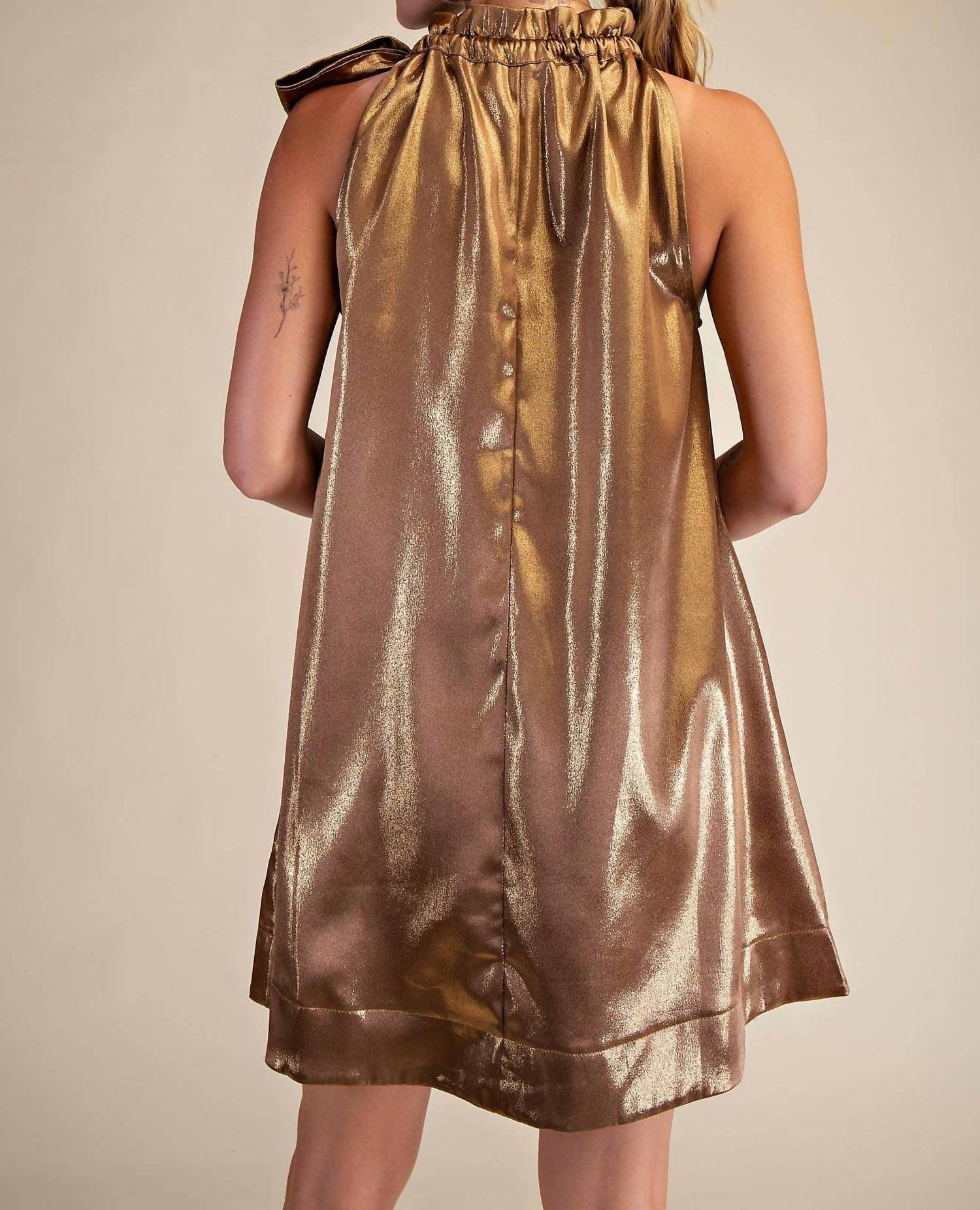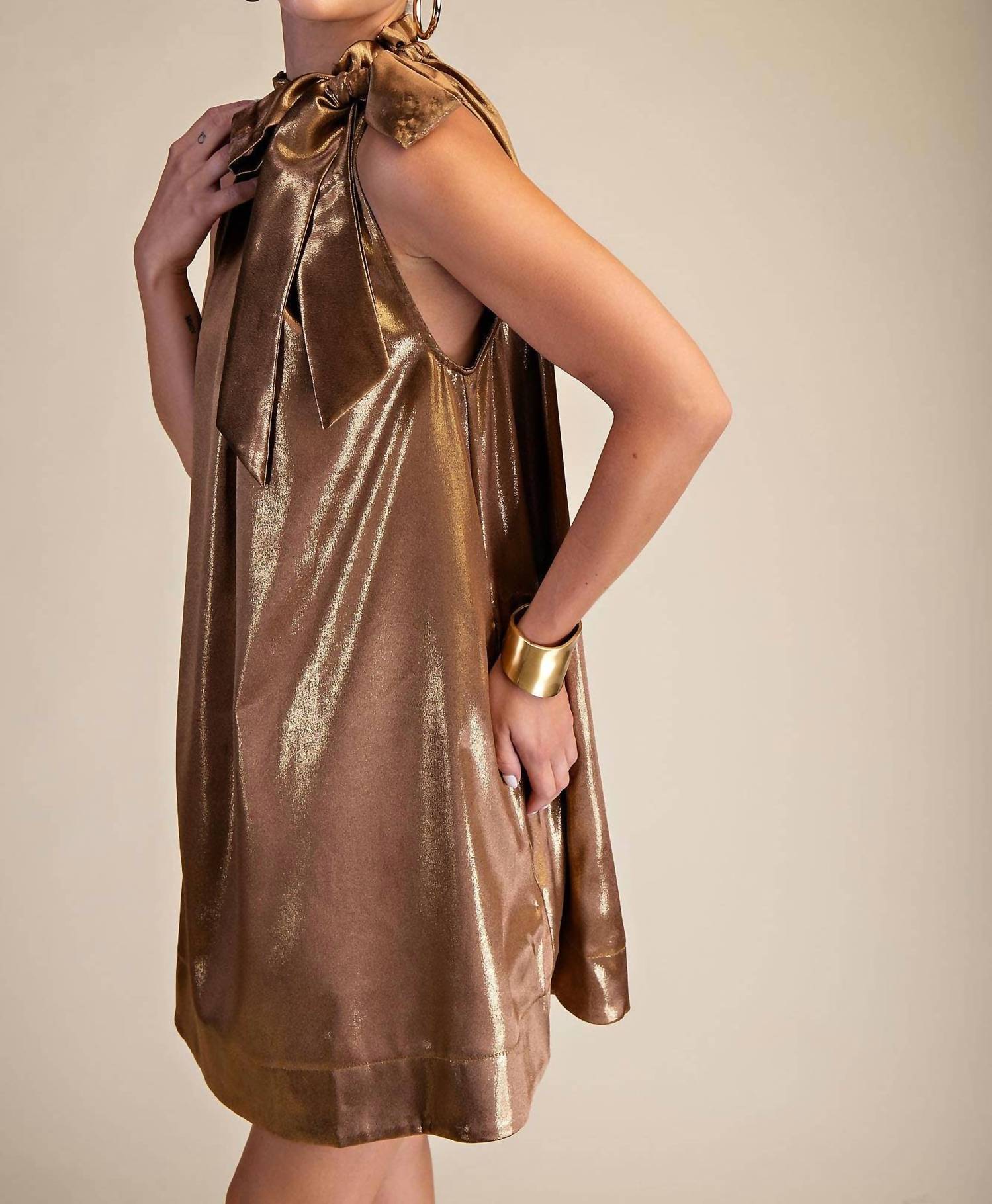 The kind of easy and flattering dress you'll be reaching for all season long. Elevate your holiday party wardrobe with the GLAM Mock Neck Tie Sleeveless Mini Dress in a striking solid gold hue. This A-line silhouette dress features a polished mock neck and comfortable sleeveless design, perfect for a Quiet Luxury statement during Valentine's Day celebrations. Designed without pockets for a sleek look, it includes a tie closure for an adjustable fit. Care for this elegant piece by hand washing and laying it flat to dry, ensuring it remains a standout in your spring closet.