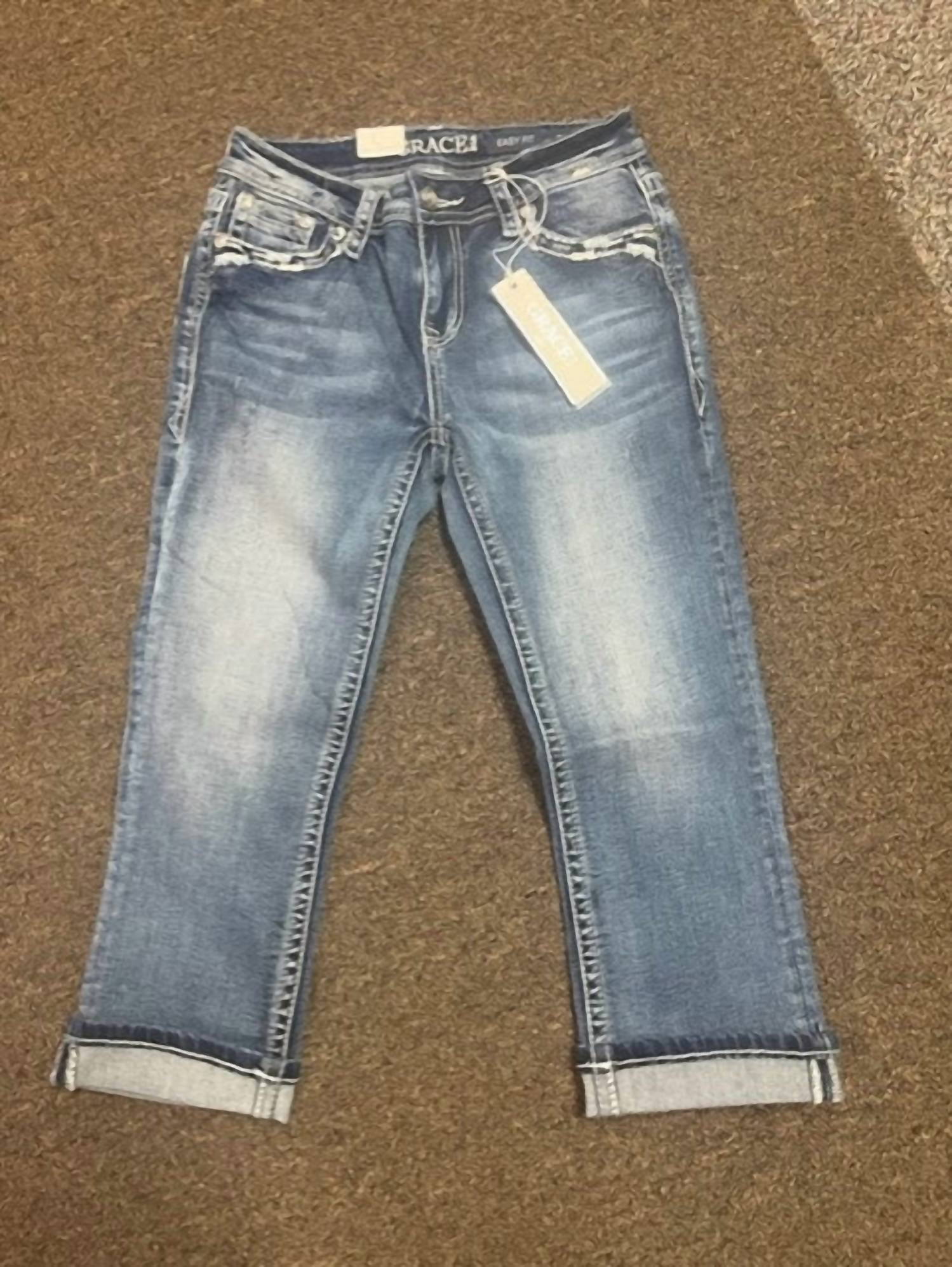 Comfortable and stylish, we love this cropped jean for all of the obvious reasons. Discover the Women's Faux Flap Pocket Capri Jean by Grace in LA, offering an easy, classic fit in a versatile medium wash. Crafted from a cotton blend featuring 64% cotton, 35% polyester, and 1% elastane, these jeans showcase a straight leg design with faux flap pockets. Closure: Button closure. Care: Machine wash.