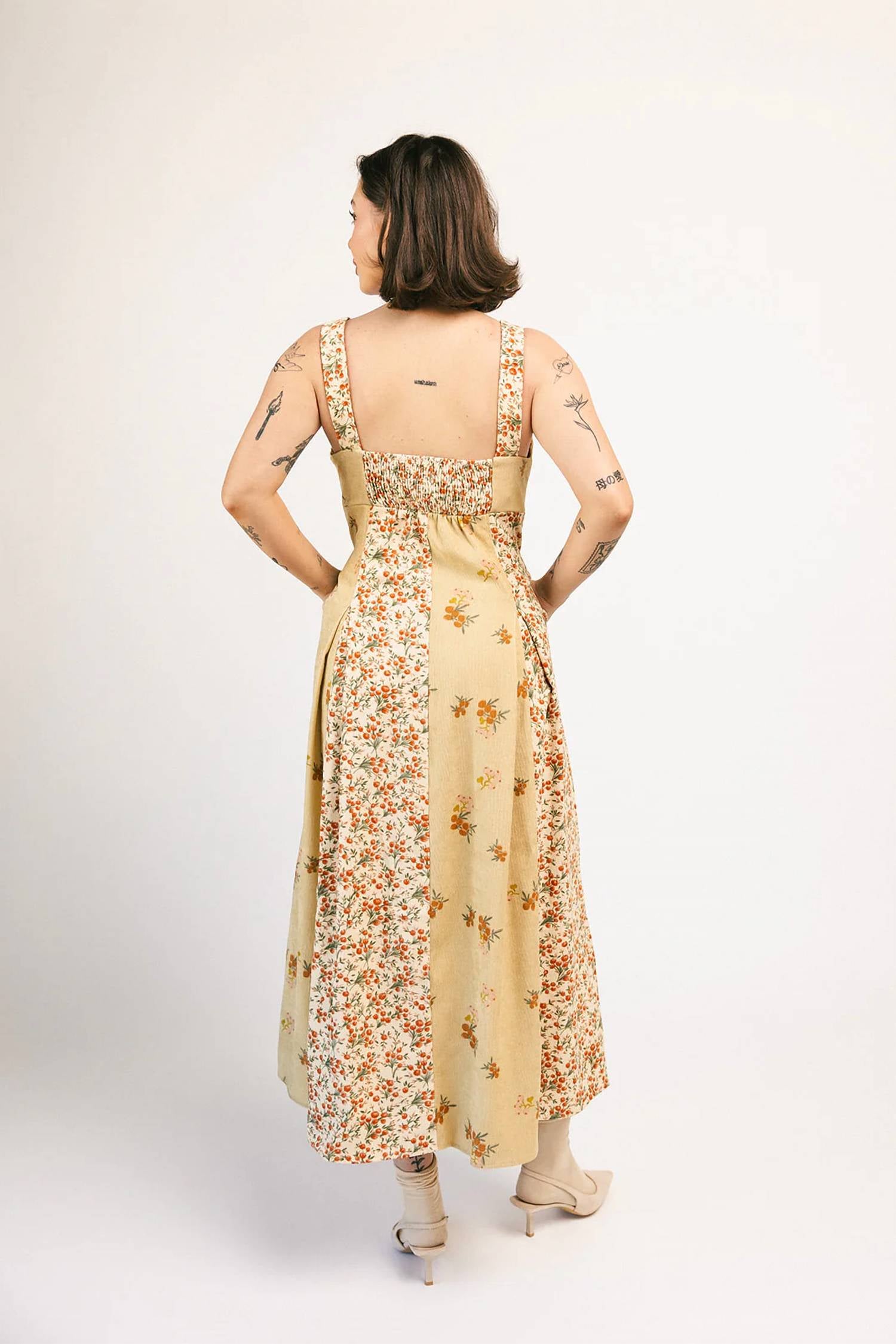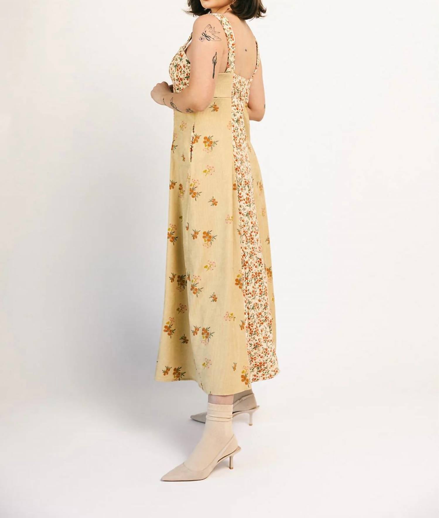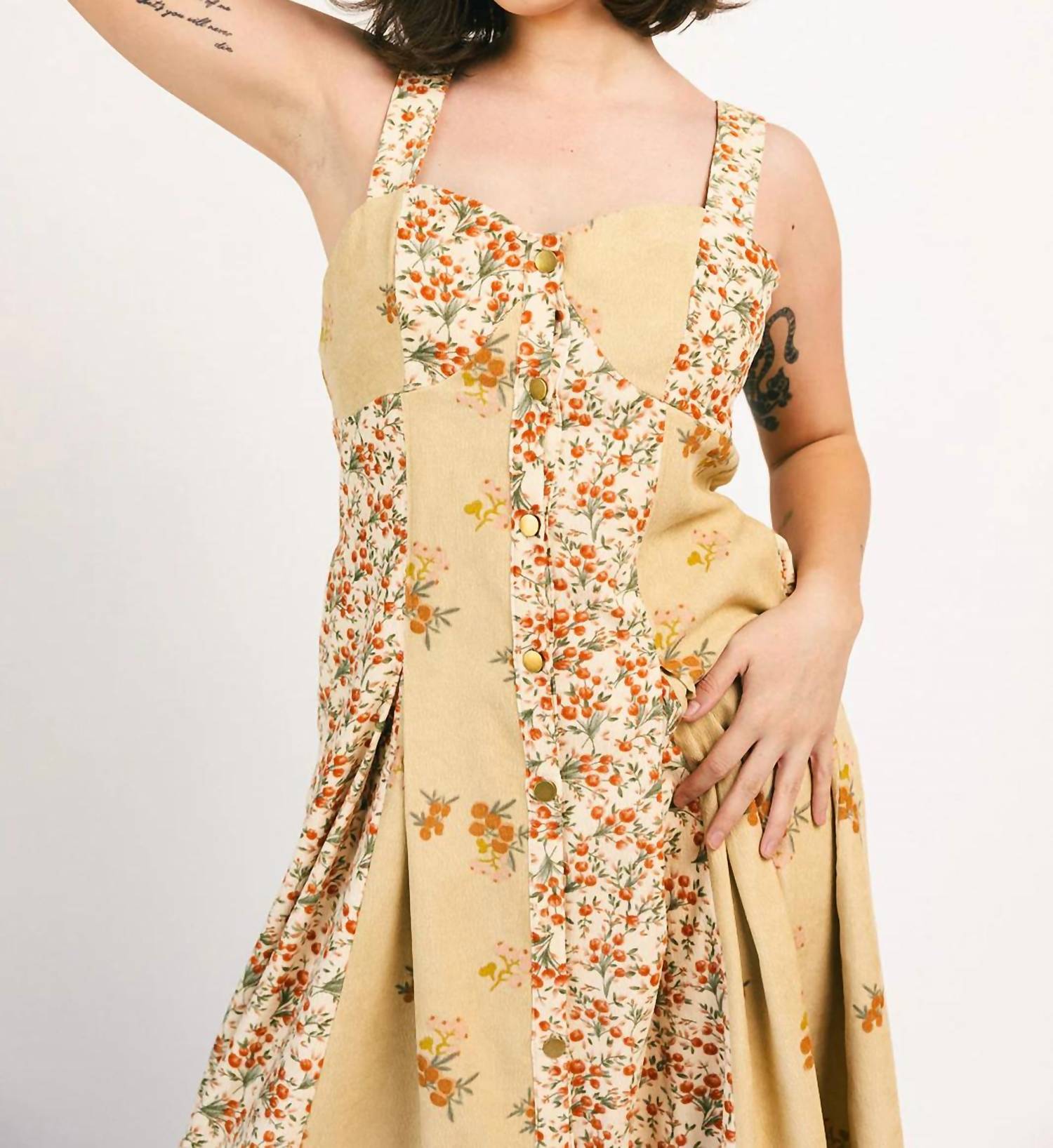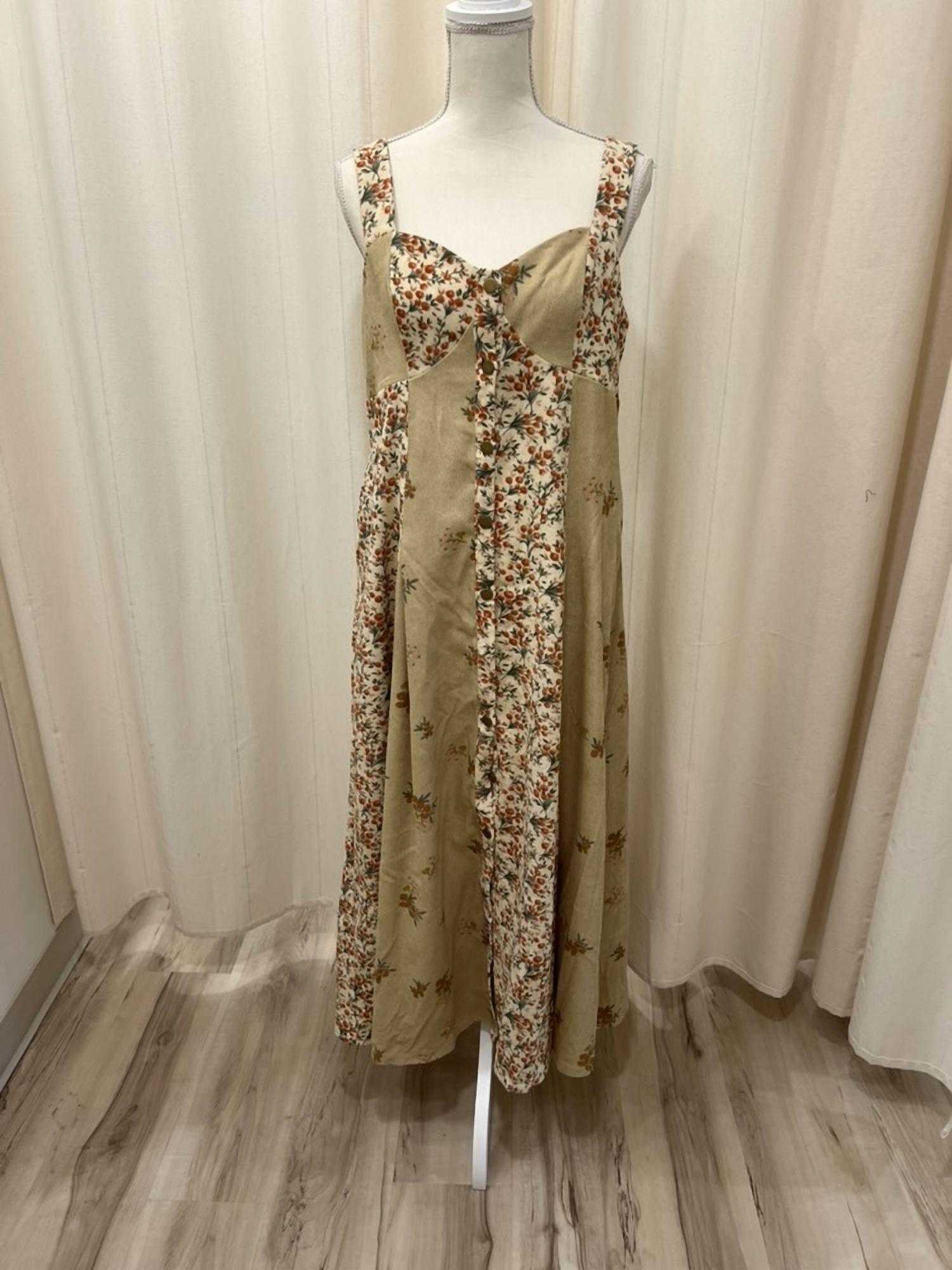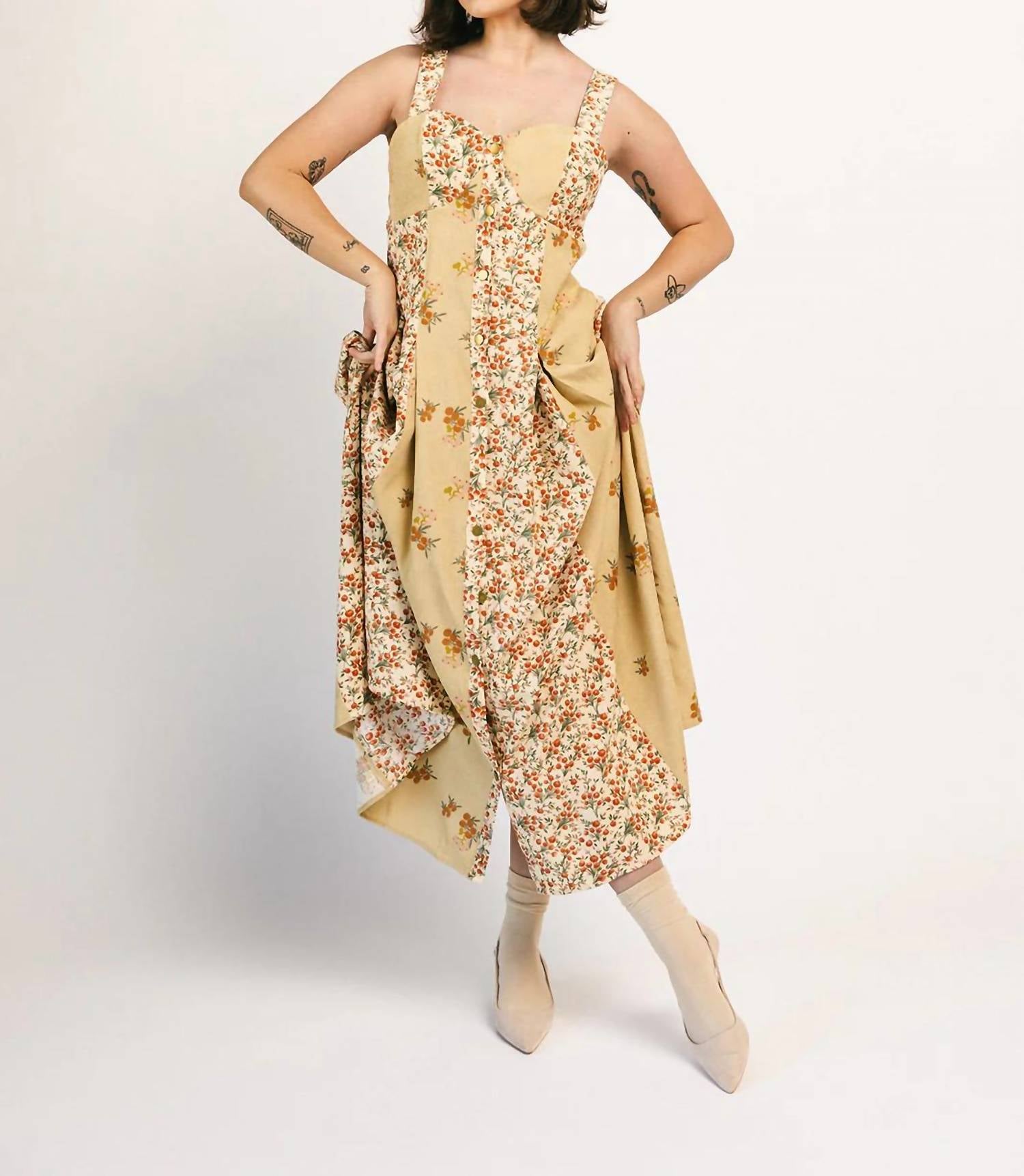 A midi dress so versatile, your options for wearing it are endless. Embrace timeless elegance with the Floral Corduroy Midi Dress by Heyson, crafted for your summer getaways. This sleeveless piece combines soft corduroy with a delightful mix of floral prints, and features a figure-enhancing fit-and-flare silhouette. The dress includes a button closure, practical pockets, and a smocked back for added comfort. Material: Combination of polyester and spandex.
