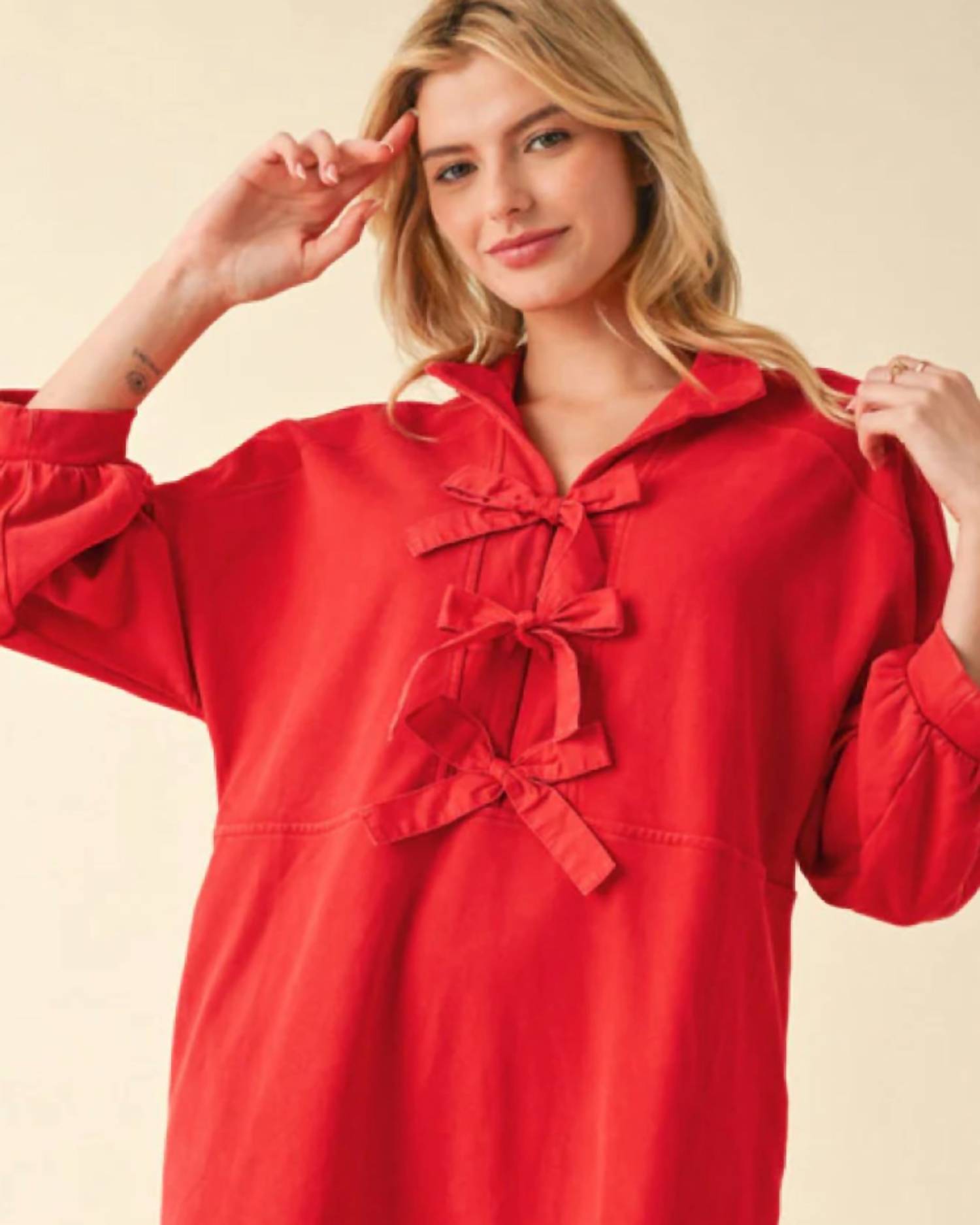 The perfect mini dress for those warmer months. Meet the Bow Mini Dress by Jodifl, a chic addition to your summer wardrobe in vibrant red. Featuring three-quarter dolman sleeves and crafted from an 80% cotton and 20% polyester blend for a lightweight, non-sheer feel. Designed with a stylish open collared neck and practical side pockets, this dress closes with elegant bow ties. Easy to care for with machine wash instructions and line dry.