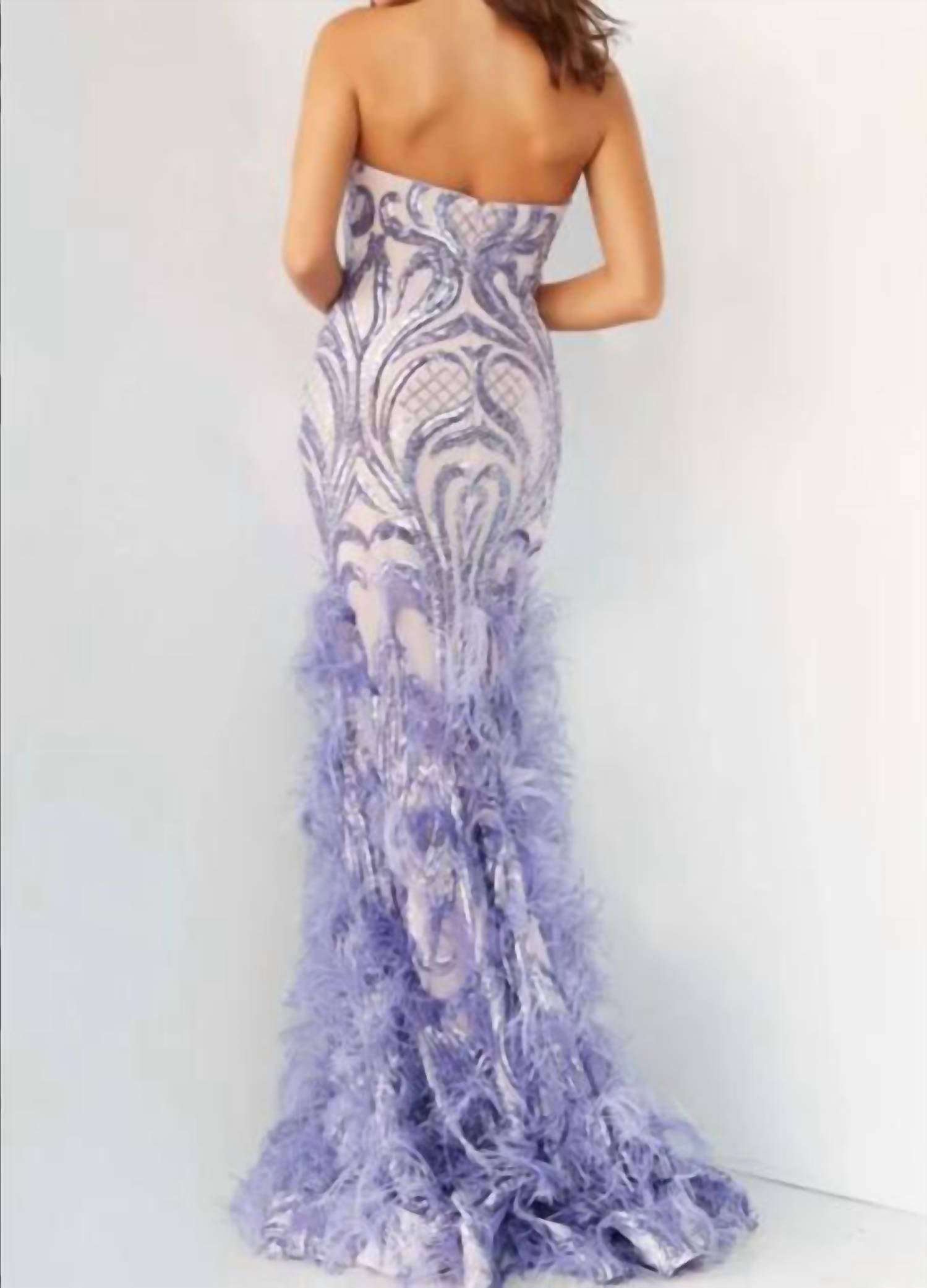 Just add a cute little clutch and a matching heel for the perfect event look. Introducing the Sweetheart Strapless Feathered Dress by JOVANI, an exquisite choice for any special occasion. This lavender dress features a chic strapless design and a stunning sweetheart neckline, perfect for making a statement at prom. Crafted with a textured pattern, this elegant sheath silhouette offers a refined quiet luxury. Closure: Zip closure. Care: Dry clean only.